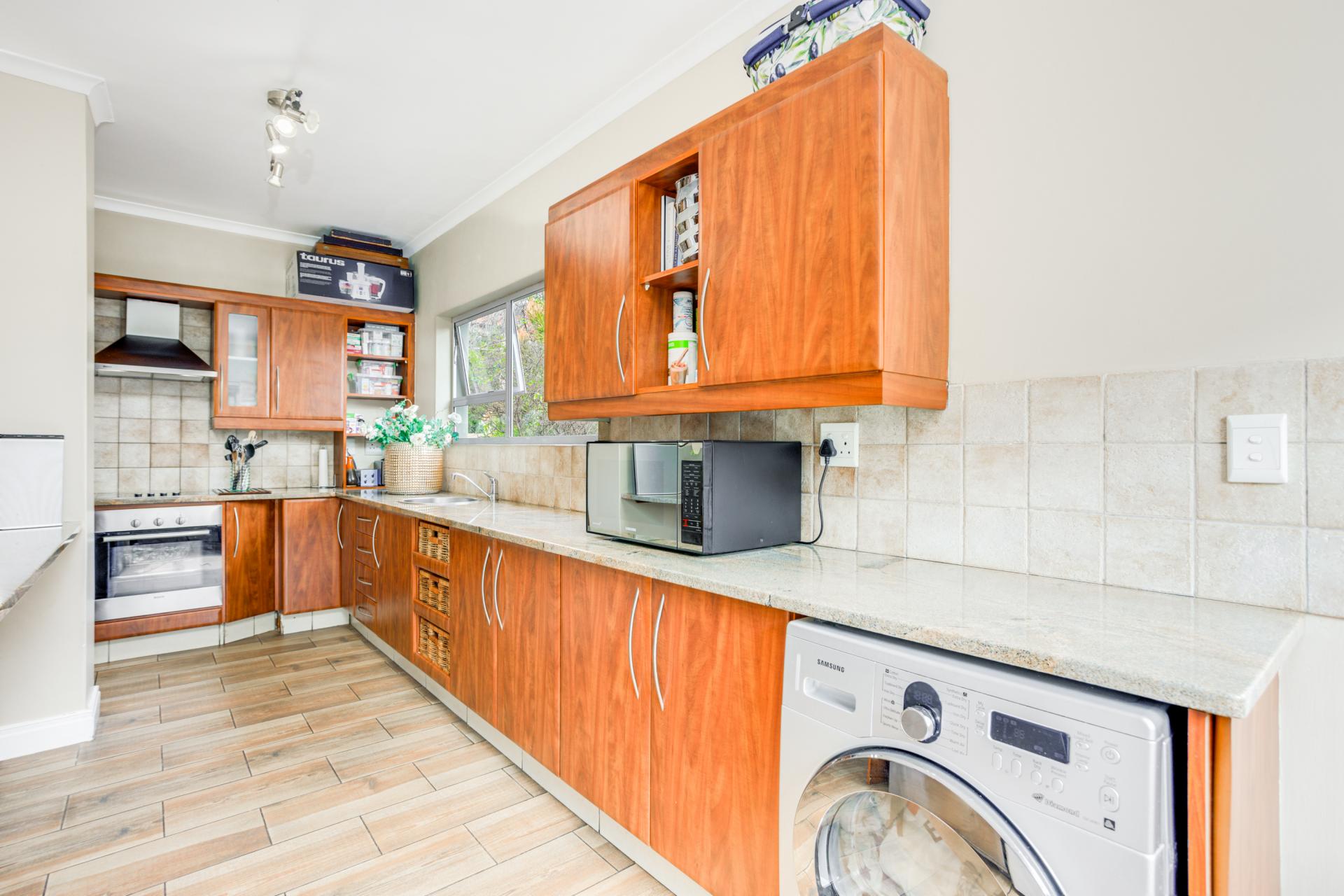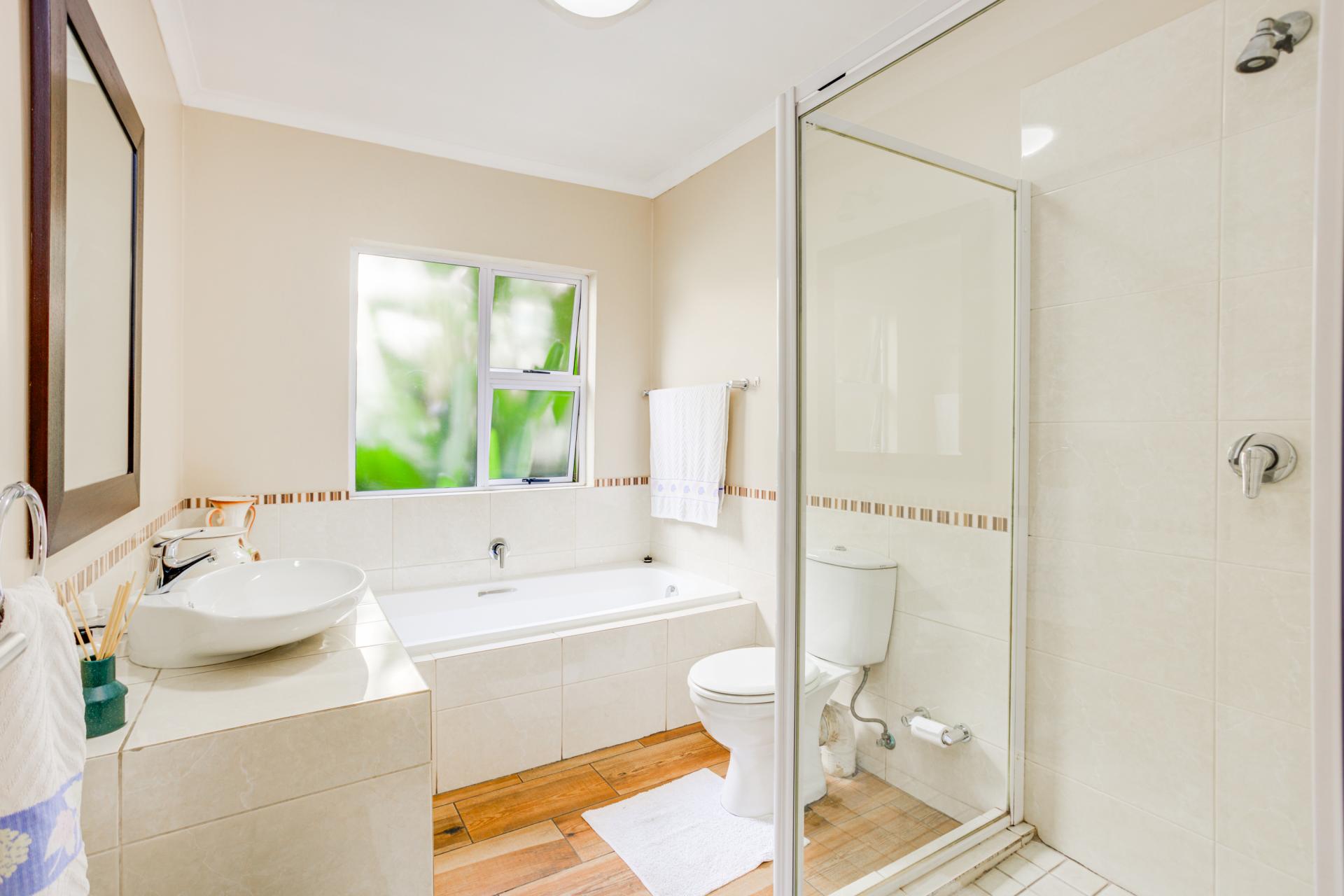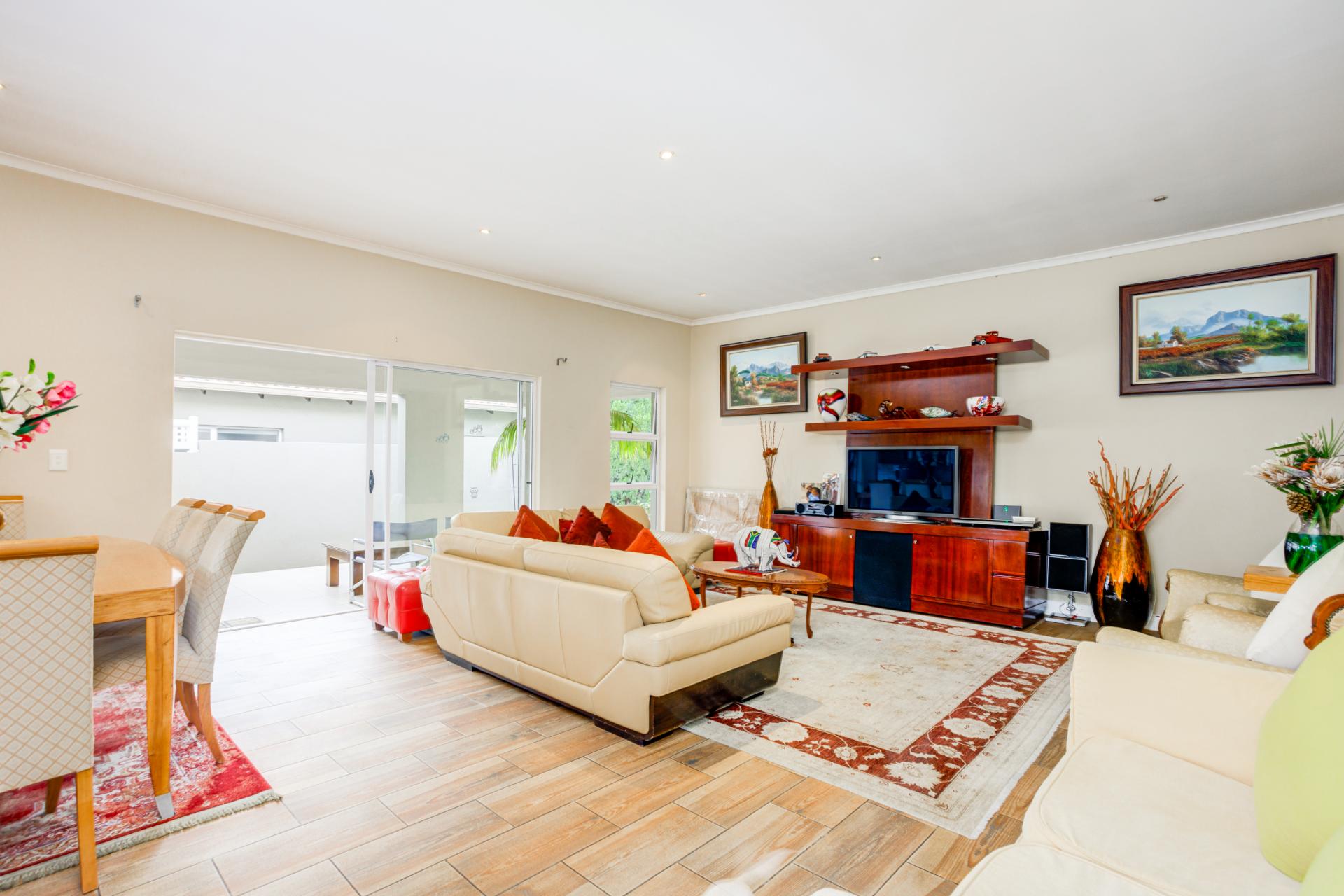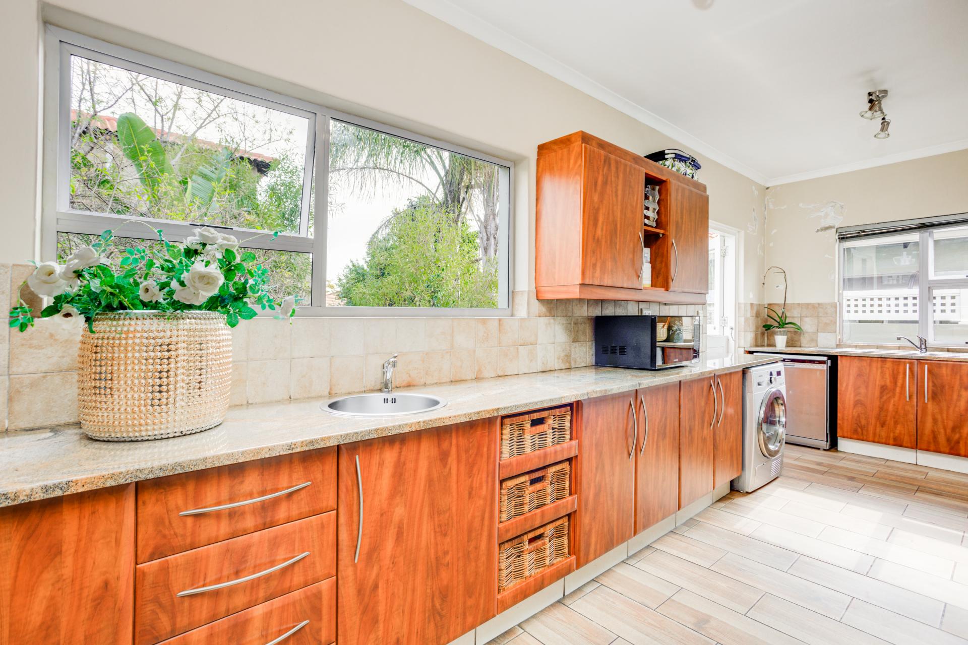 You’ll find three sunny, well-appointed bedrooms, all with built-in cupboards. The main bedroom is en-suite and features an aluminium door opening directly onto the garden – your own private escape. Two sleek bathrooms, tiled floors throughout, aluminium window frames, and high-end finishes add a touch of luxury to everyday living.