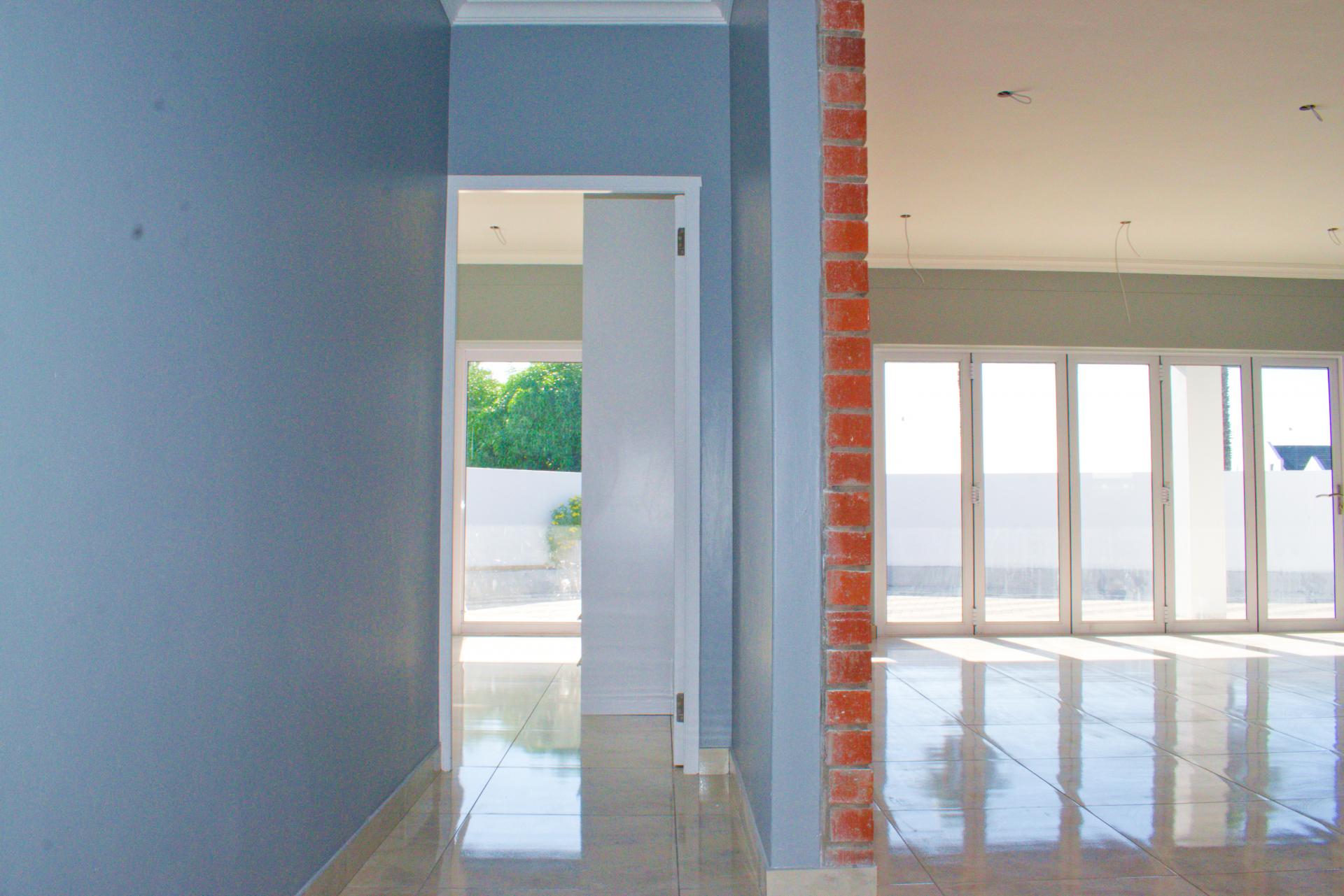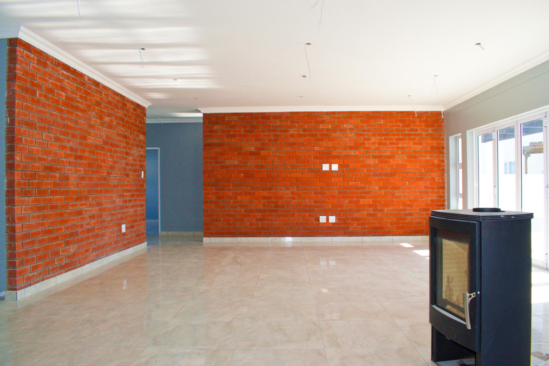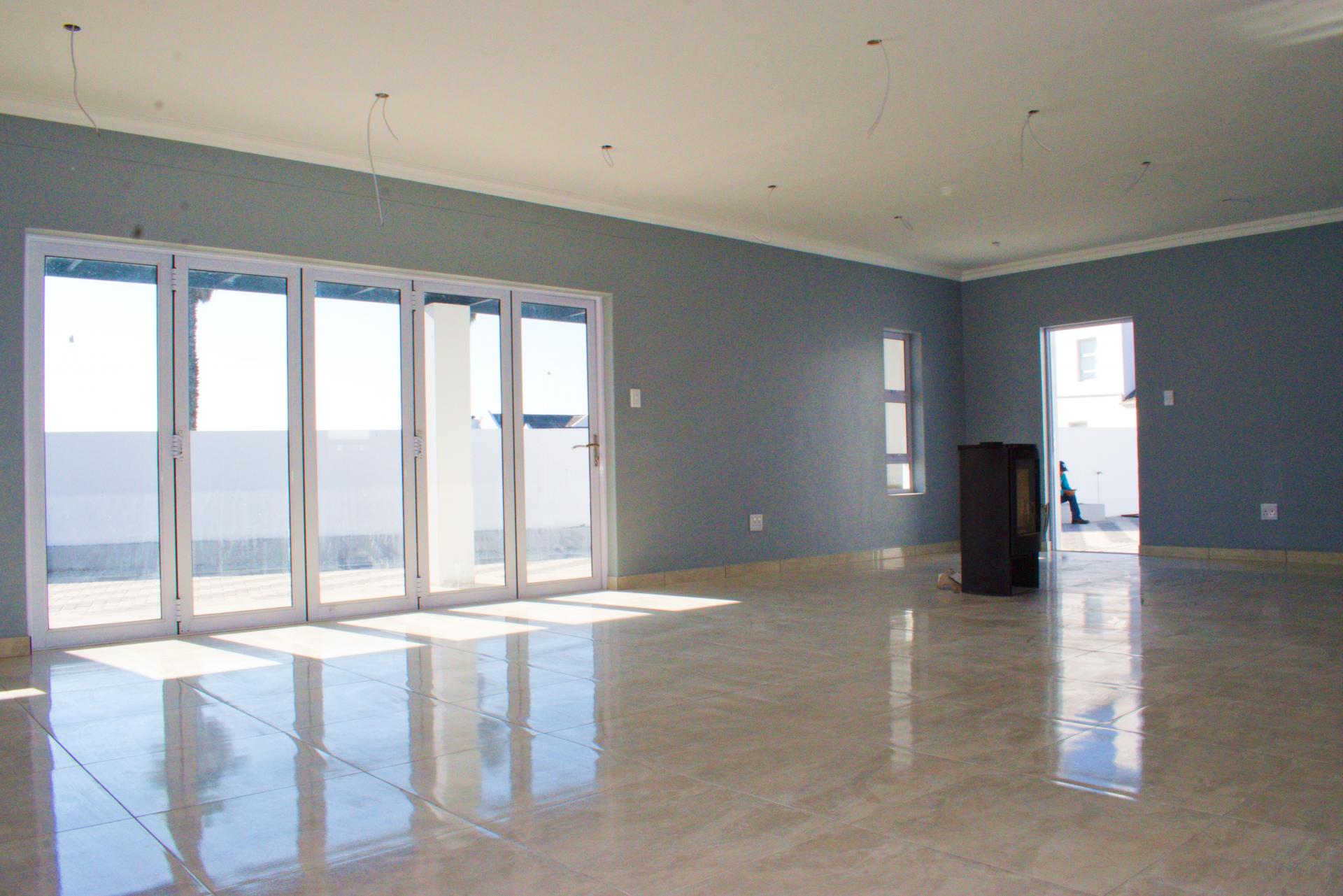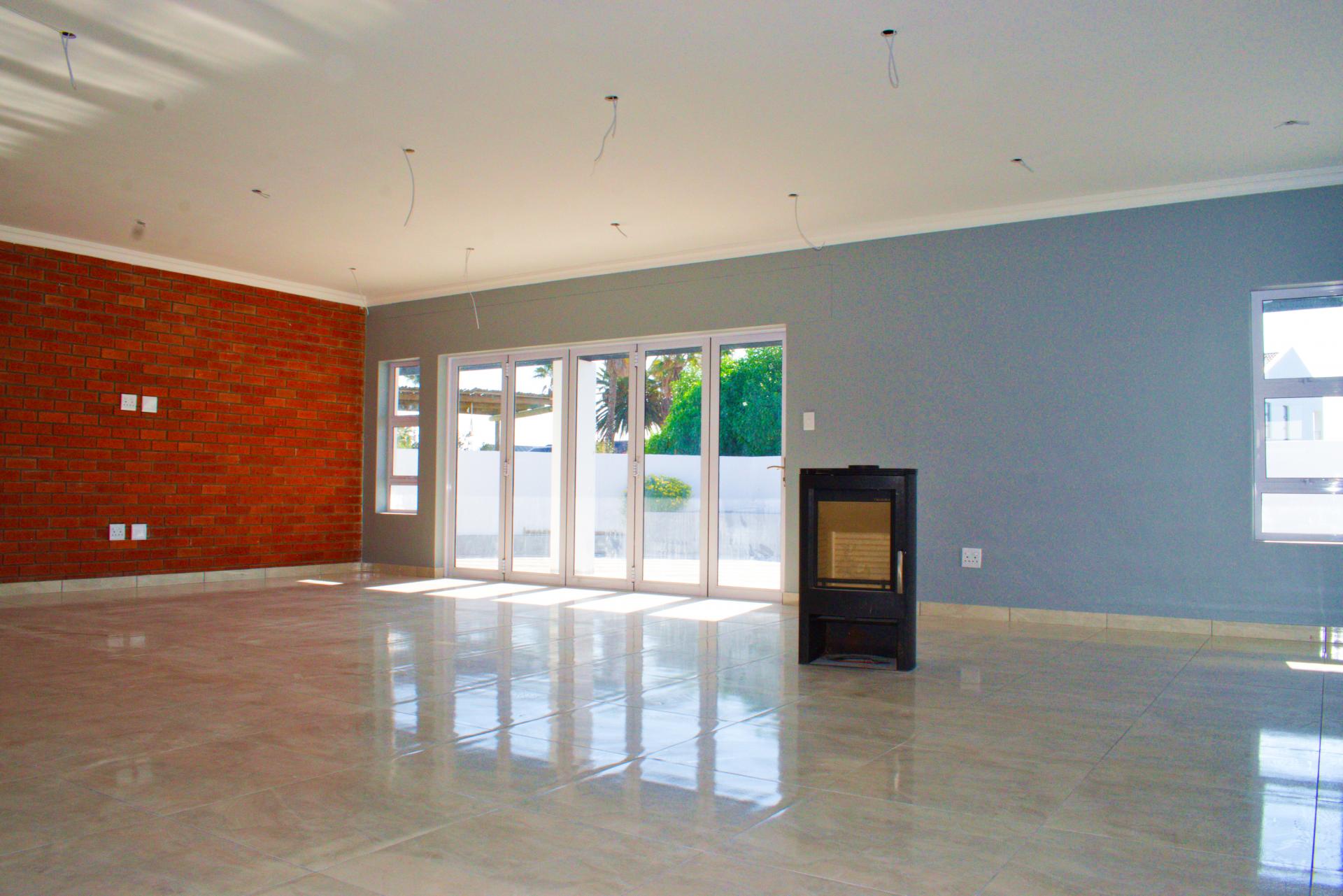 The spacious open-plan living area features glass sliding doors that lead out to a large covered patio with a built-in braai – perfect for indoor-outdoor entertaining.
