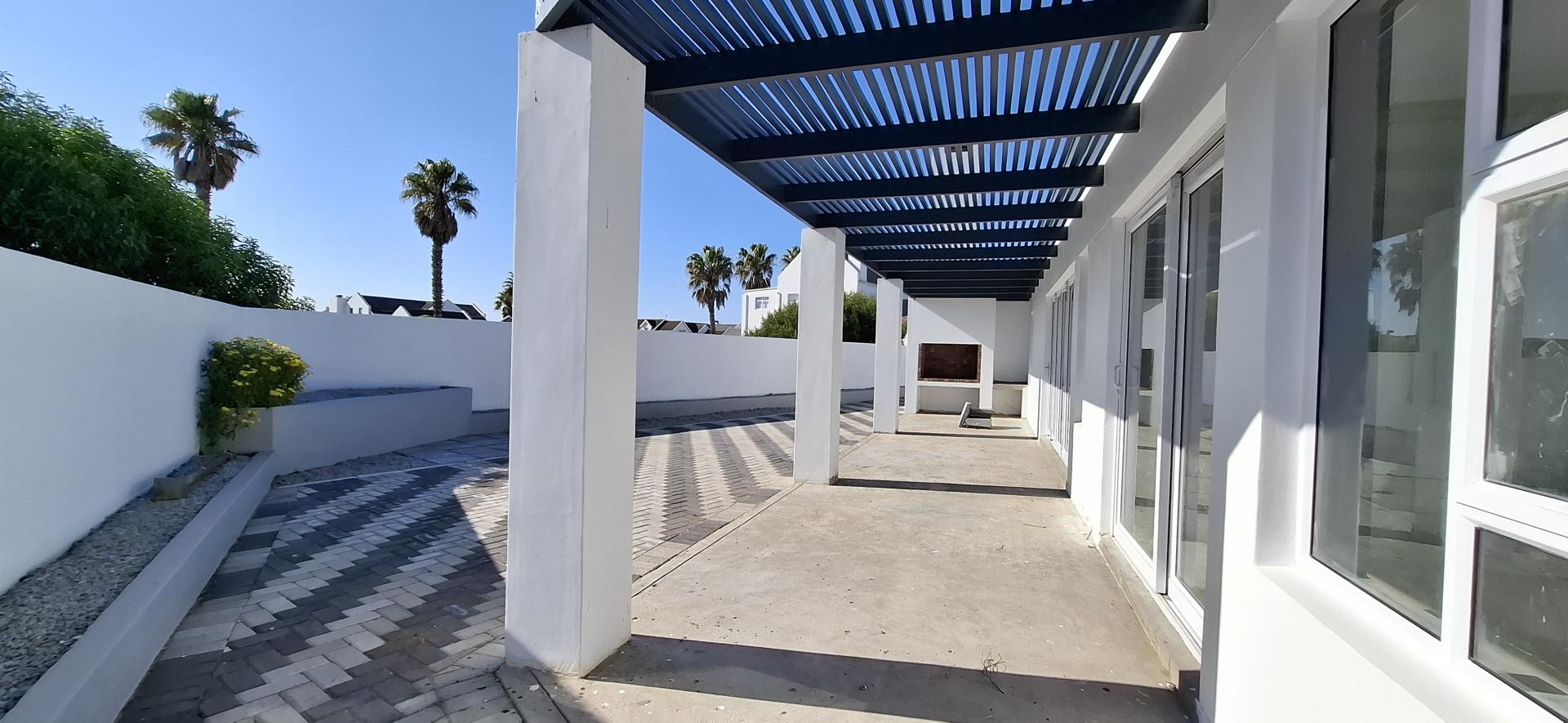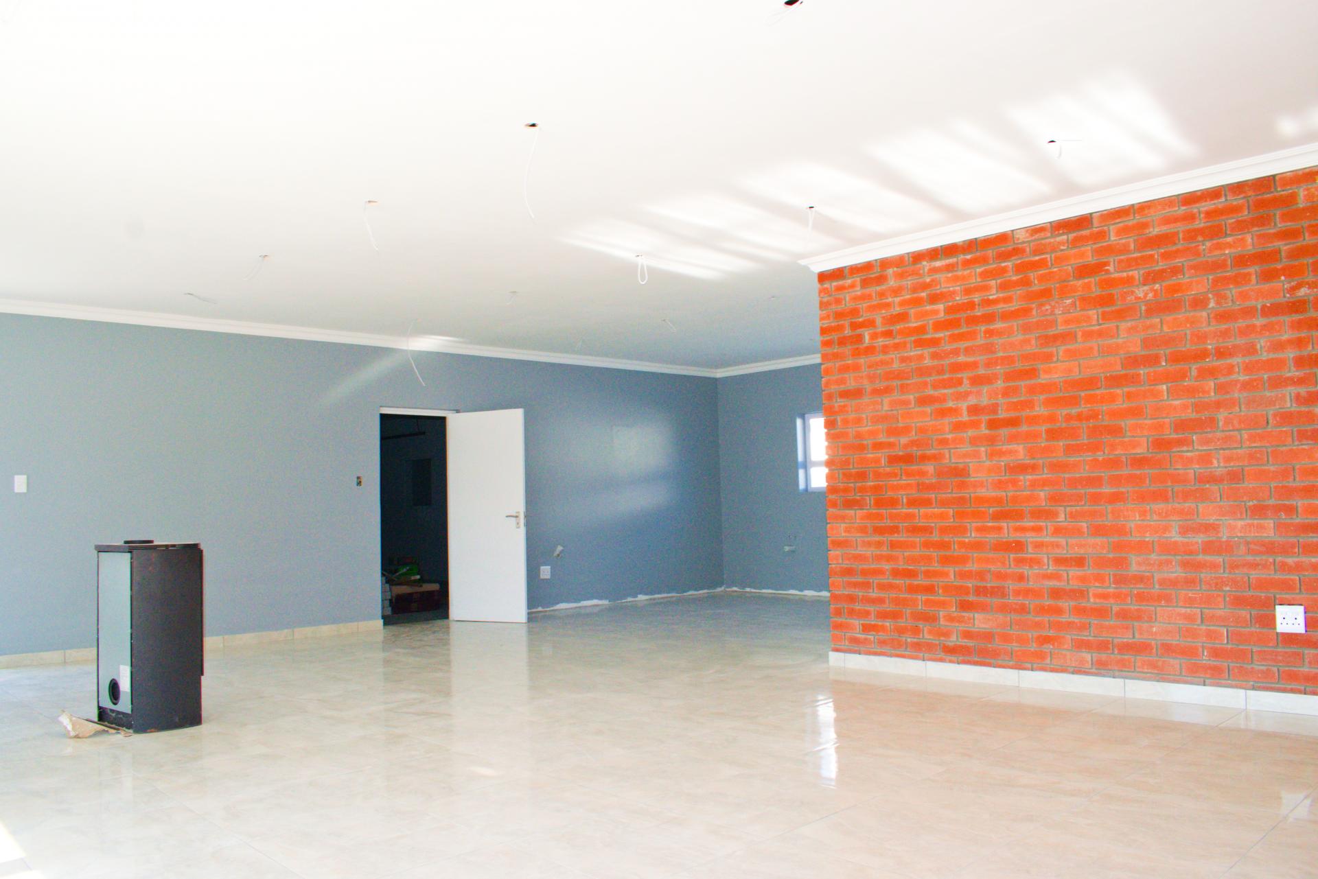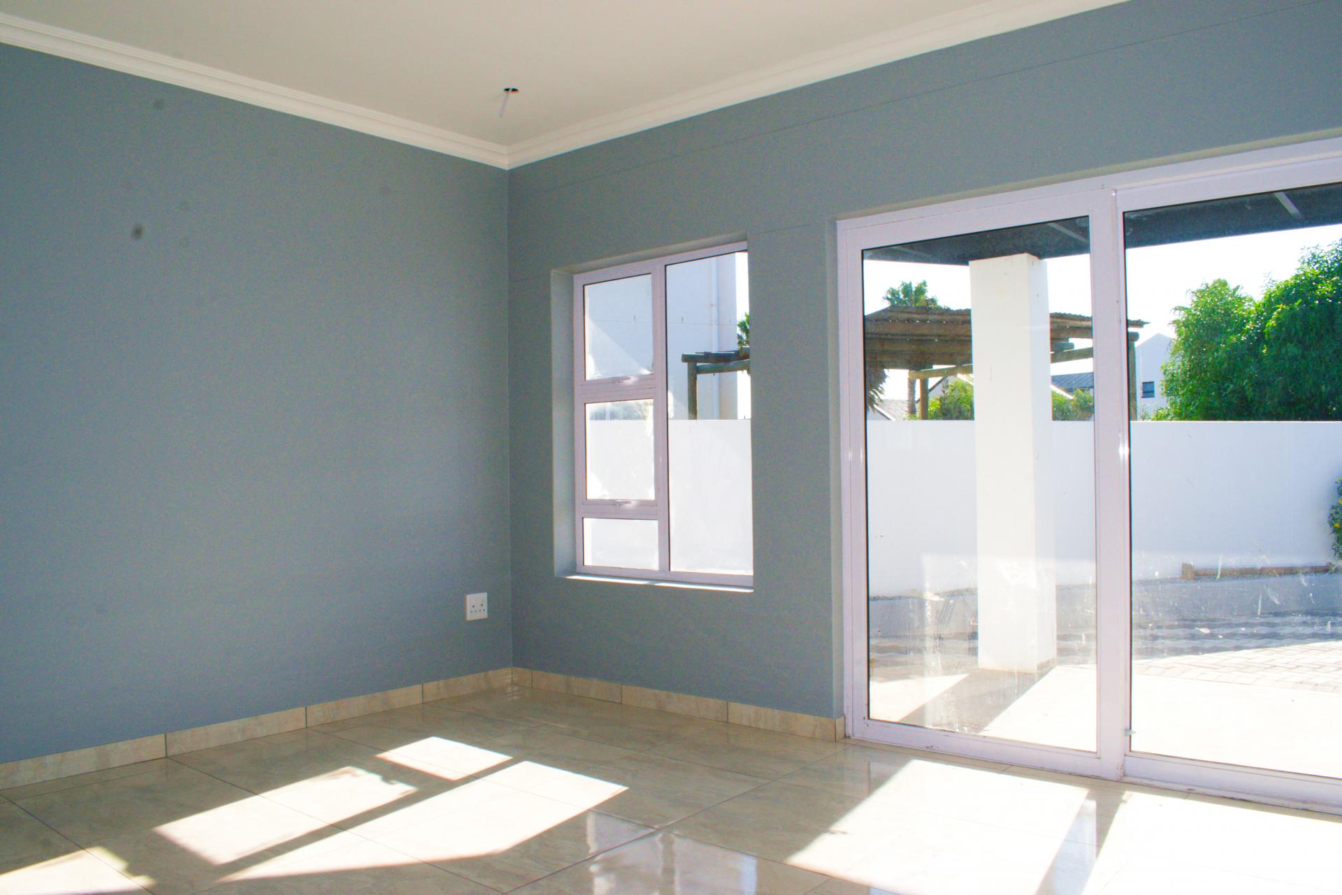 The spacious open-plan living area features glass sliding doors that lead out to a large covered patio with a built-in braai – perfect for indoor-outdoor entertaining.