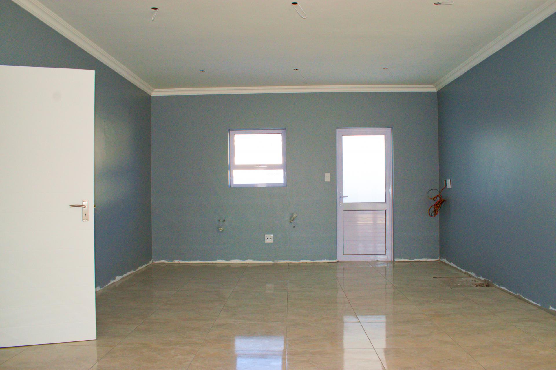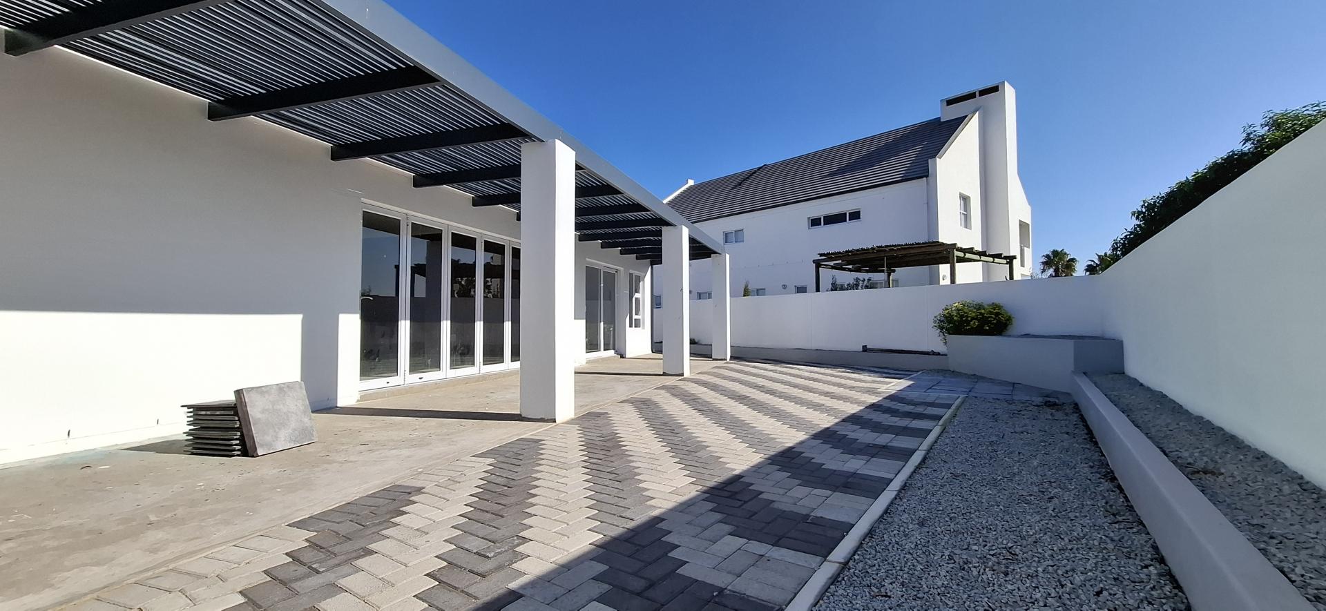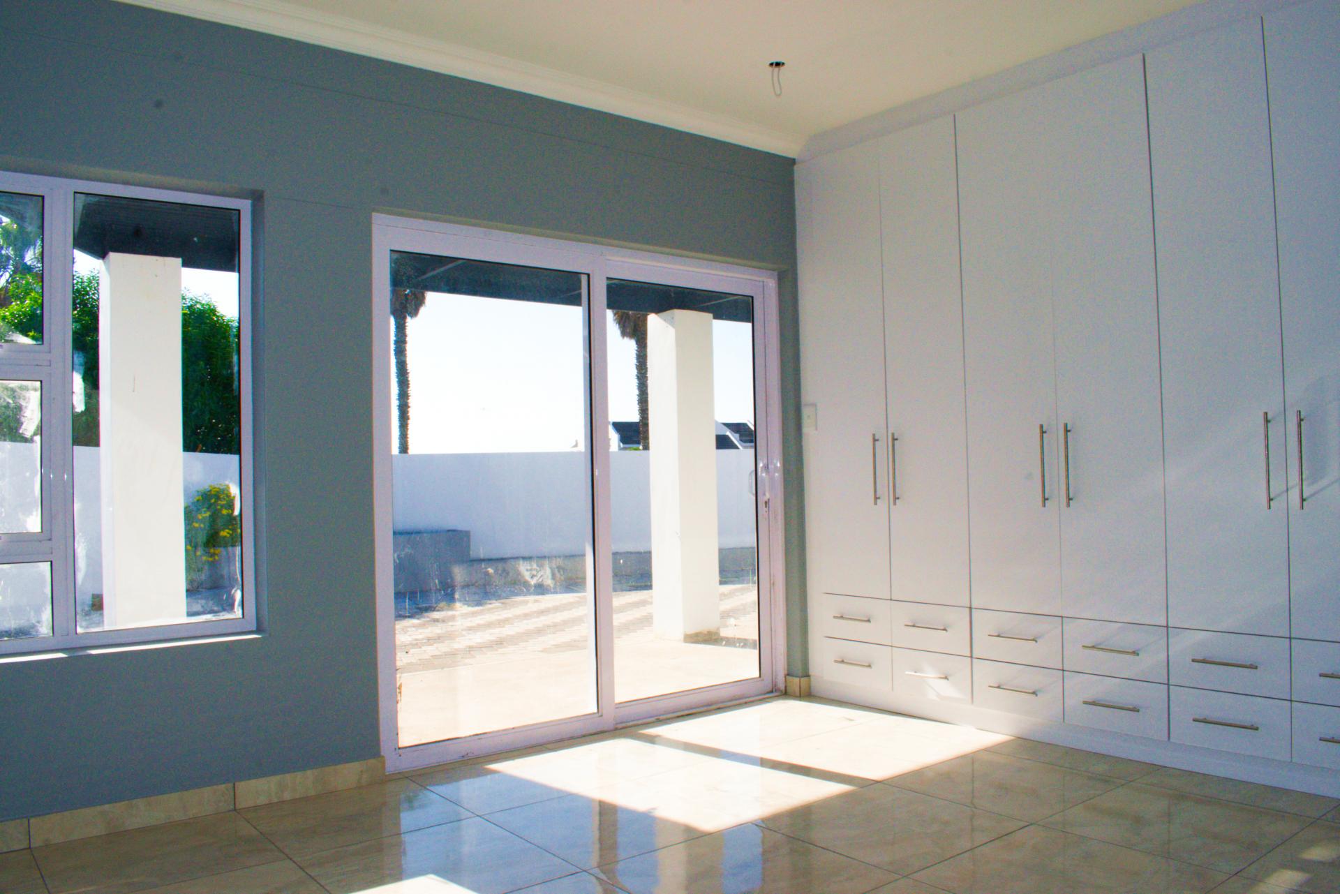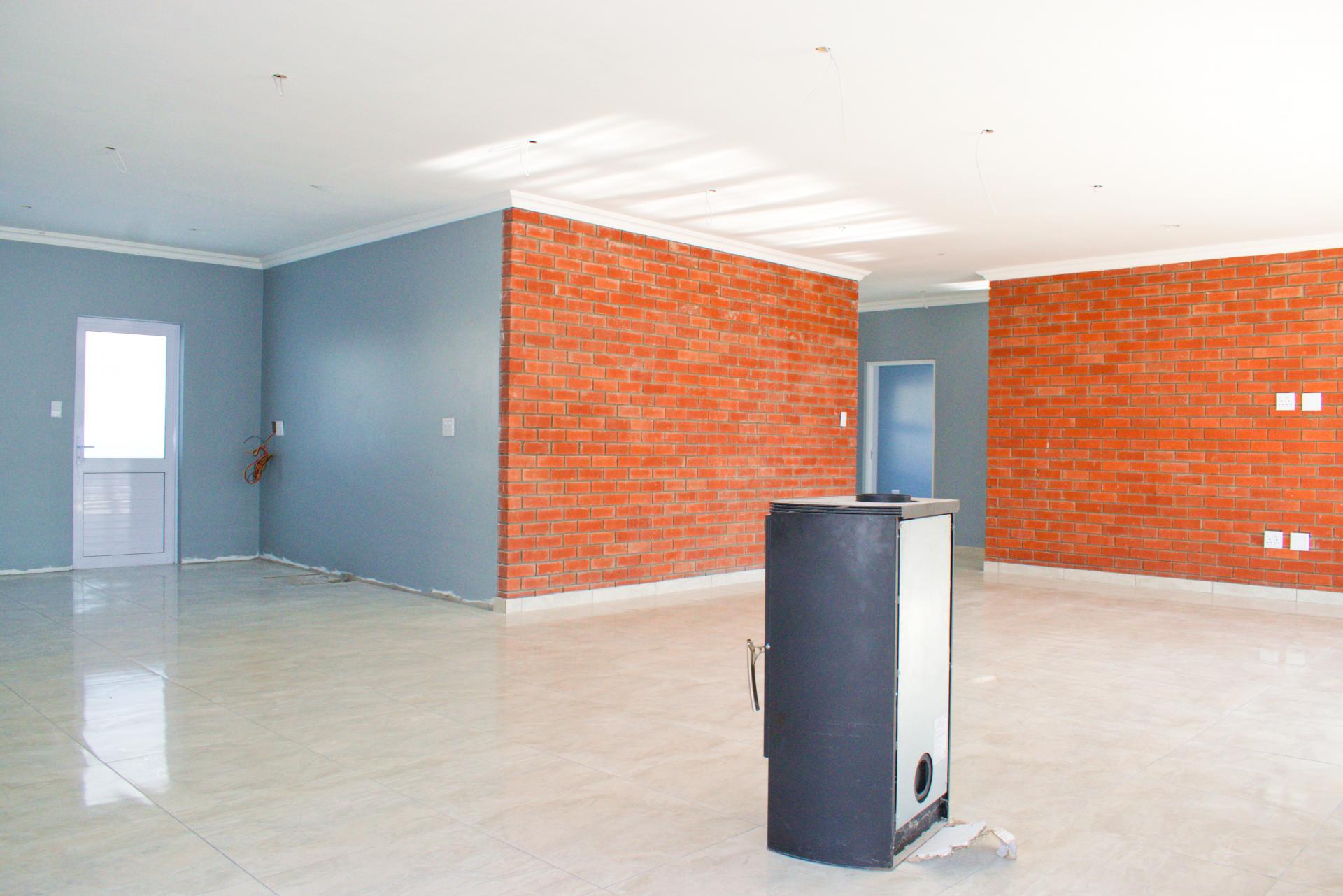 The spacious open-plan living area features glass sliding doors that lead out to a large covered patio with a built-in braai – perfect for indoor-outdoor entertaining.
