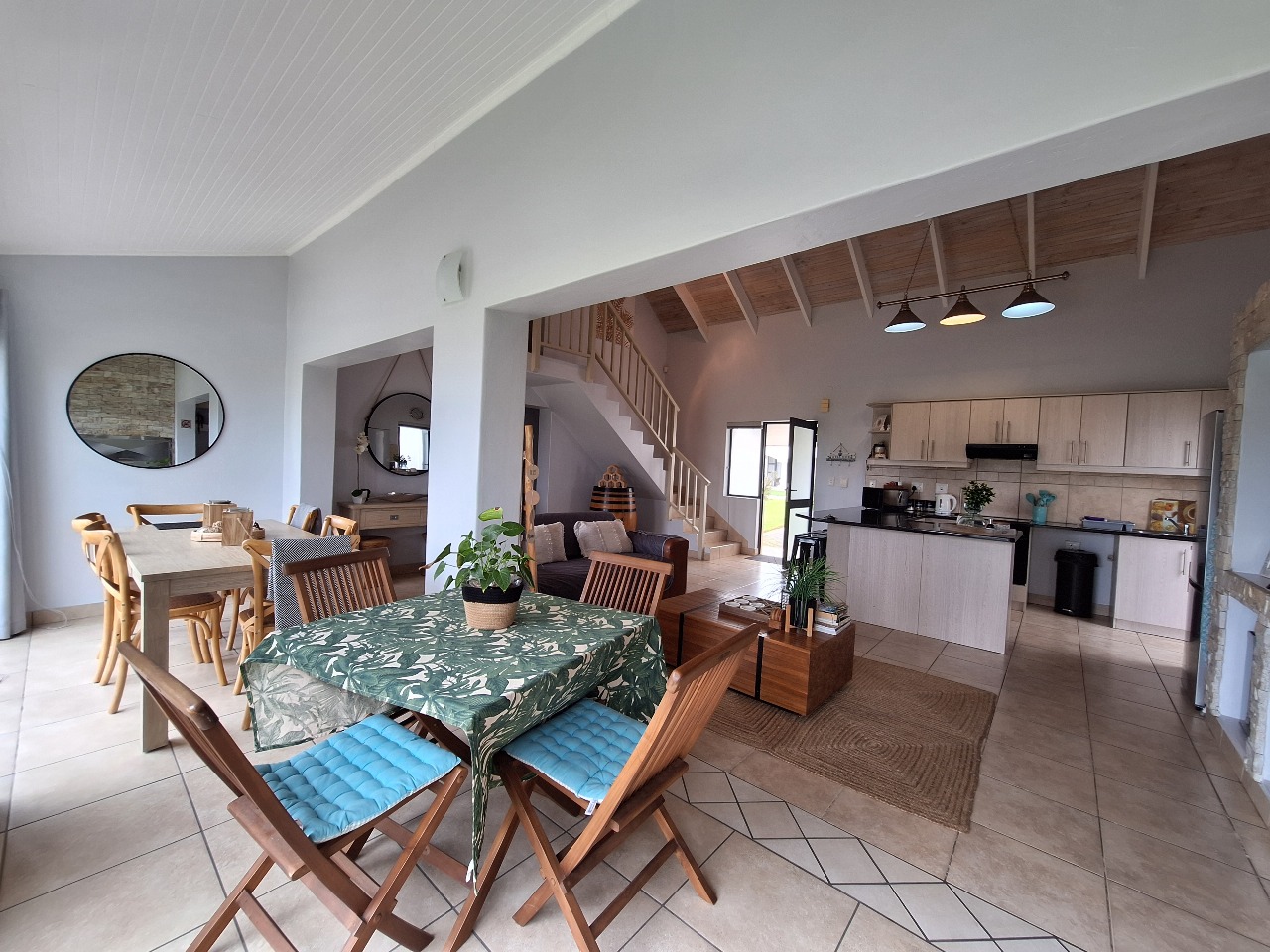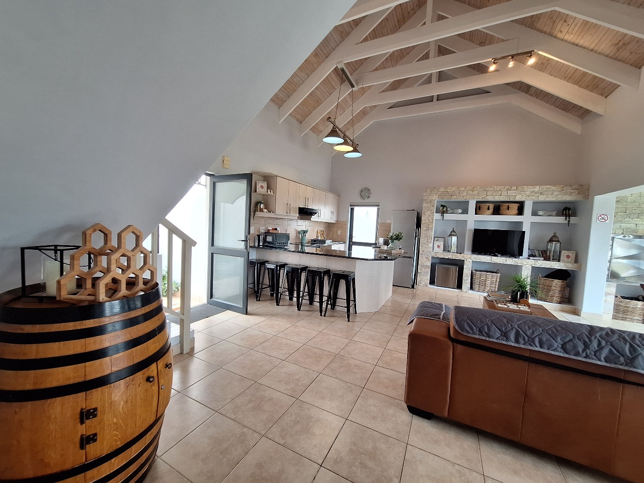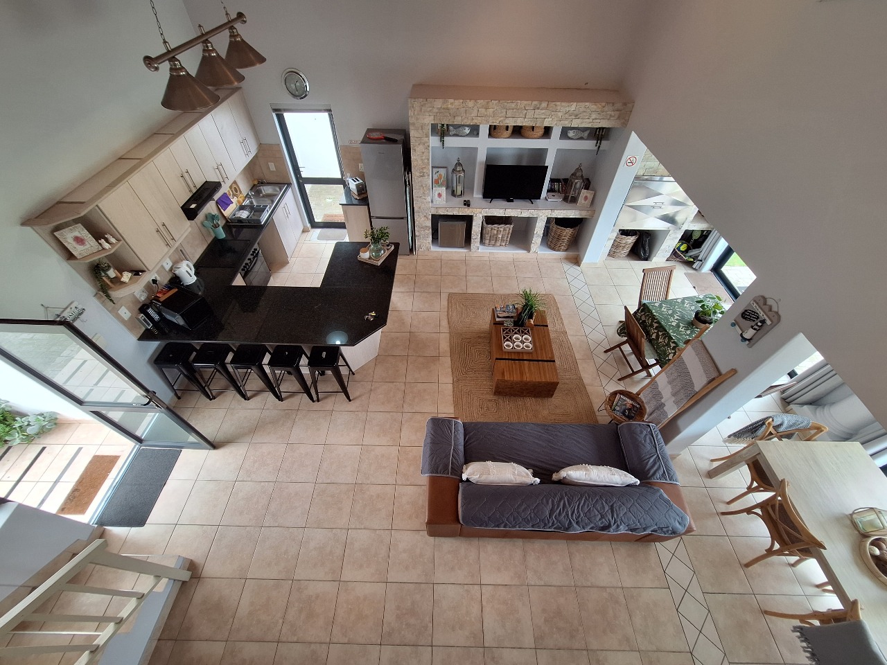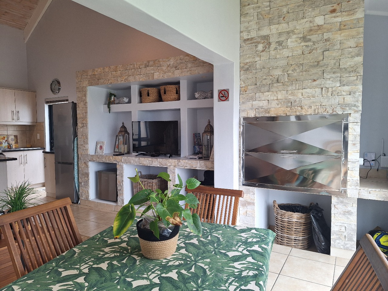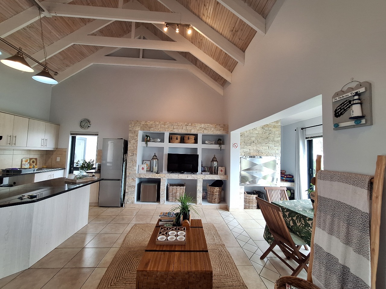 * Spacious open plan living area with high rafter ceiling, lounge, dining area, modern kitchen and built-in braai with brick finishes.