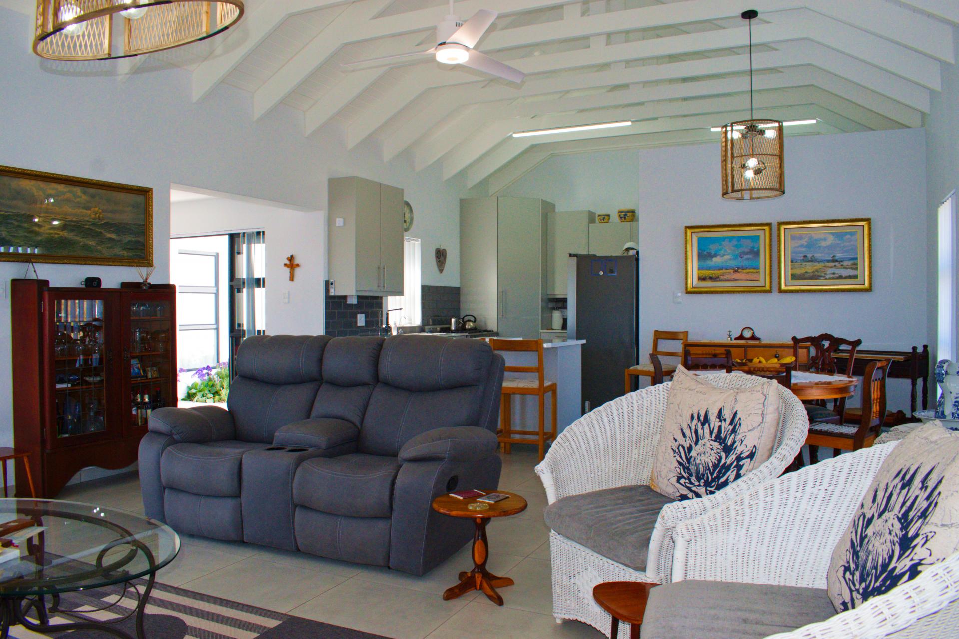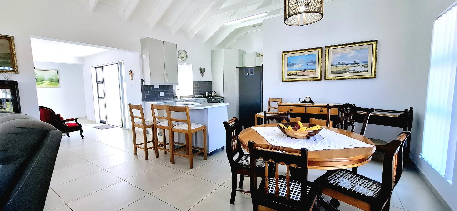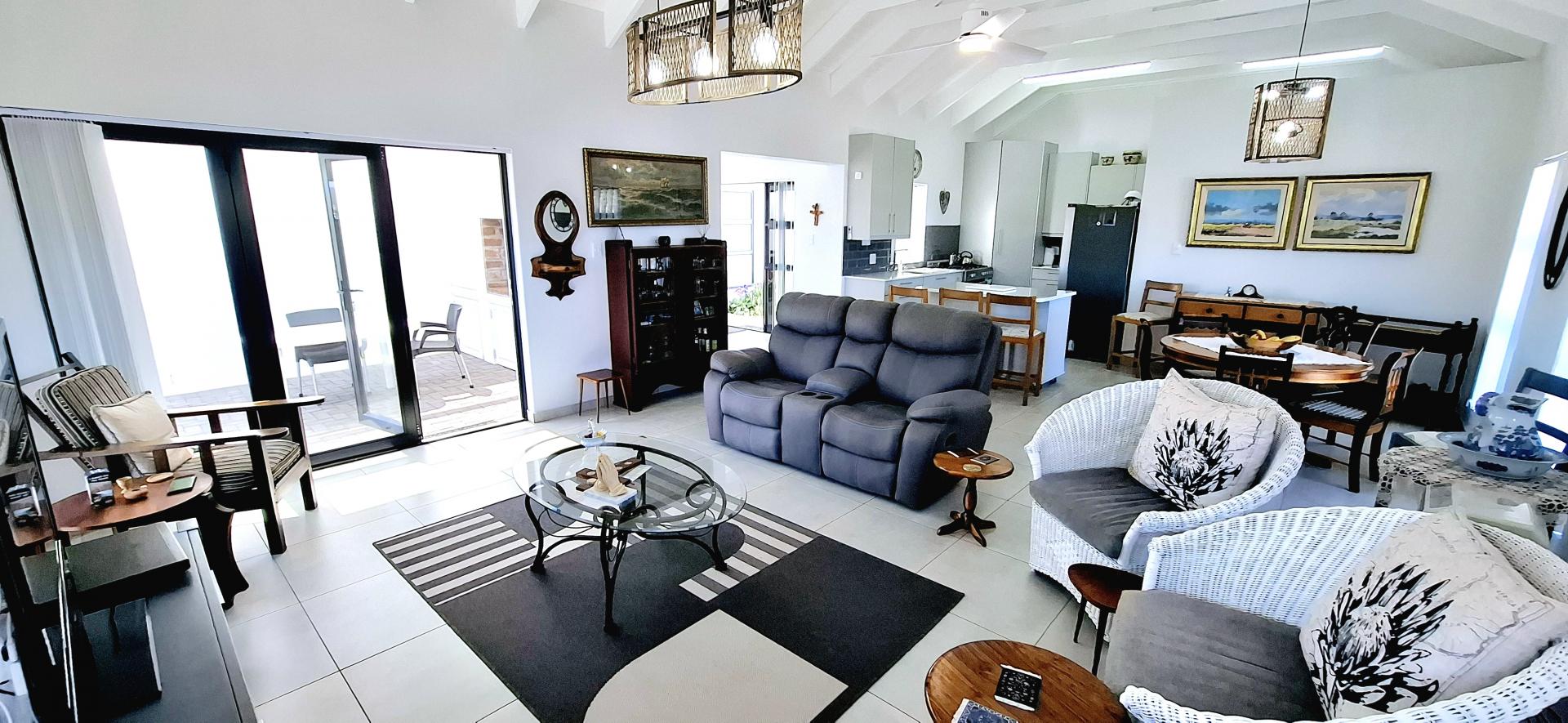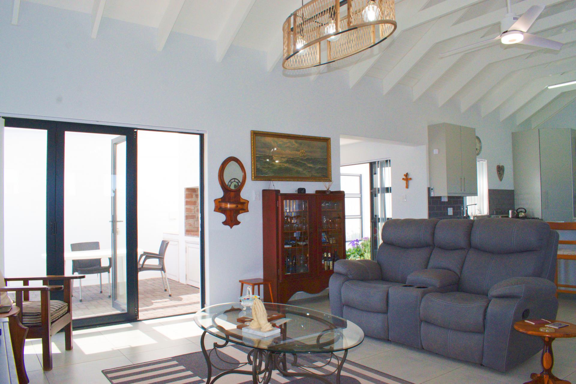 • Spacious living area that leads out onto a patio with a built-in braai and views over Shelley Point Estate.