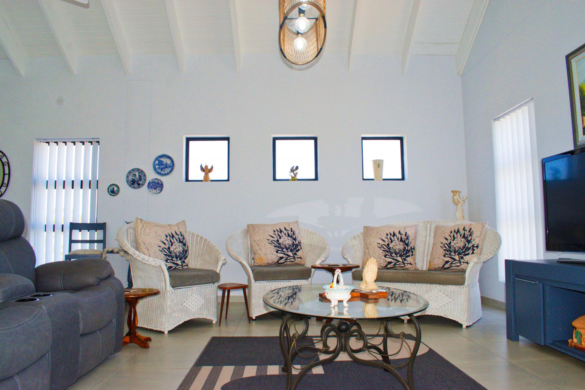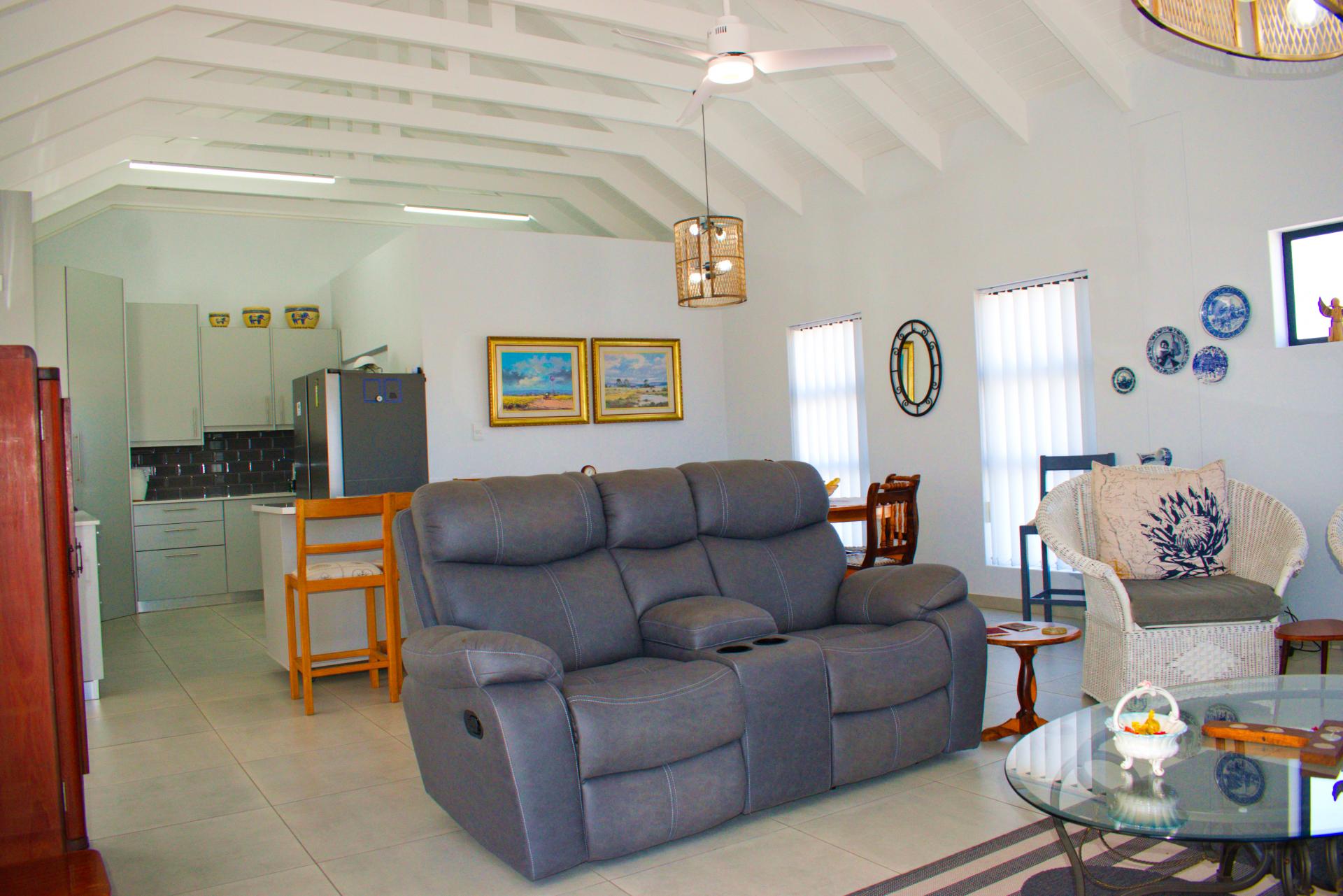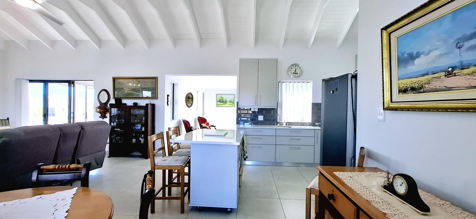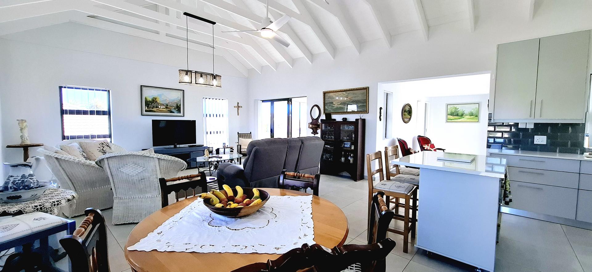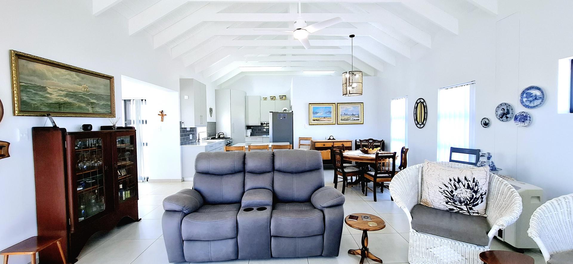 • Spacious living area that leads out onto a patio with a built-in braai and views over Shelley Point Estate.