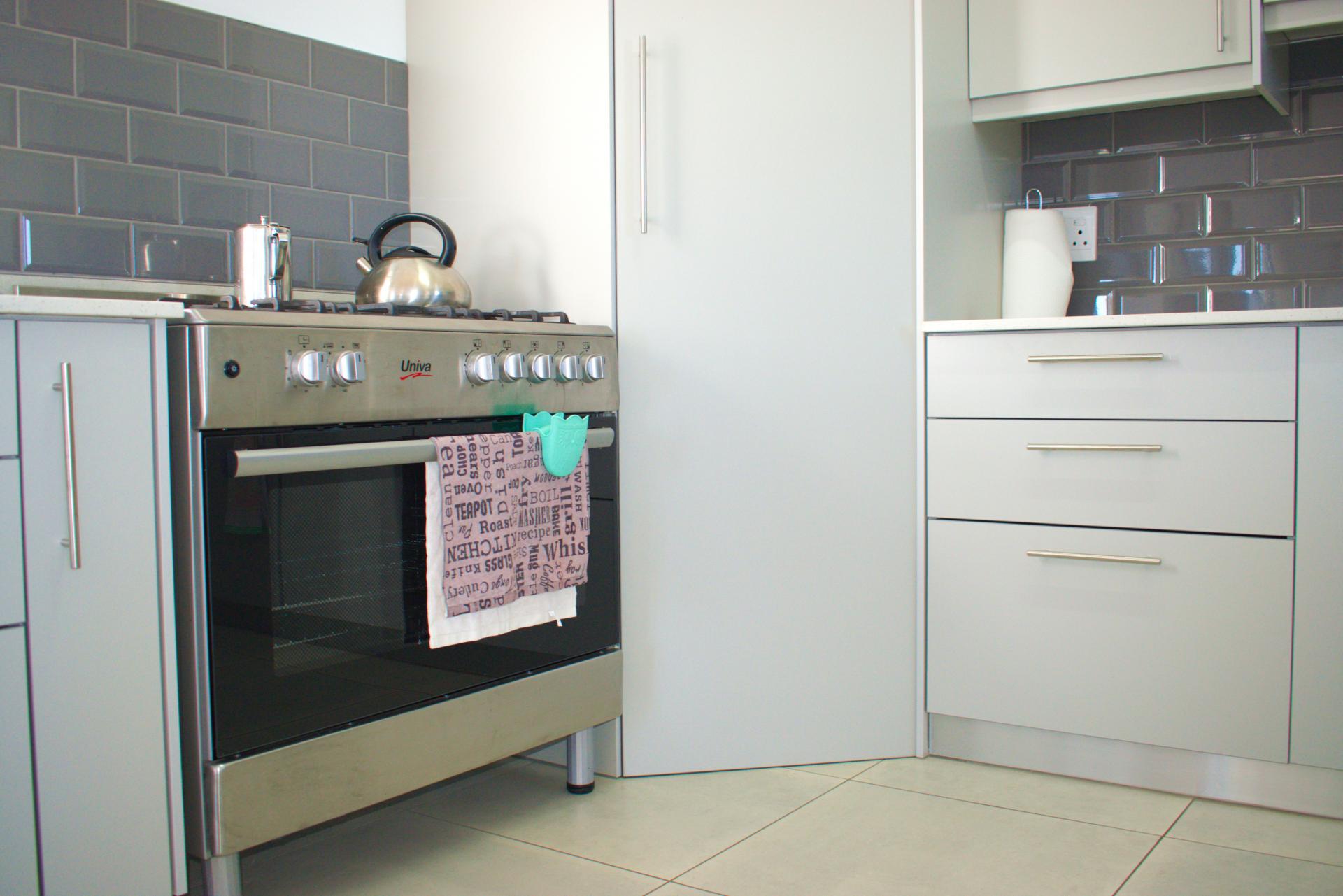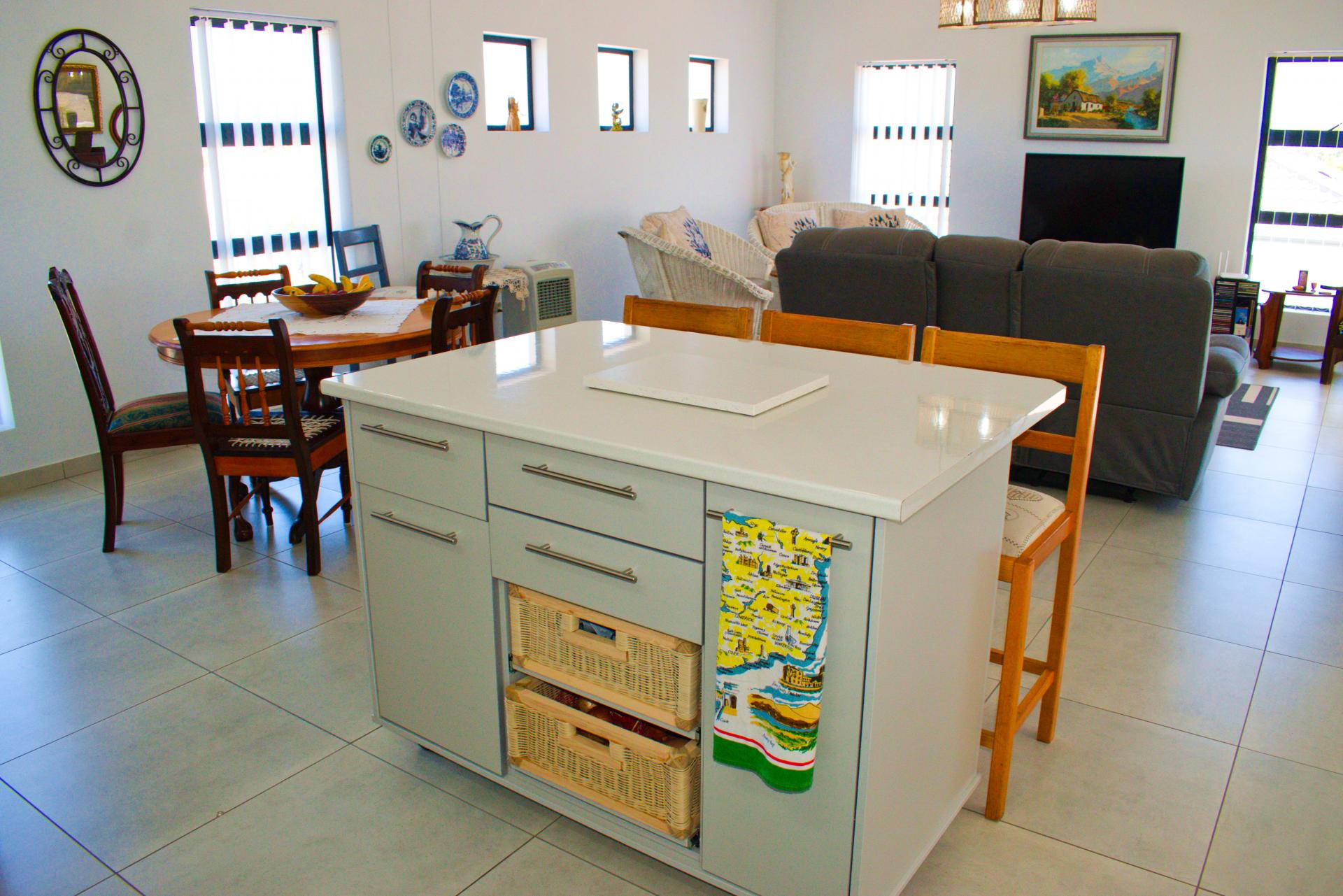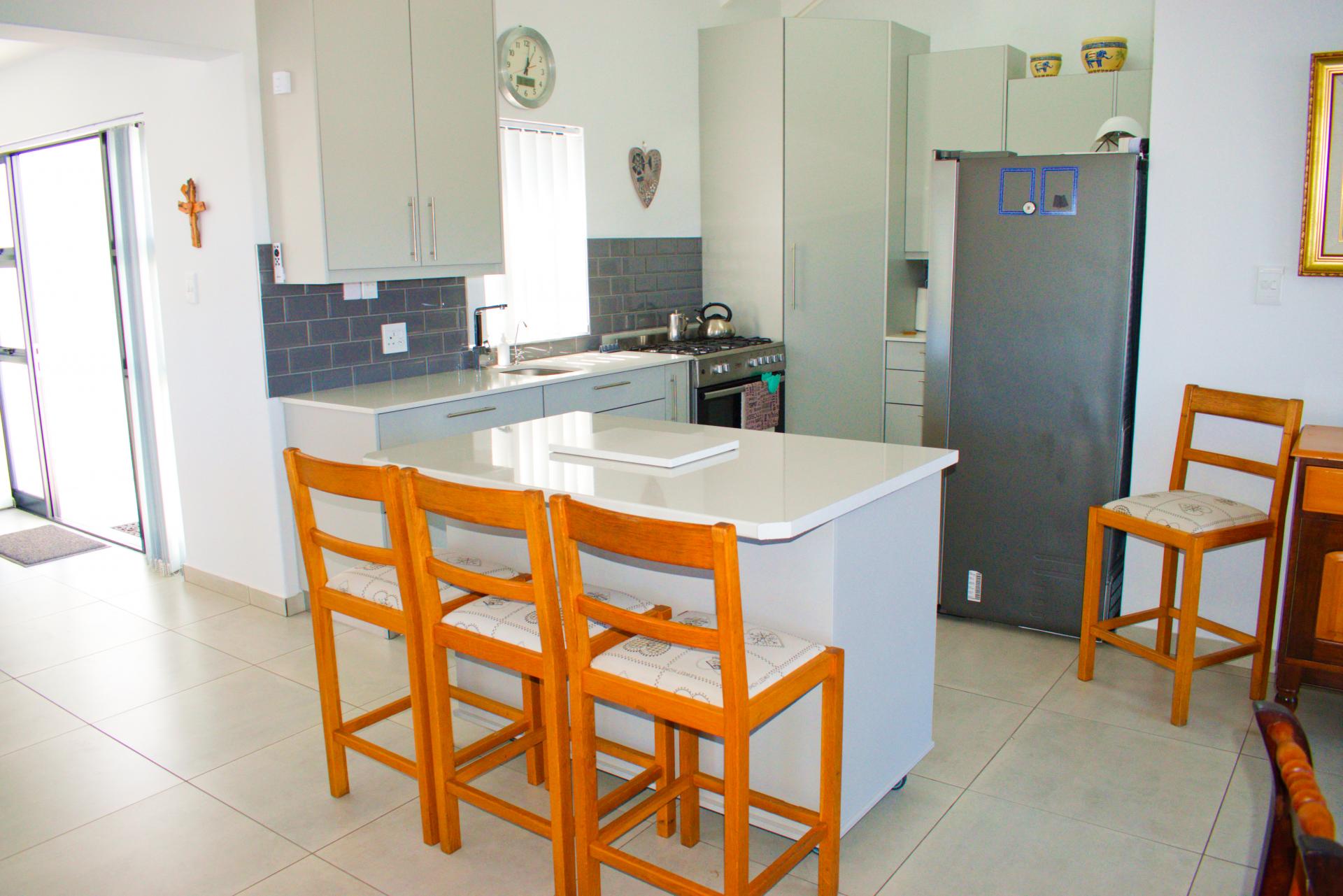 • Open-plan kitchen with stone working tops, gas stove, lots of ample built-in cupboards and center island.