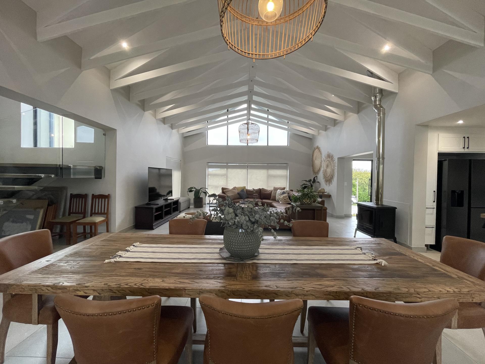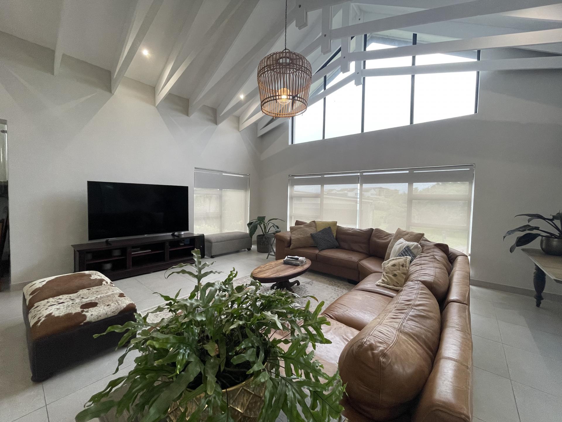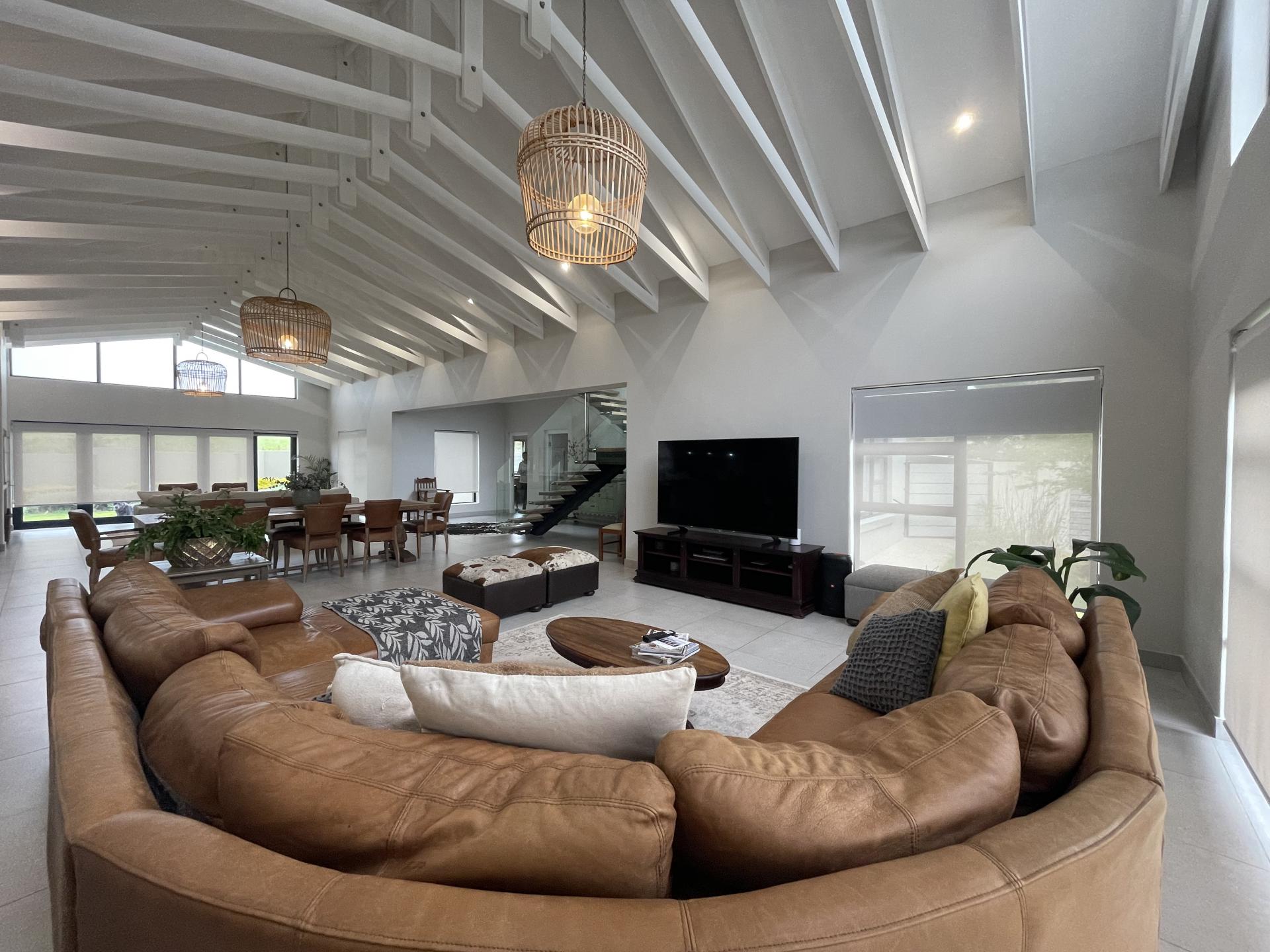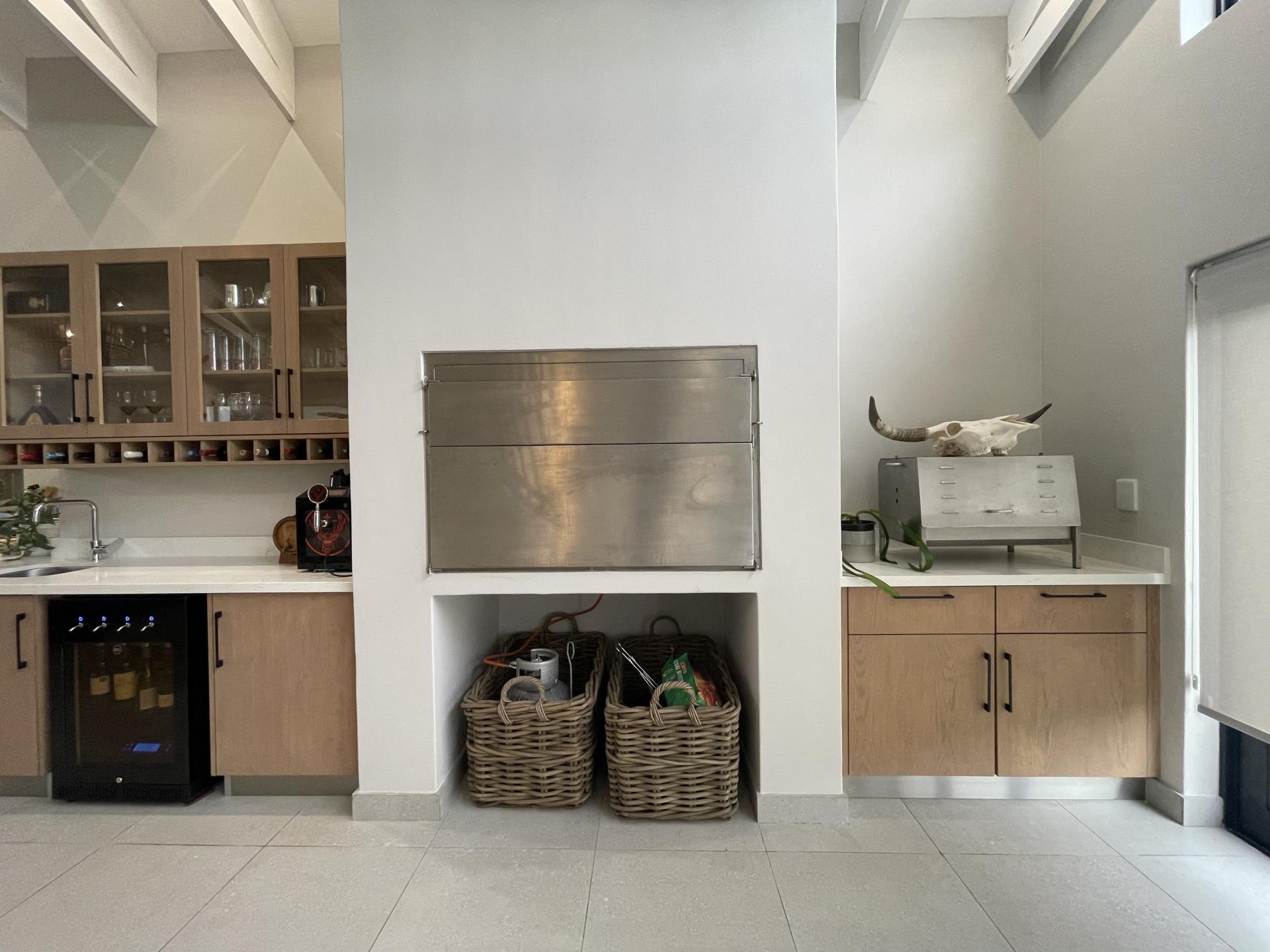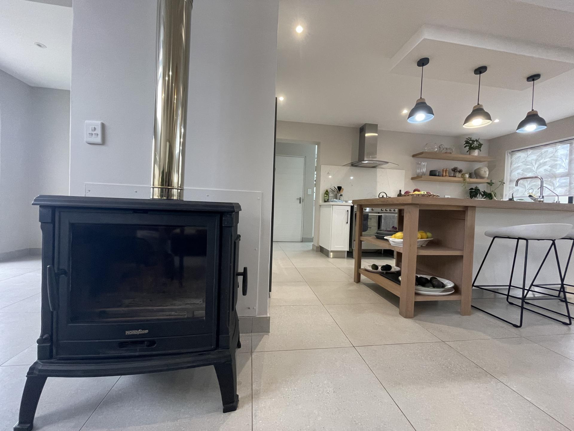 Each spacious en-suite bedroom features a walk-in closet, ensuring ample storage and a touch of elegance. The open-plan living spaces are enhanced by high open trusses, creating a grand sense of volume. This entertainment-ready home boasts a built-in gas grill and traditional braai facilities, perfect for gatherings. Cozy up by the inviting fireplace on cooler evenings, making this home an ideal year-round retreat. The well-maintained, beautifully landscaped garden enhances the outdoor space, providing tranquility and easy upkeep.