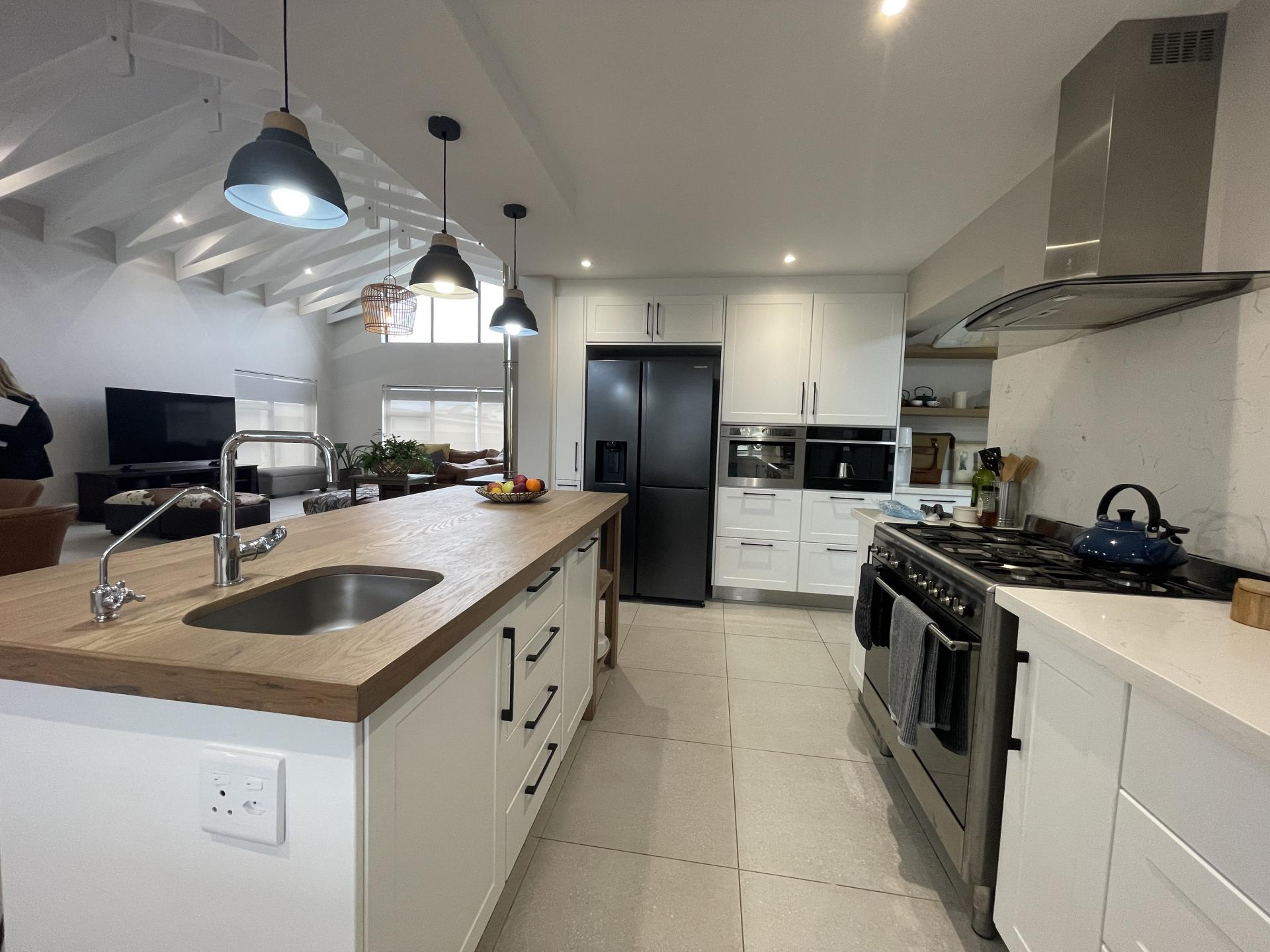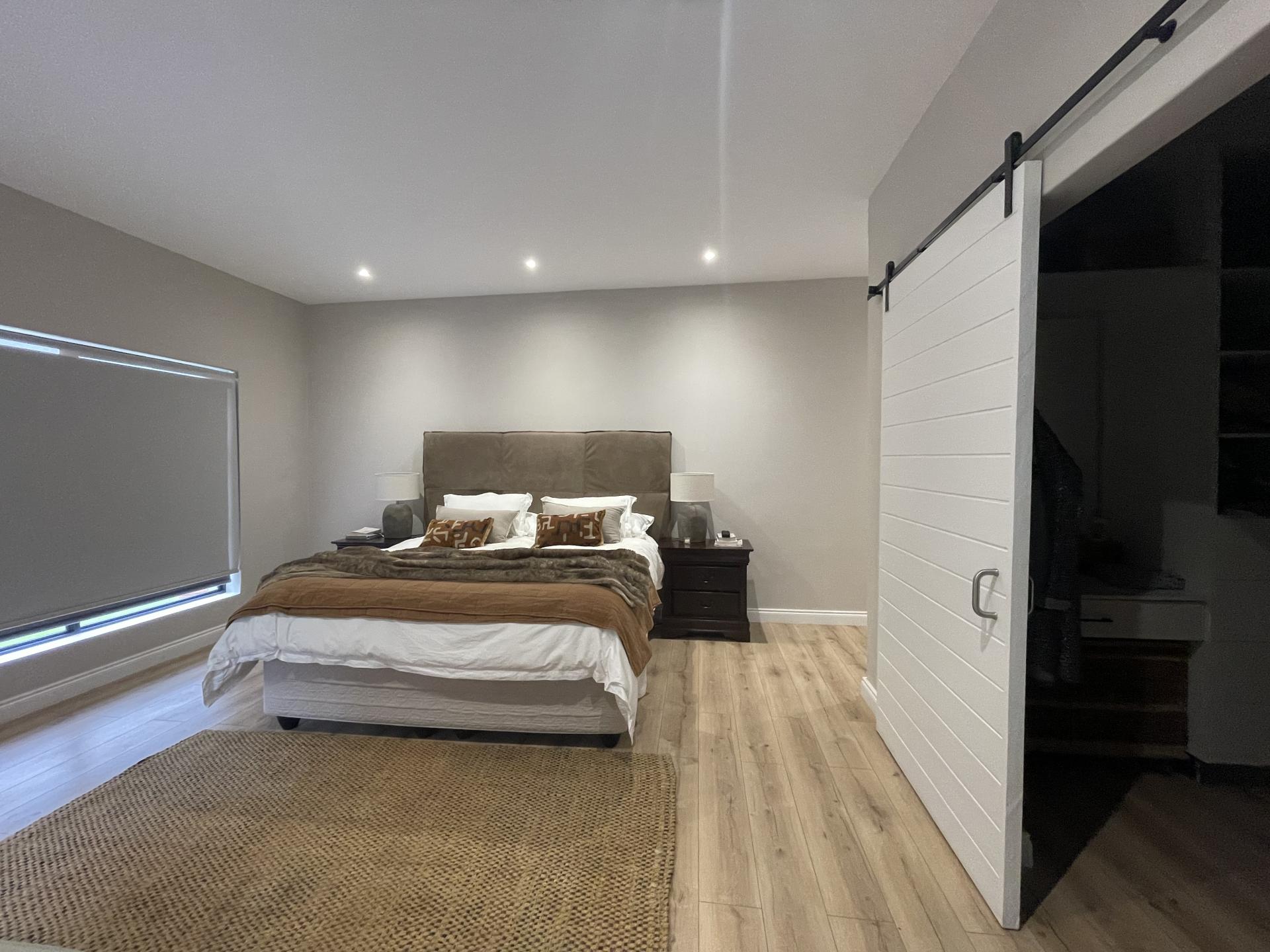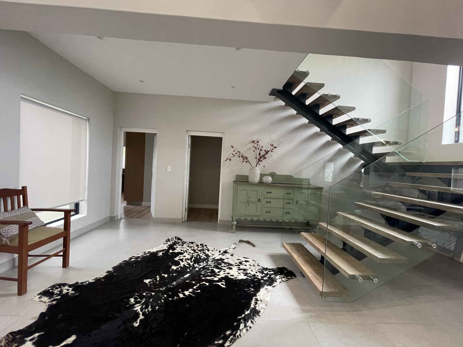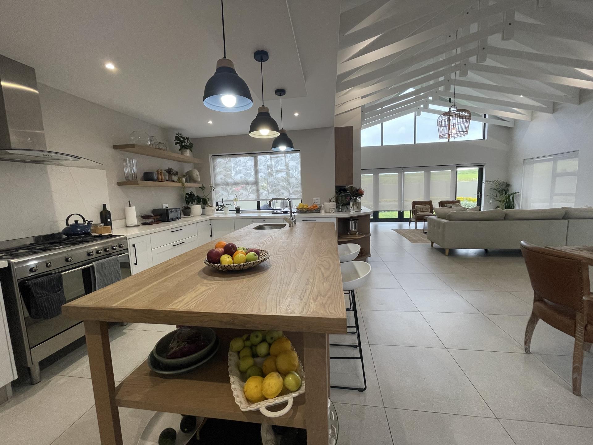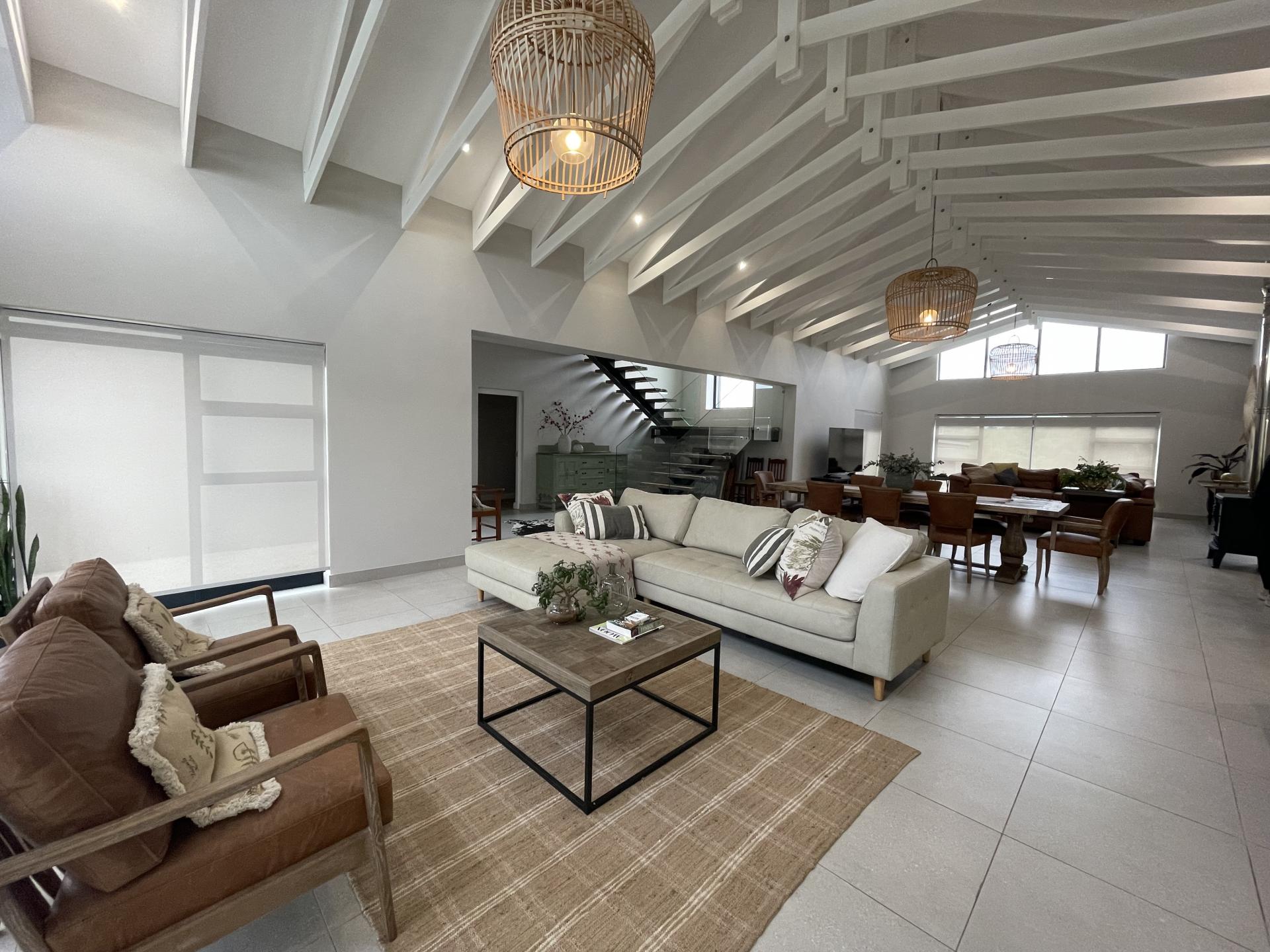 Each spacious en-suite bedroom features a walk-in closet, ensuring ample storage and a touch of elegance. The open-plan living spaces are enhanced by high open trusses, creating a grand sense of volume. This entertainment-ready home boasts a built-in gas grill and traditional braai facilities, perfect for gatherings. Cozy up by the inviting fireplace on cooler evenings, making this home an ideal year-round retreat. The well-maintained, beautifully landscaped garden enhances the outdoor space, providing tranquility and easy upkeep.