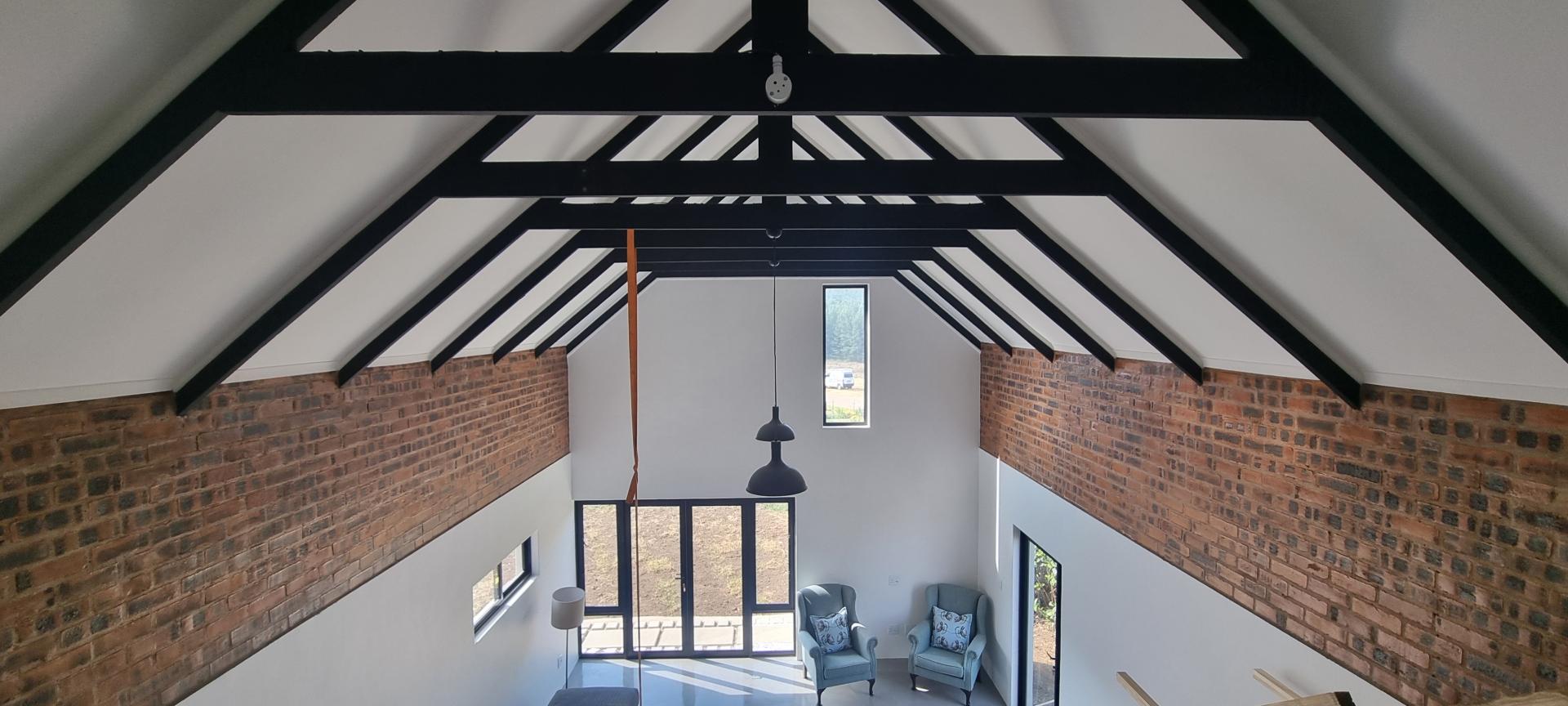Vaulted ceilings with exposed trusses add volume and architectural flair