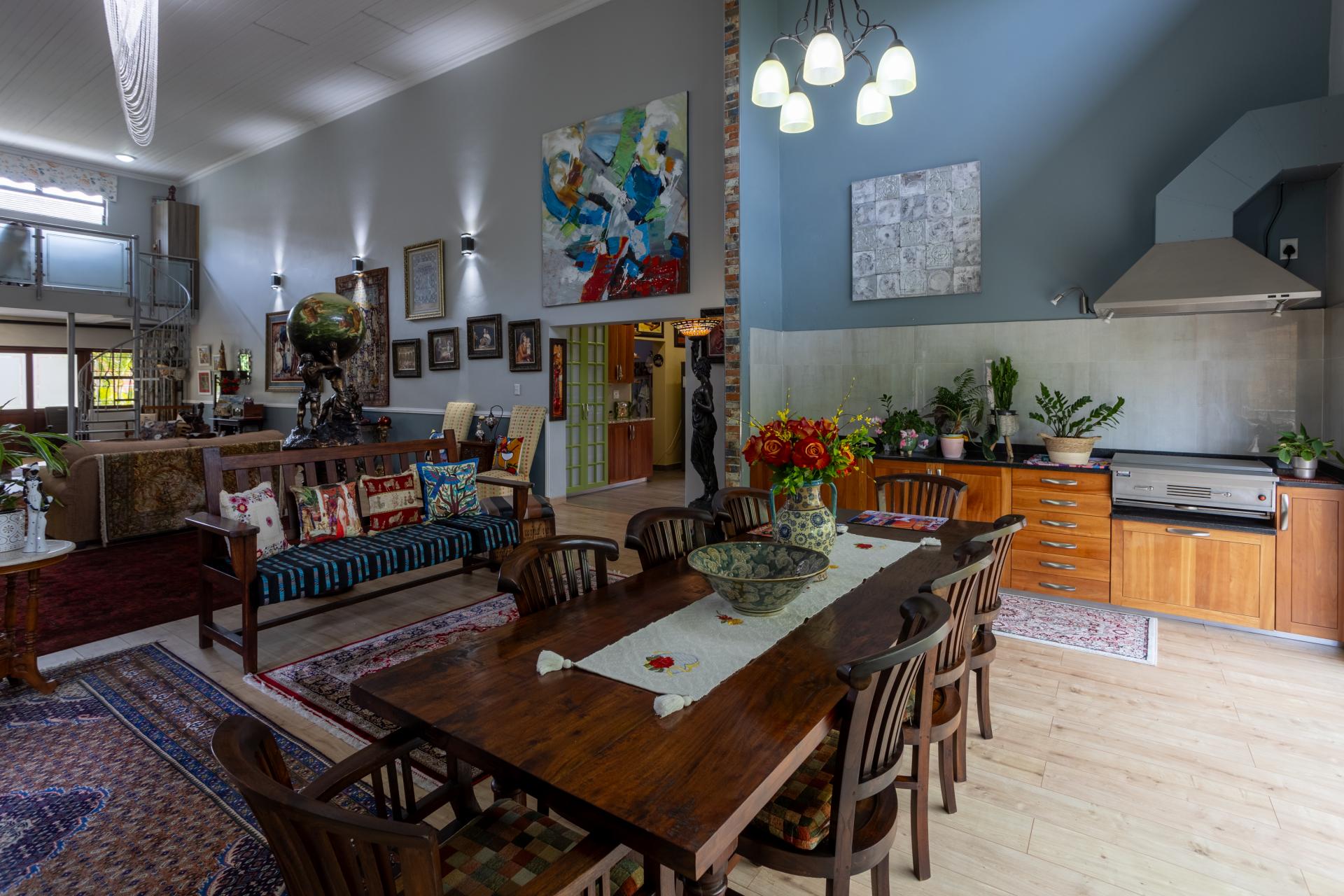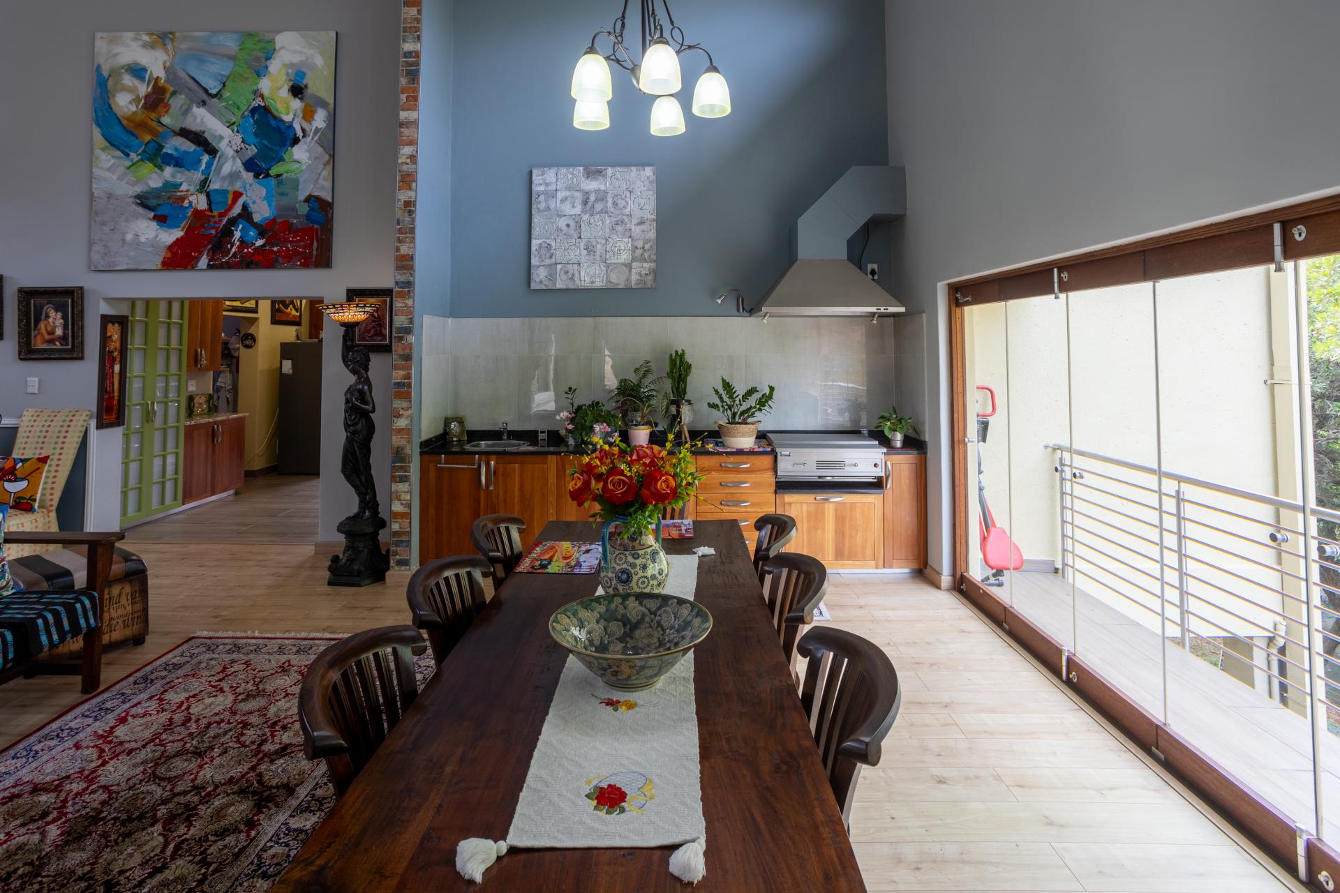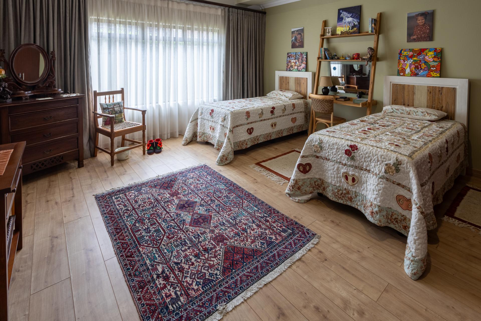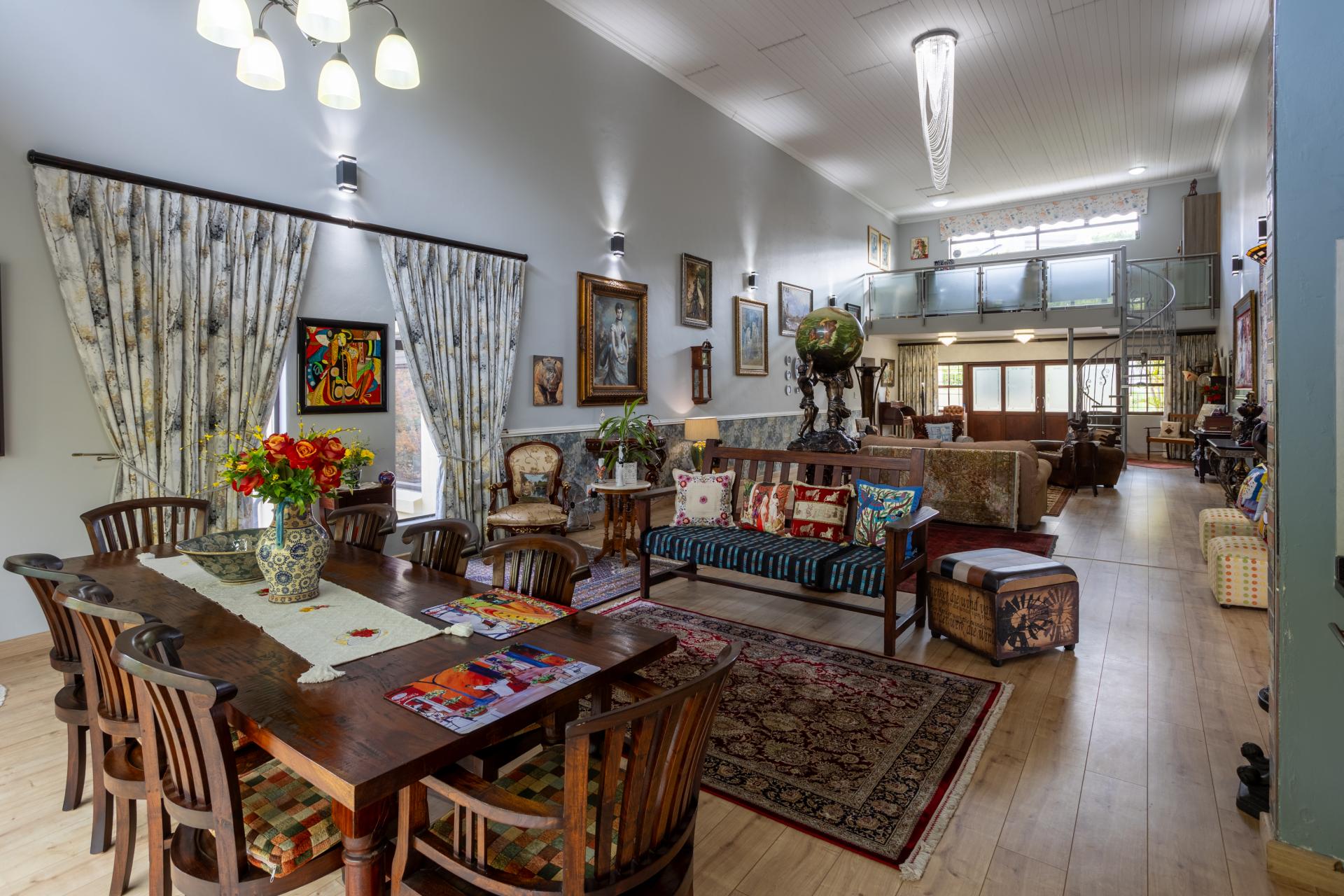 • Living Spaces: The open-plan living area seamlessly connects the kitchen, dining, and lounge spaces, making it ideal for entertaining or family gatherings. The area is enhanced by a double-volume ceiling, creating a sense of space and grandeur. Hertex wallpaper accents the walls, adding a touch of sophisticated style.