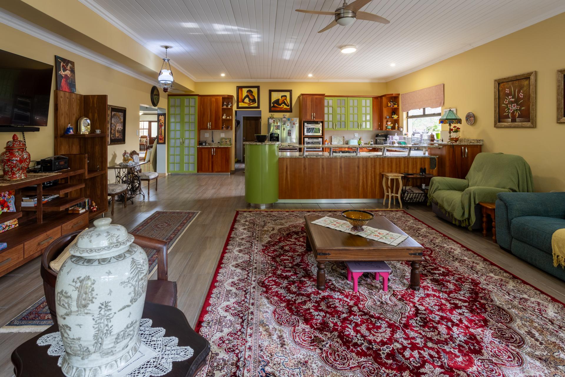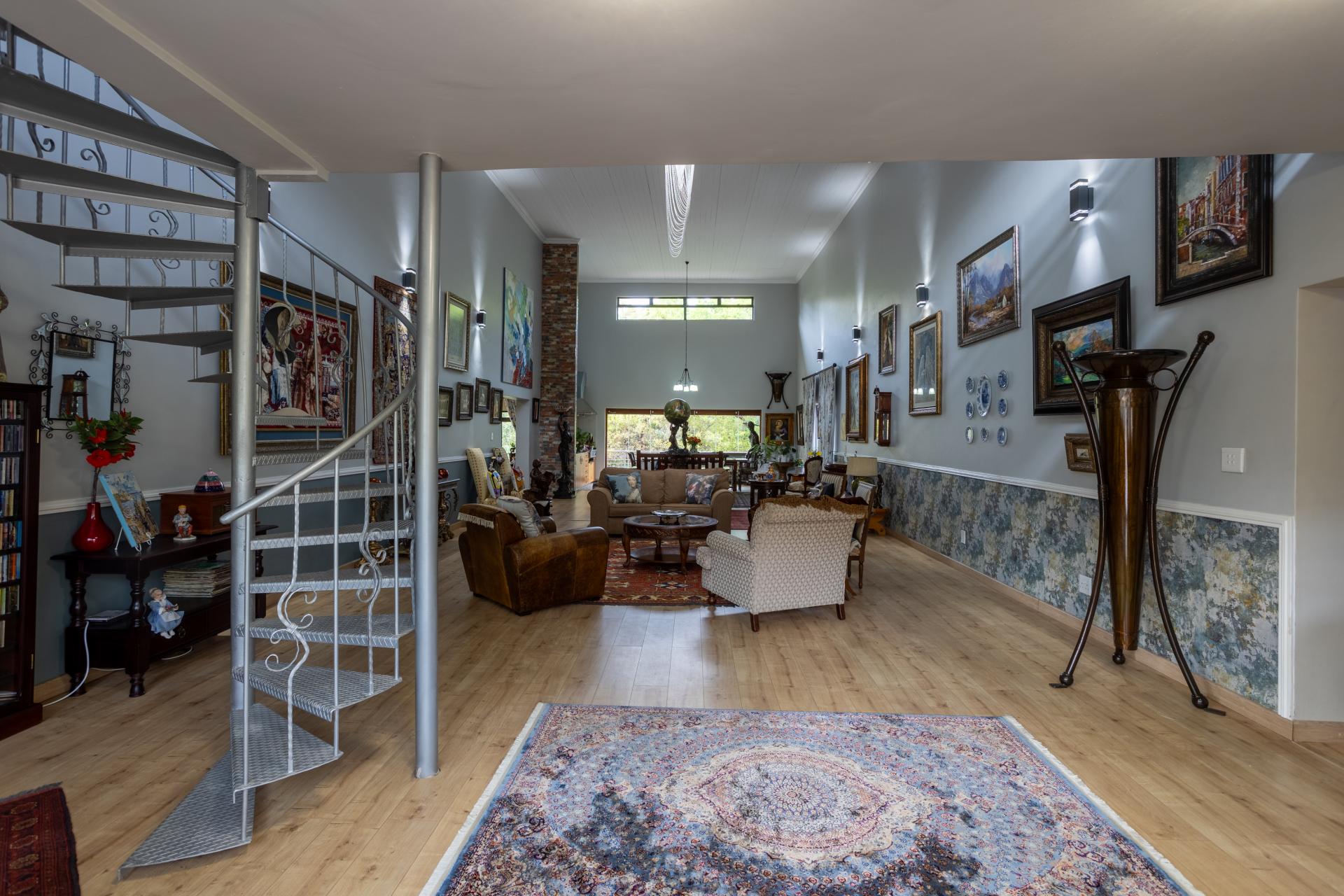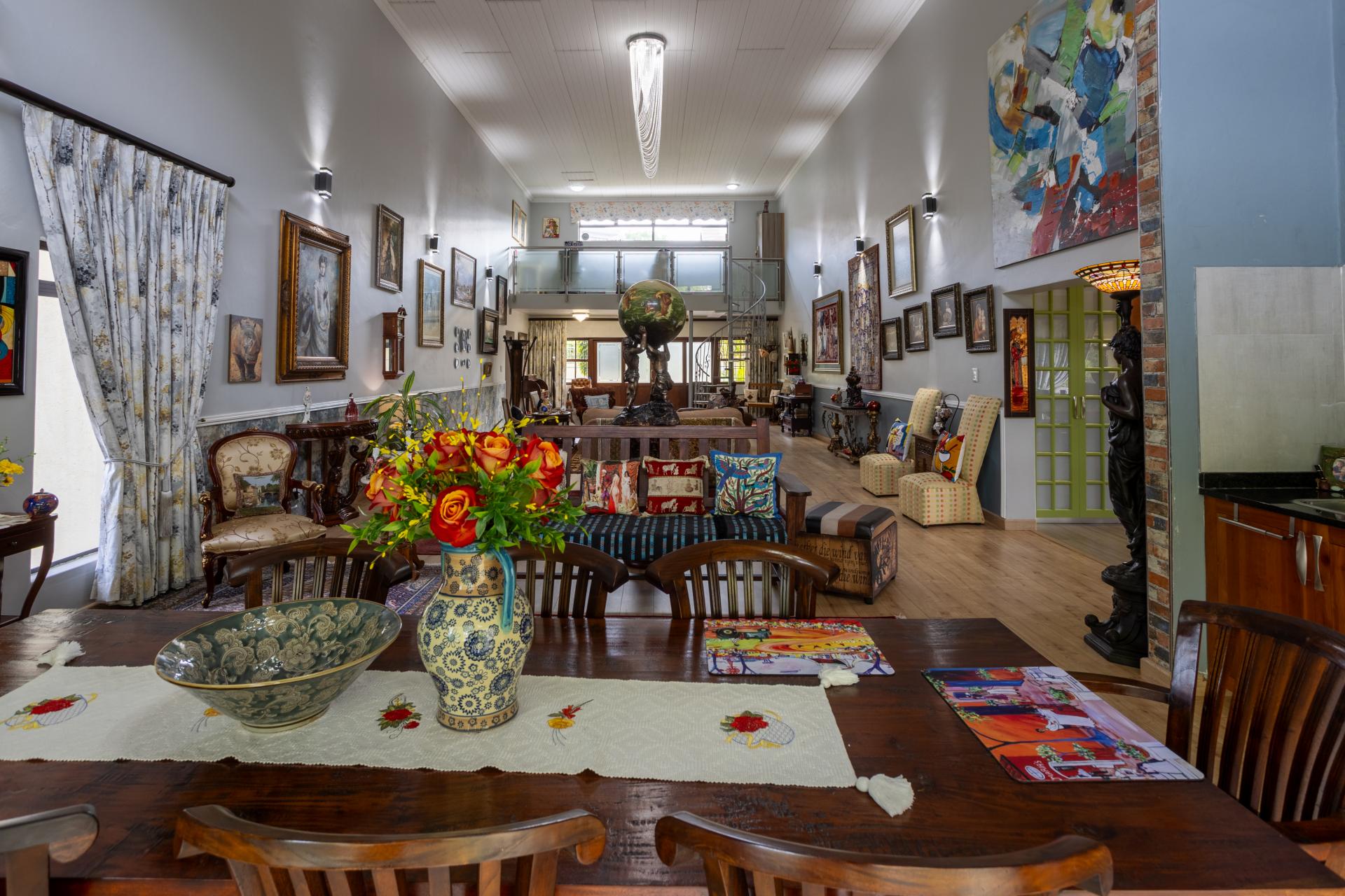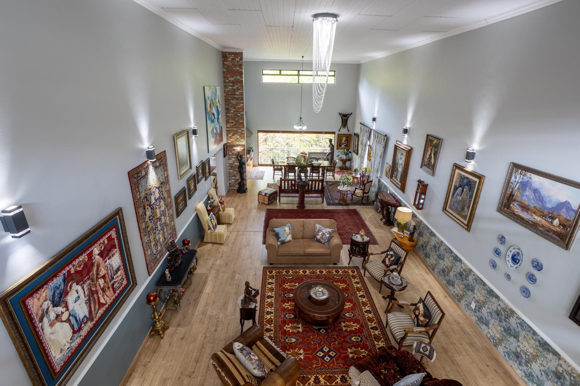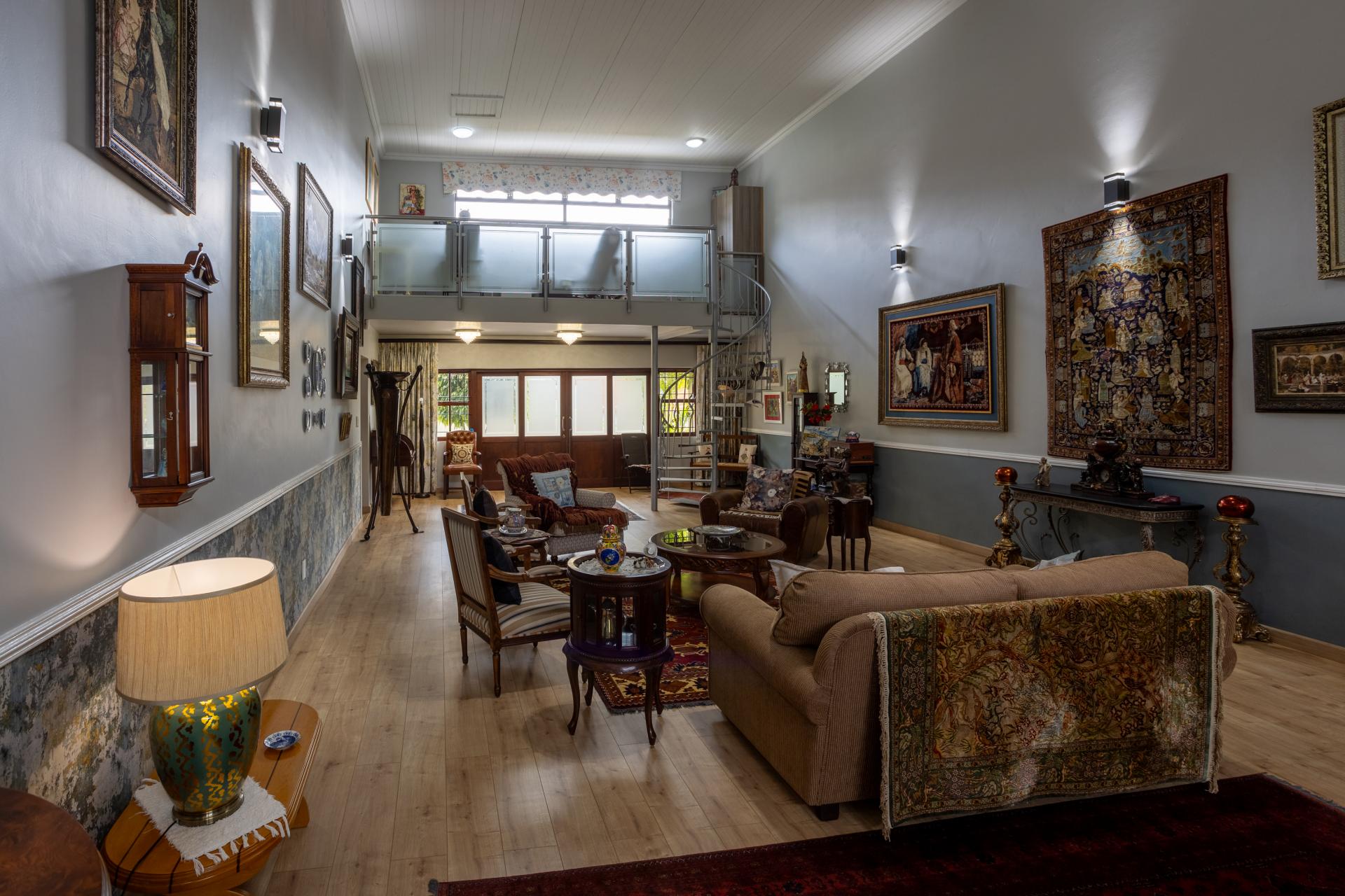 • Living Spaces: The open-plan living area seamlessly connects the kitchen, dining, and lounge spaces, making it ideal for entertaining or family gatherings. The area is enhanced by a double-volume ceiling, creating a sense of space and grandeur. Hertex wallpaper accents the walls, adding a touch of sophisticated style.