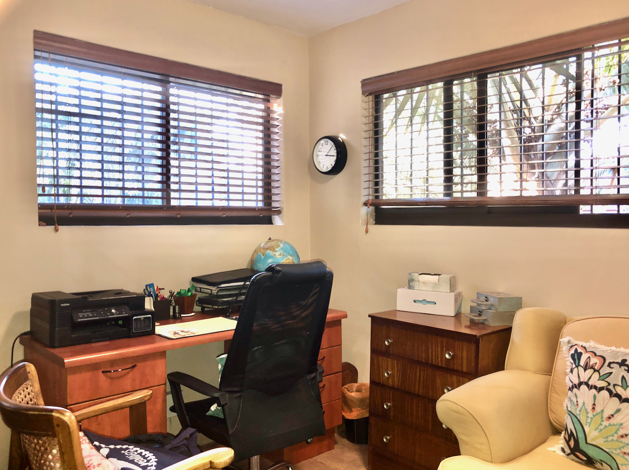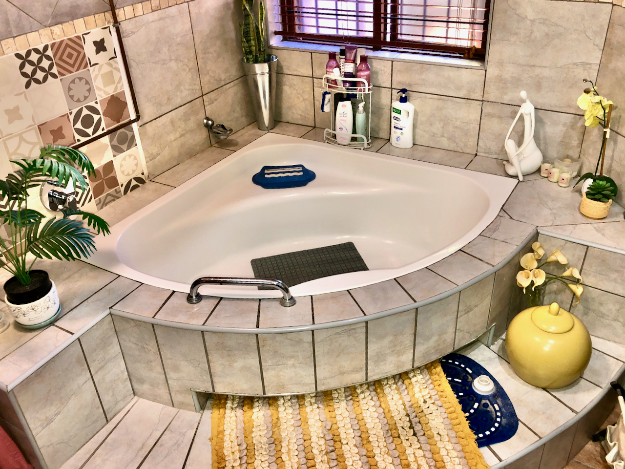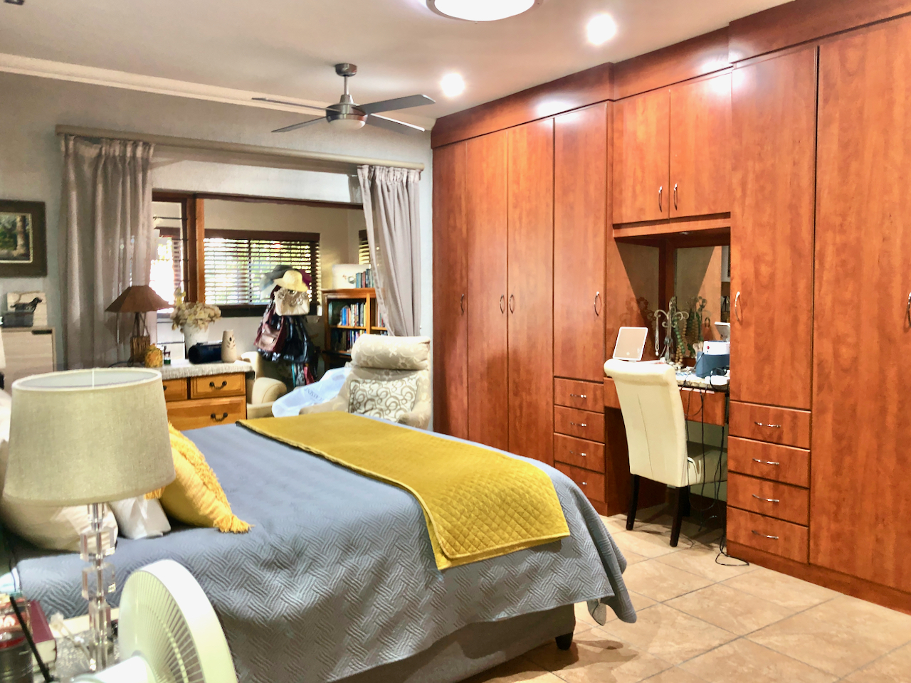 Main bedroom sanctuary includes wall-to-wall cupboards, a luxurious en-suite bathroom with a corner bath, and its own dedicated office space – perfect for remote work or study