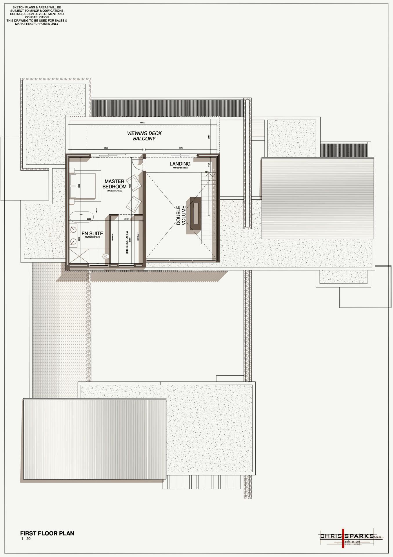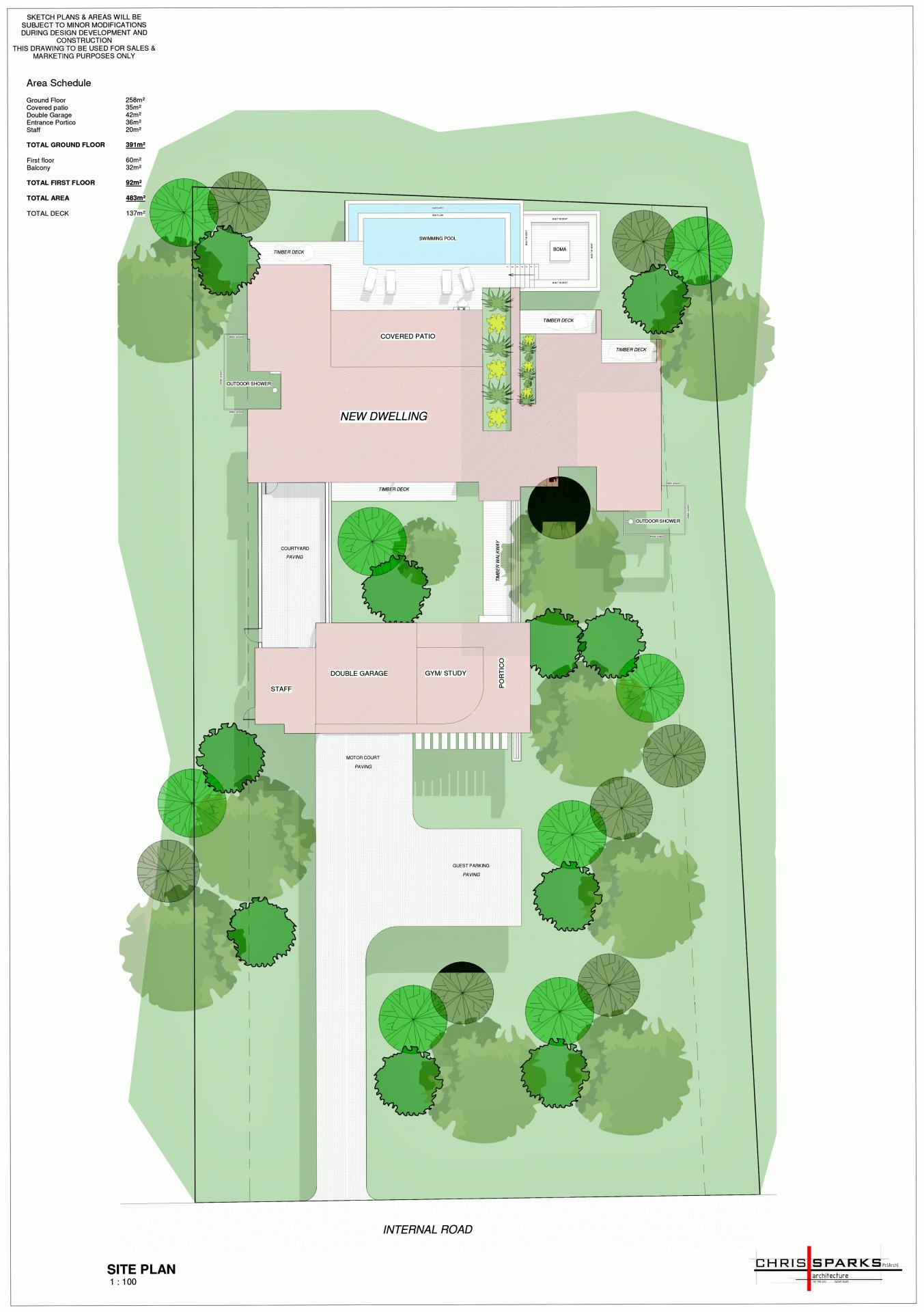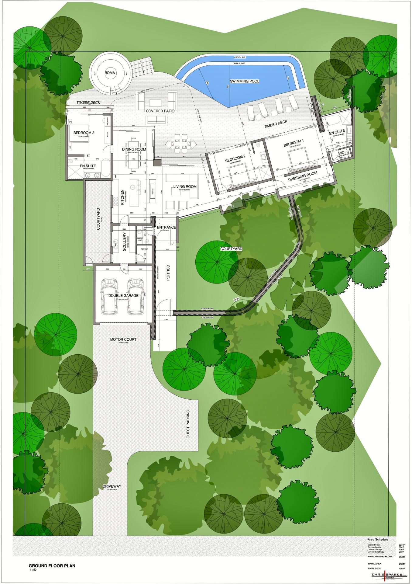 This customizable building package offers a ground floor area of 391 square meters and a first floor area of 92 square meters, totaling 482 square meters. The design features an infinity pool and boma situated along the banks of the Crocodile River, a timber deck, covered patio, double garage, paved motor court, guest parking area, gym, outdoor shower, living room, dining room, kitchen, scullery, courtyard, three en suite bedrooms, dressing room, tinted screed floors, and a balcony overlooking the river.