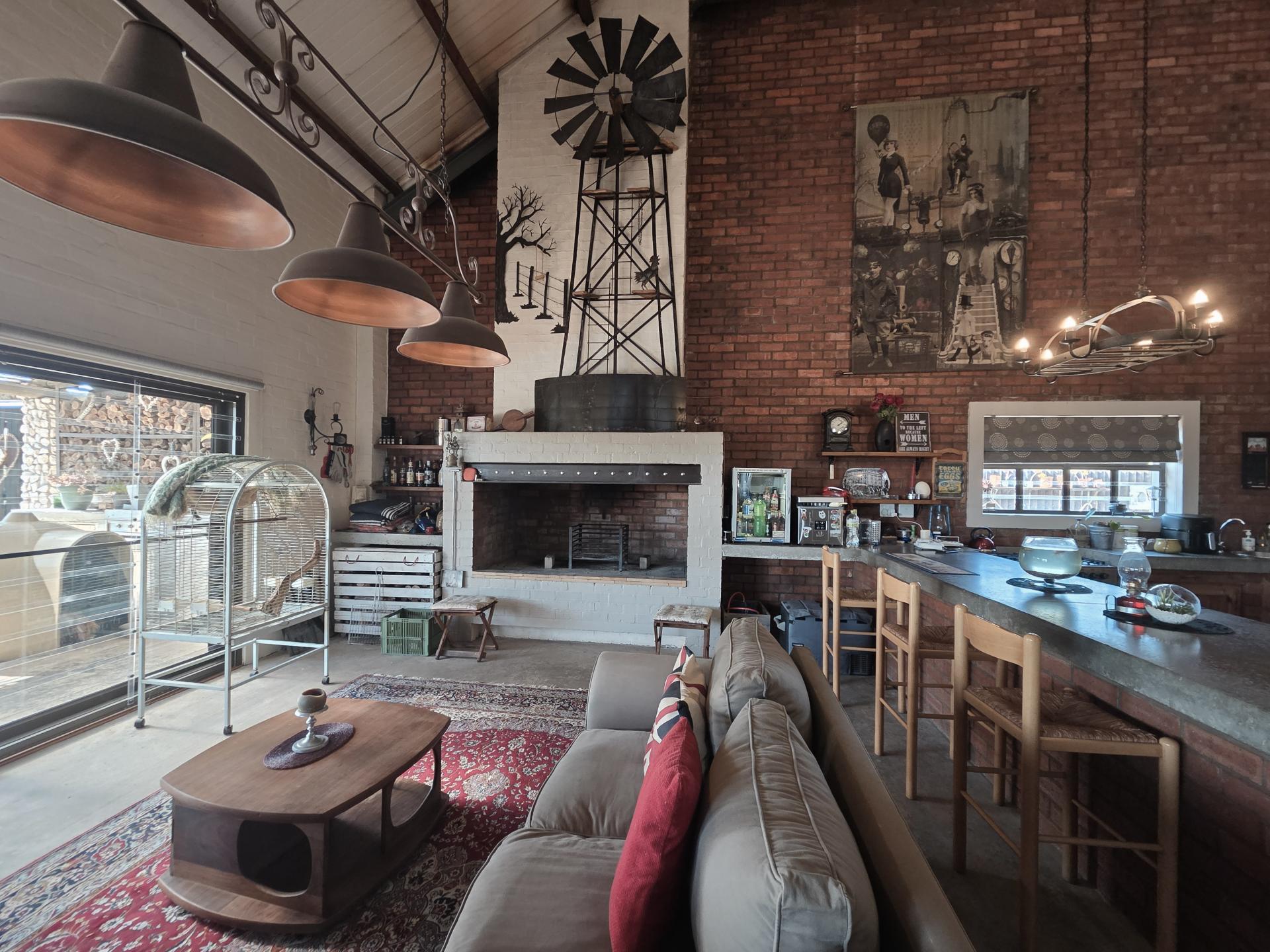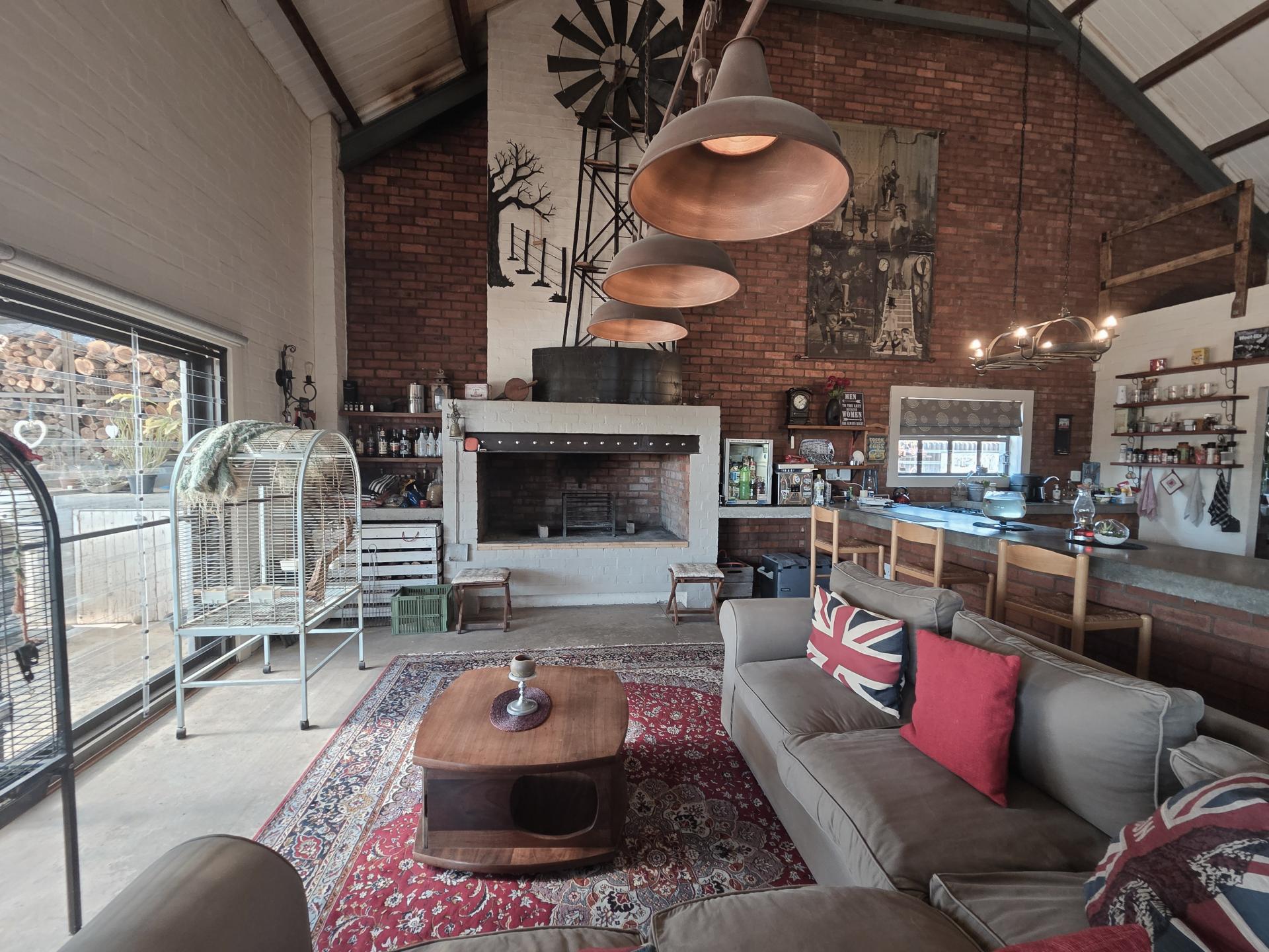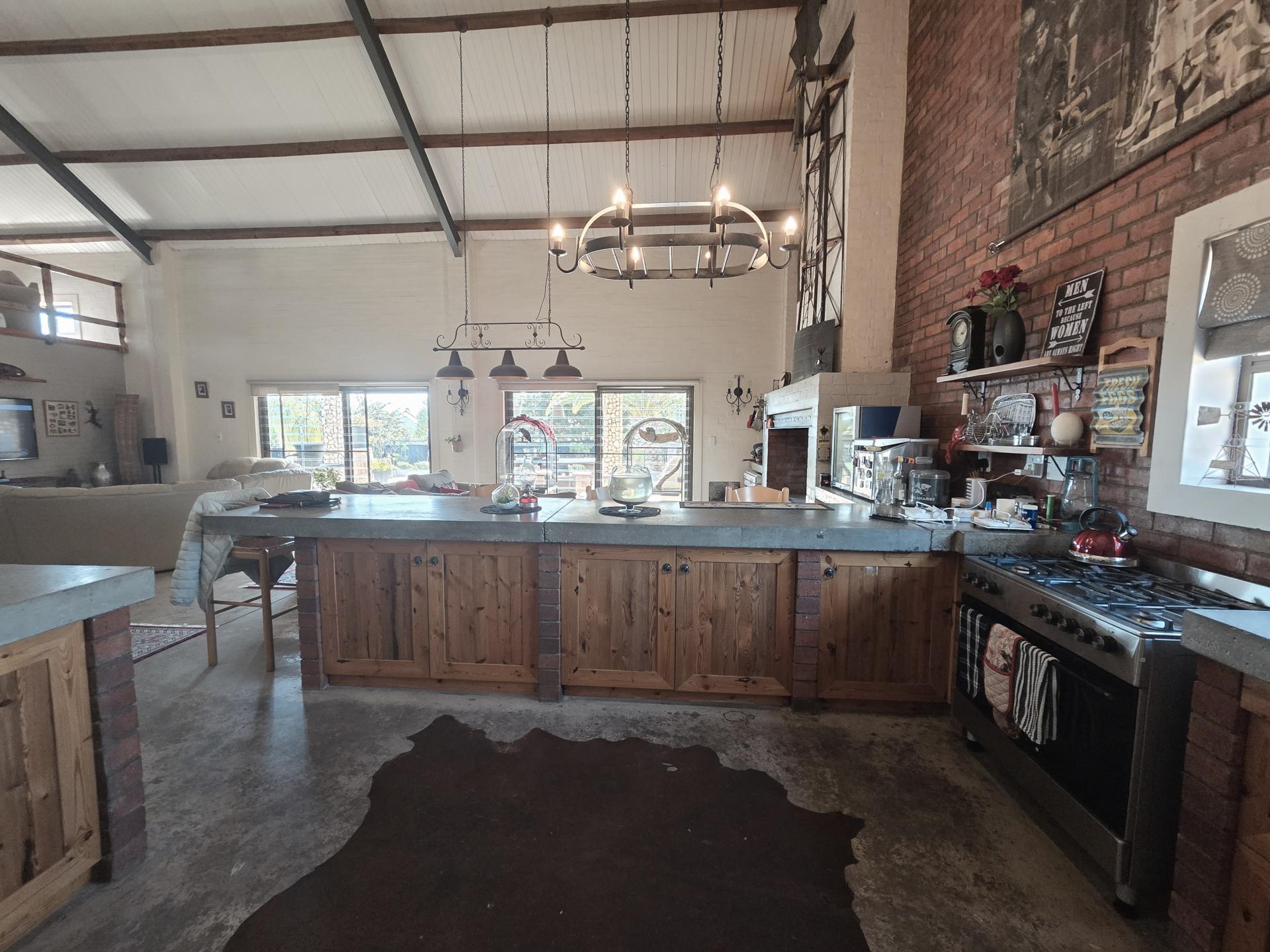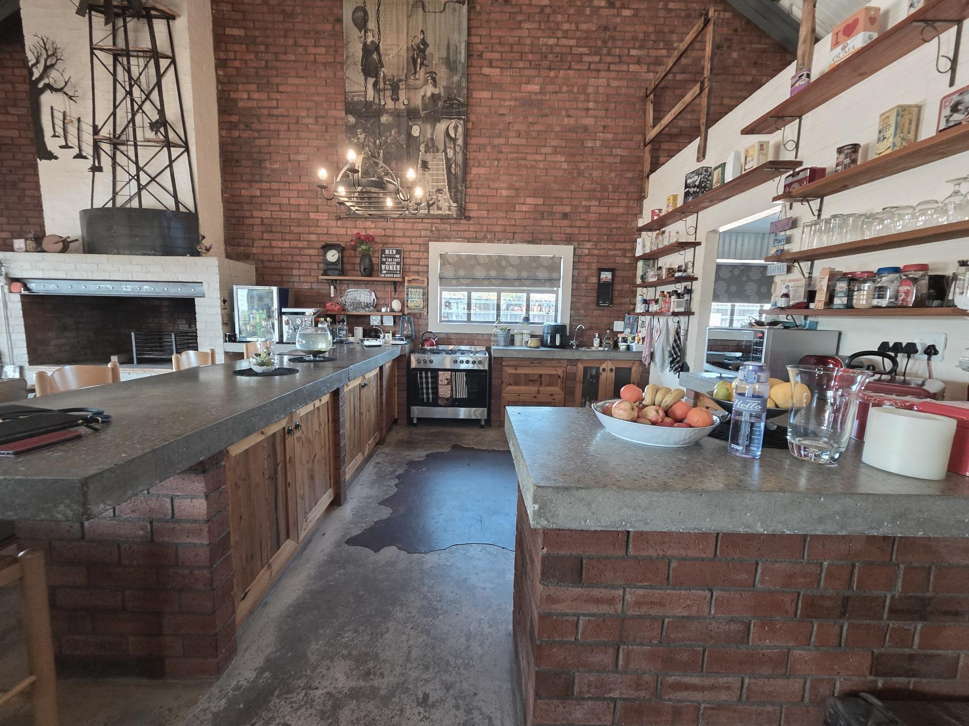 Set on 2.1 hectares of fully enclosed land, this property combines rustic charm with practical design. Inside, the home features 3 generous bedrooms and 2 bathrooms, including a spacious main suite with a walk-in closet and full en-suite. The open-plan living and dining area welcomes you with its inviting atmosphere and high vaulted ceilings, while the kitchen adds personality with its concrete finishes, separate scullery, and pantry.
