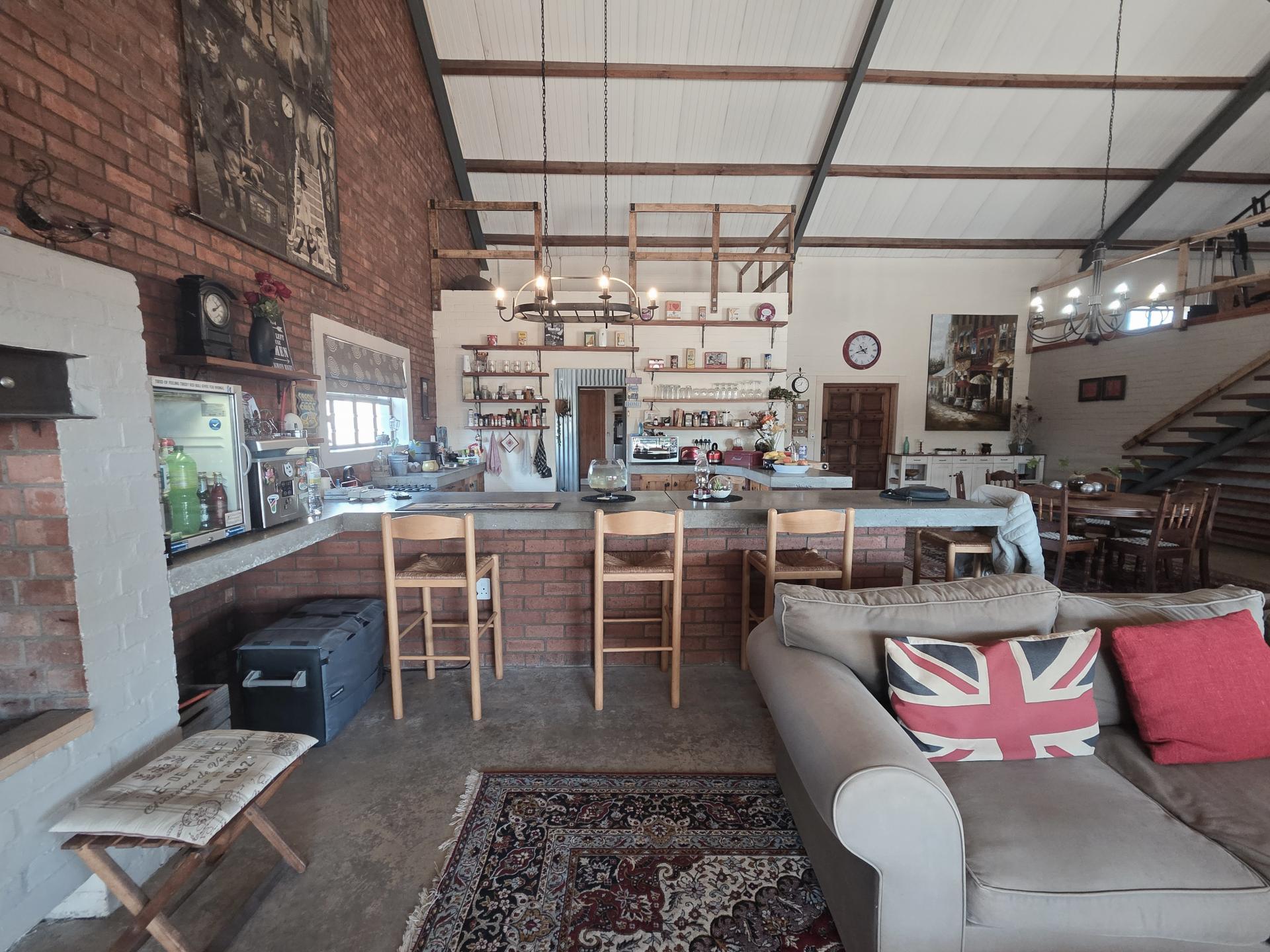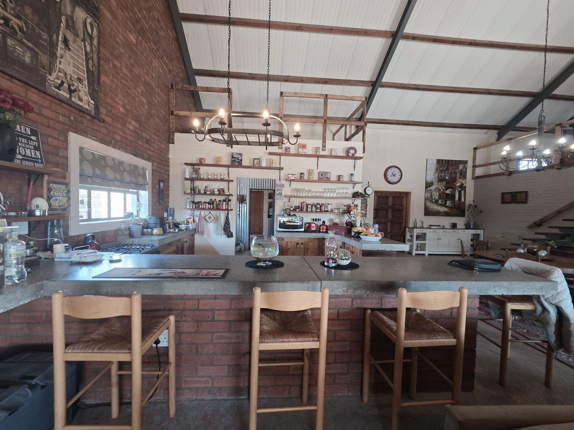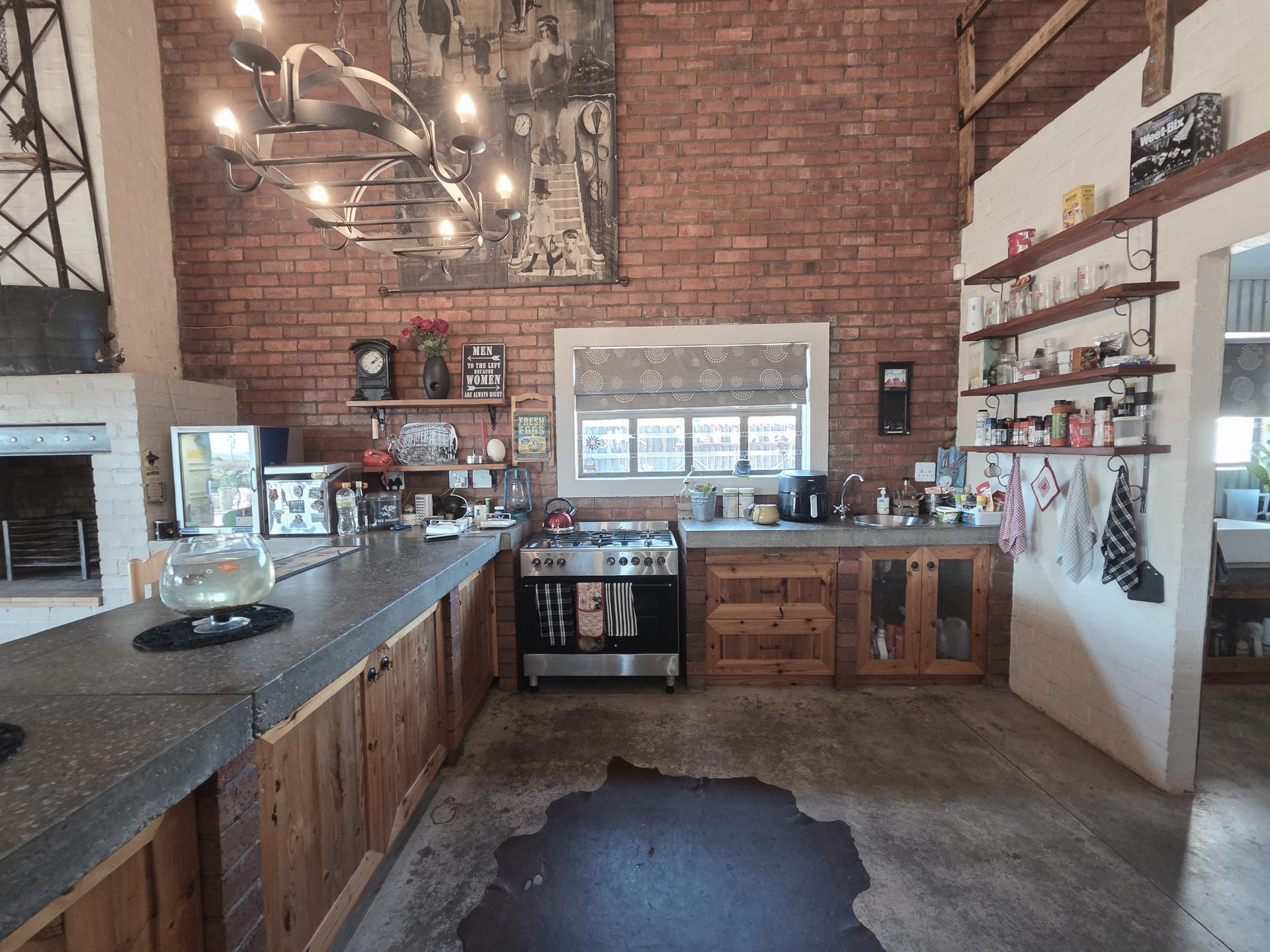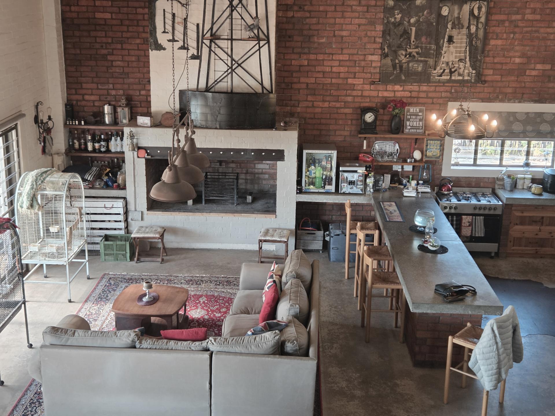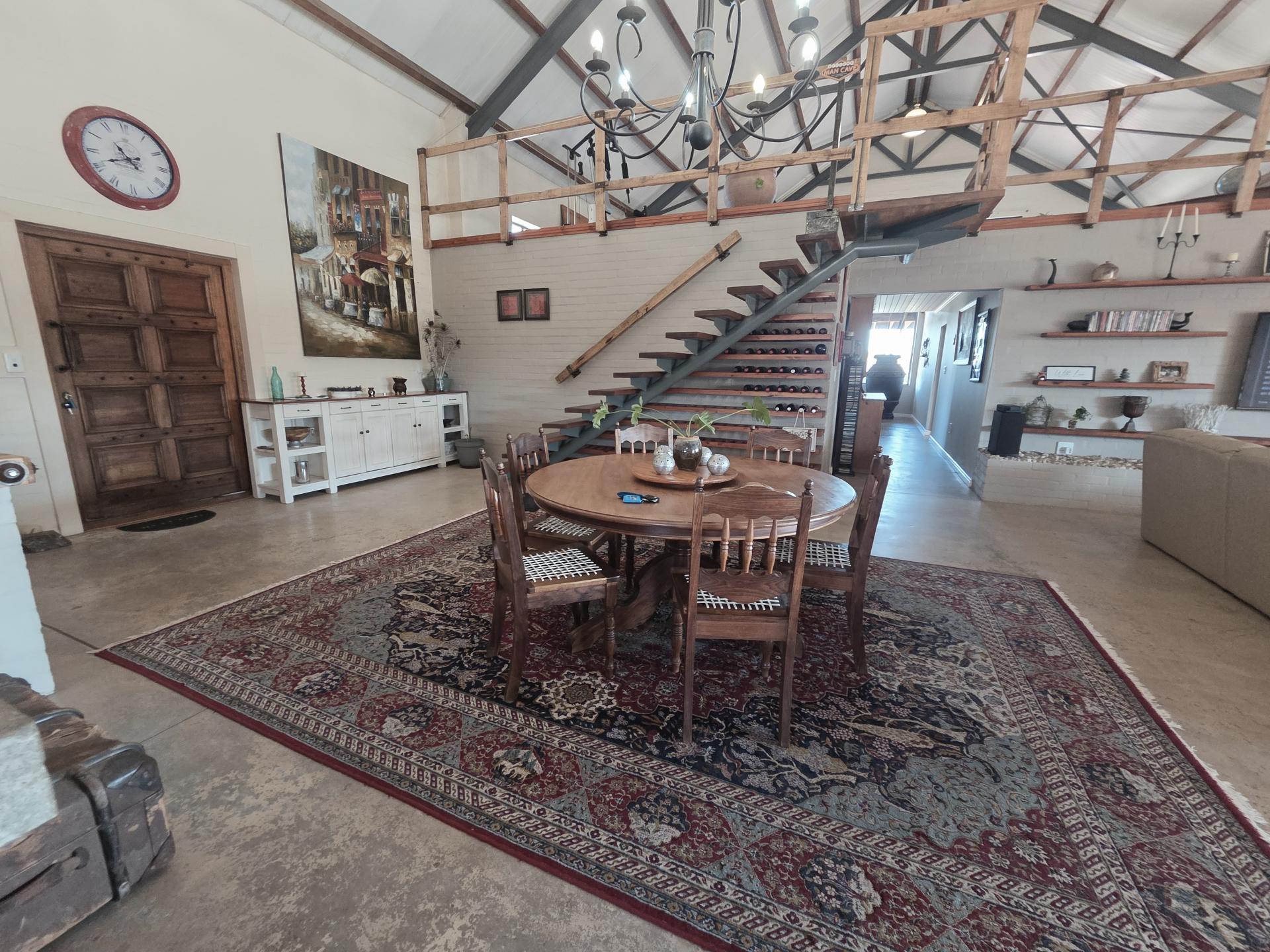 Set on 2.1 hectares of fully enclosed land, this property combines rustic charm with practical design. Inside, the home features 3 generous bedrooms and 2 bathrooms, including a spacious main suite with a walk-in closet and full en-suite. The open-plan living and dining area welcomes you with its inviting atmosphere and high vaulted ceilings, while the kitchen adds personality with its concrete finishes, separate scullery, and pantry.