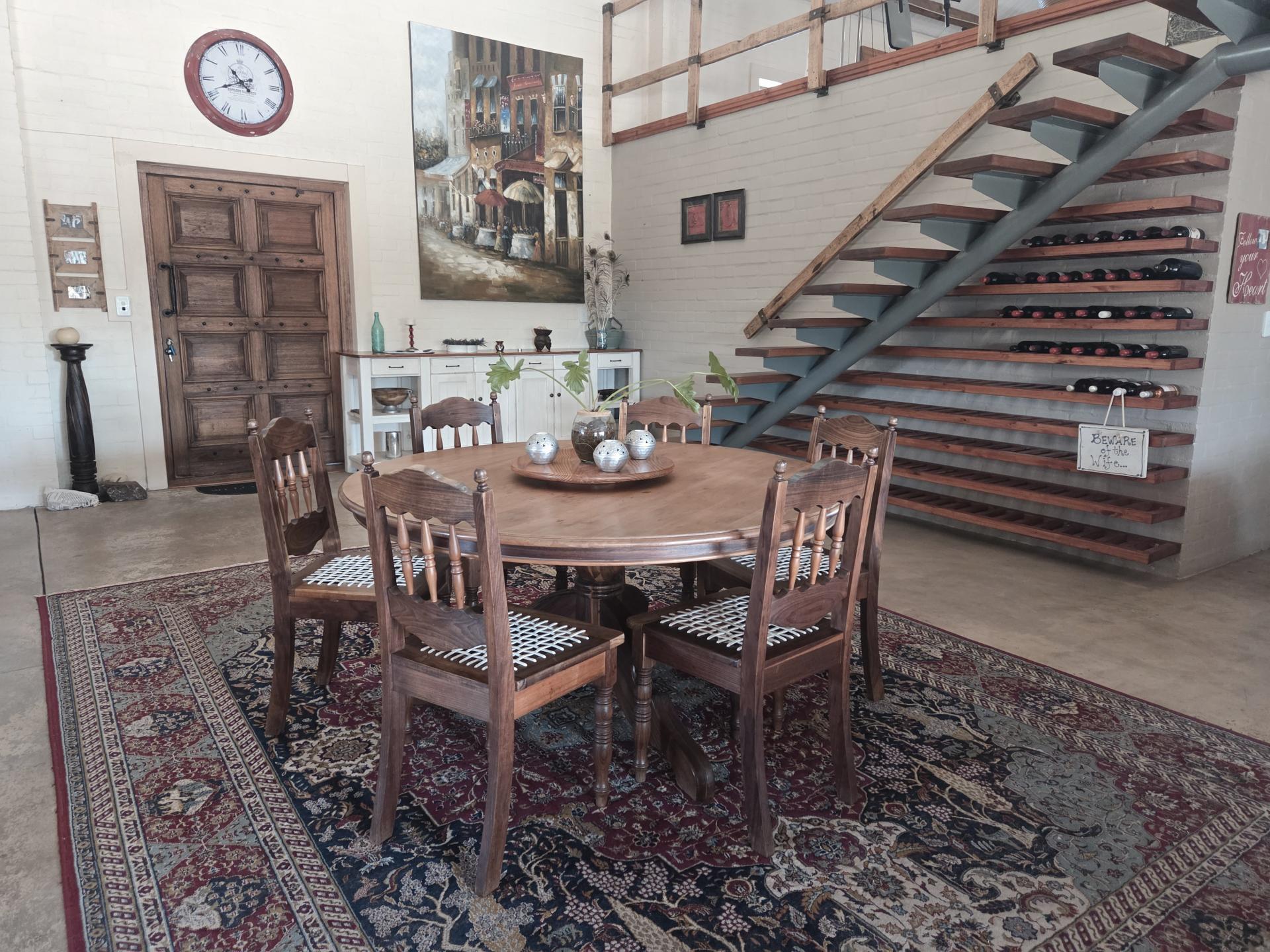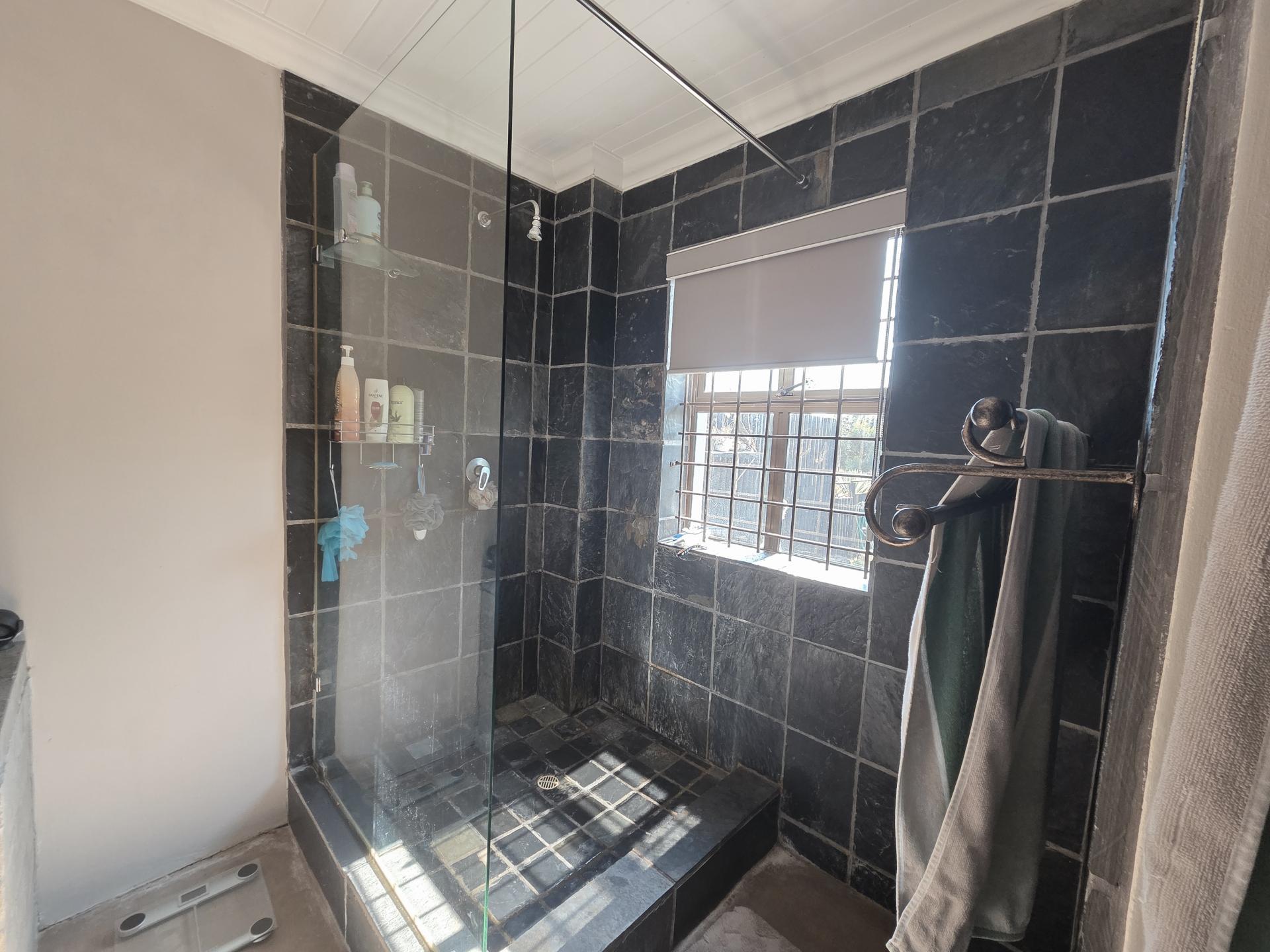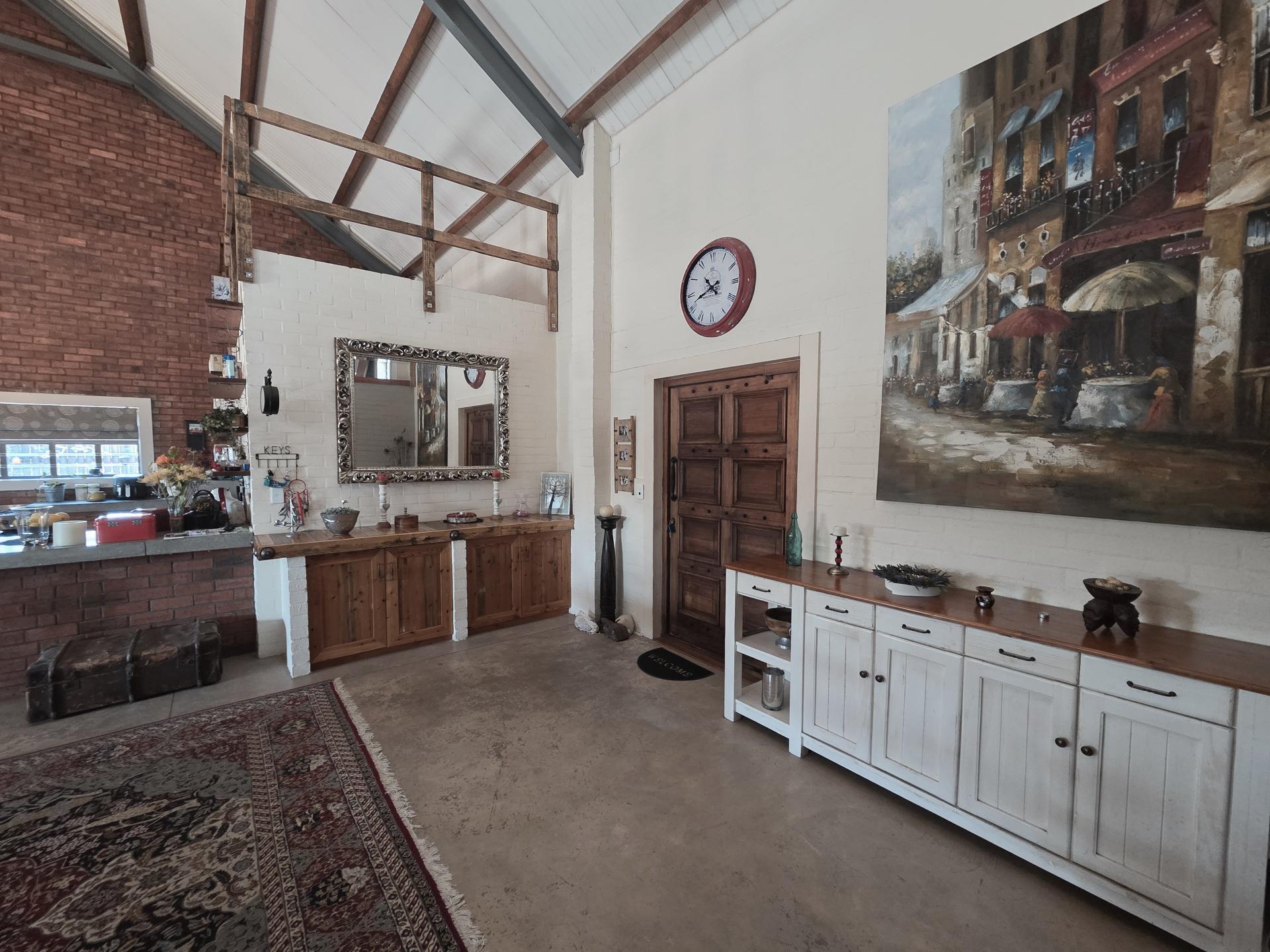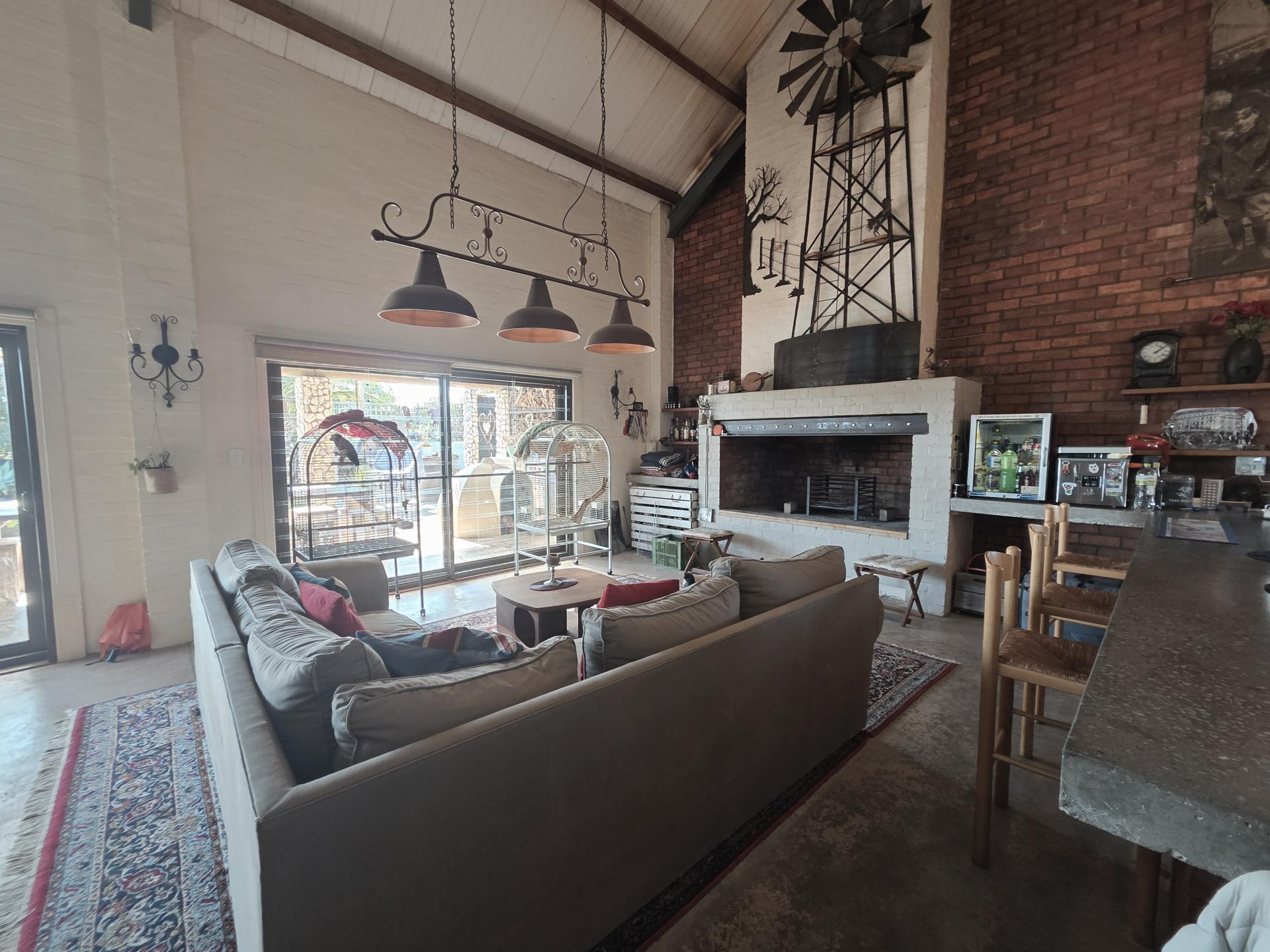 Set on 2.1 hectares of fully enclosed land, this property combines rustic charm with practical design. Inside, the home features 3 generous bedrooms and 2 bathrooms, including a spacious main suite with a walk-in closet and full en-suite. The open-plan living and dining area welcomes you with its inviting atmosphere and high vaulted ceilings, while the kitchen adds personality with its concrete finishes, separate scullery, and pantry.