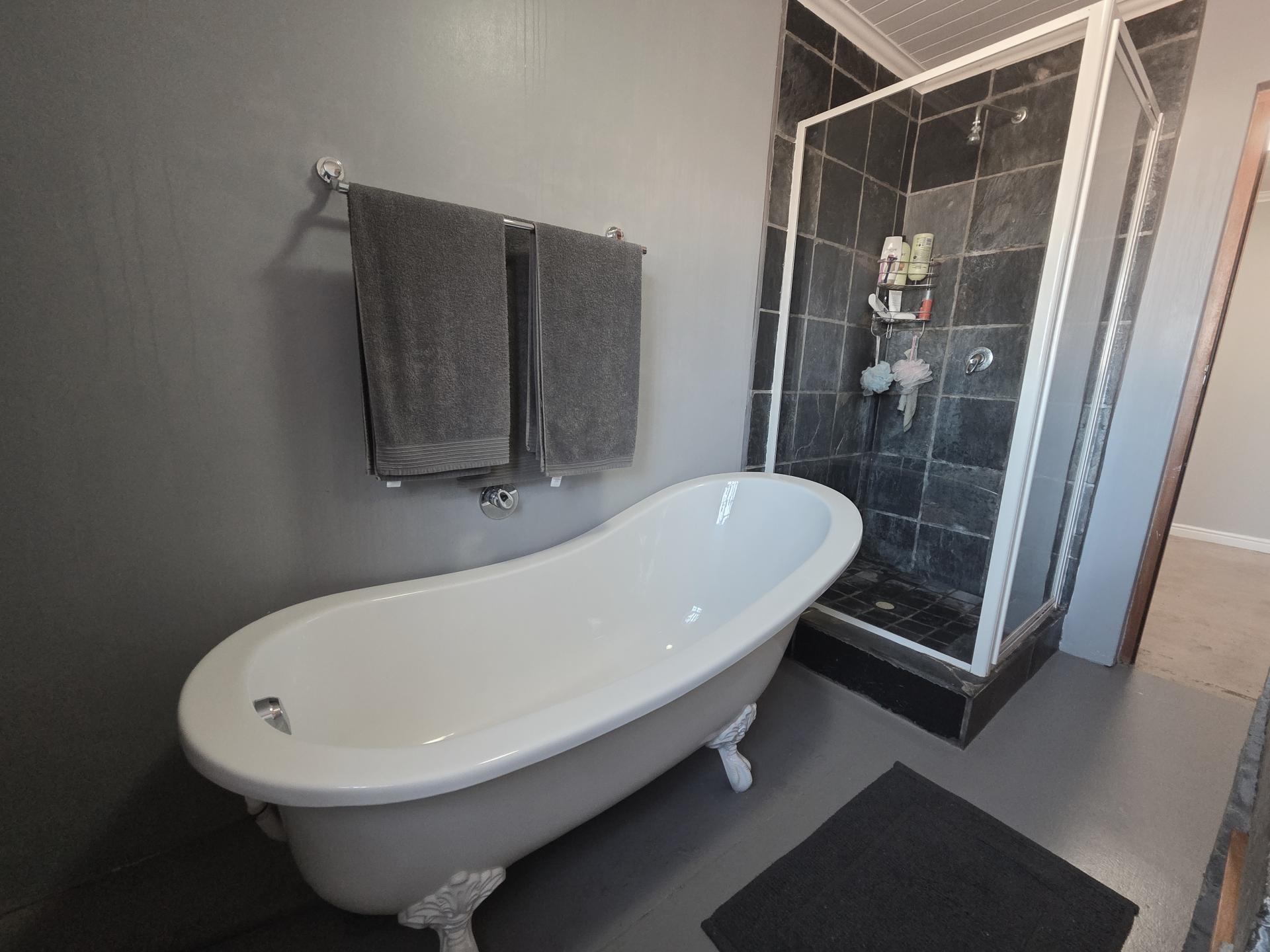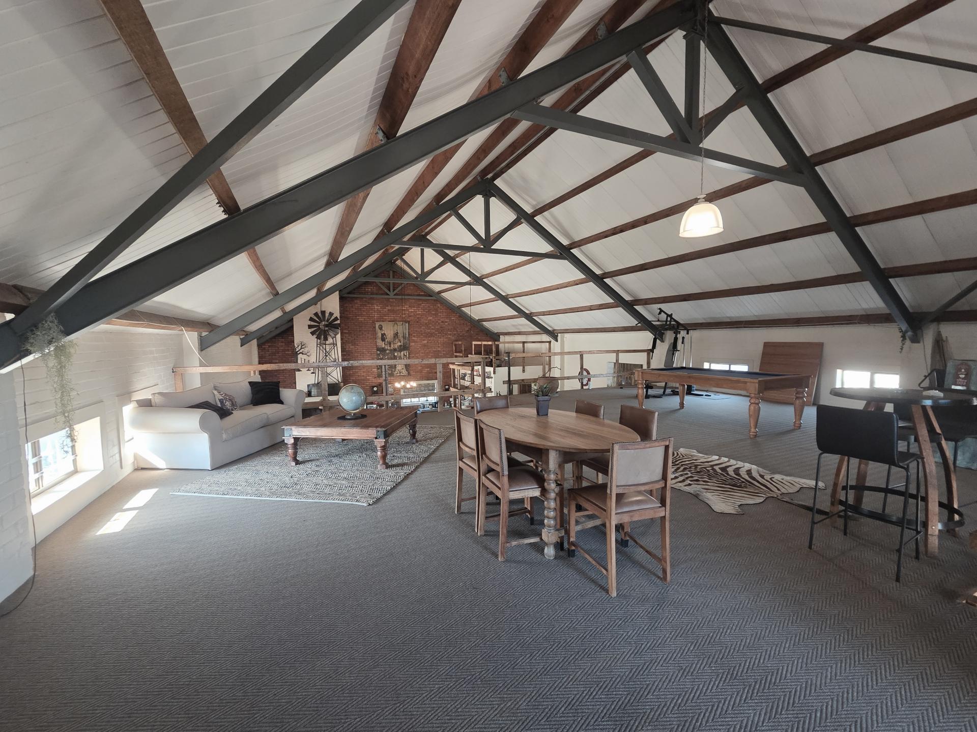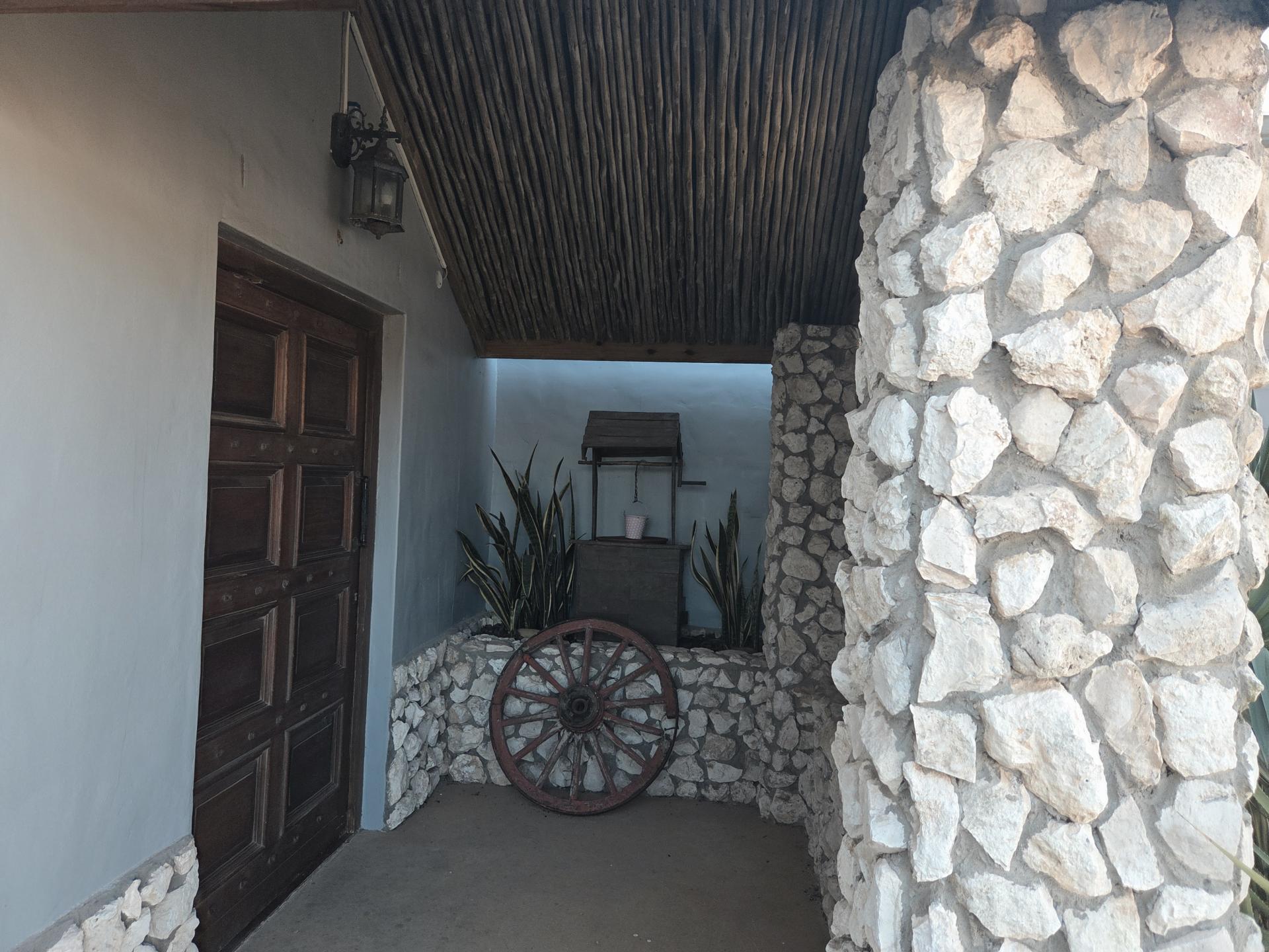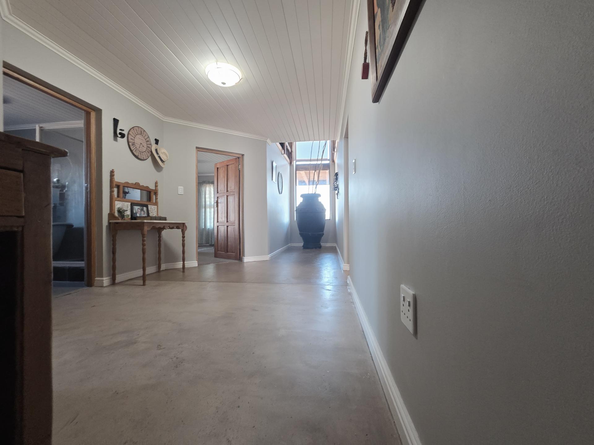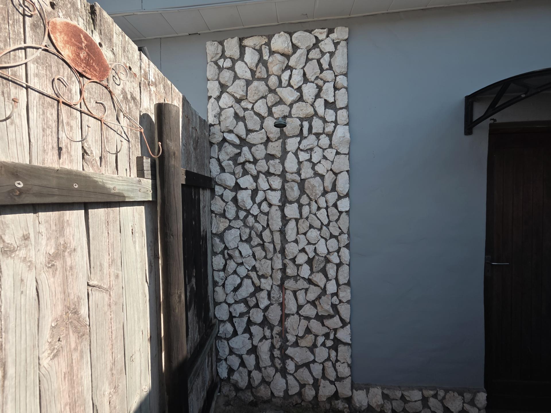 Set on 2.1 hectares of fully enclosed land, this property combines rustic charm with practical design. Inside, the home features 3 generous bedrooms and 2 bathrooms, including a spacious main suite with a walk-in closet and full en-suite. The open-plan living and dining area welcomes you with its inviting atmosphere and high vaulted ceilings, while the kitchen adds personality with its concrete finishes, separate scullery, and pantry.
