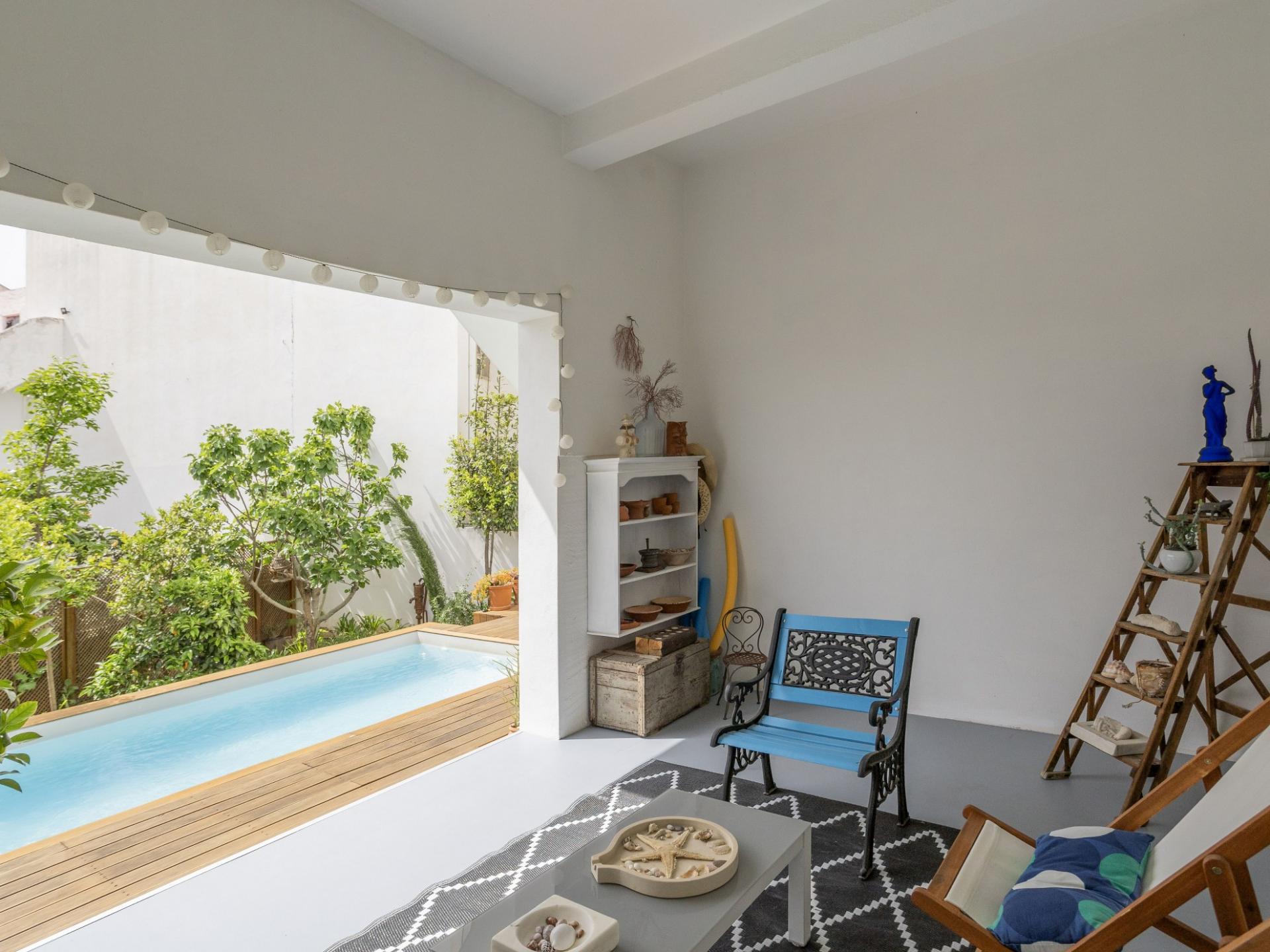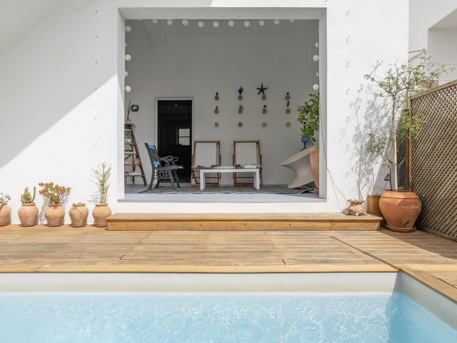Outside, mature fruit and fig trees surround a tranquil garden. The heated pool features a jet stream and is accompanied by a covered terrace, perfect for relaxing afternoons or hosting friends.