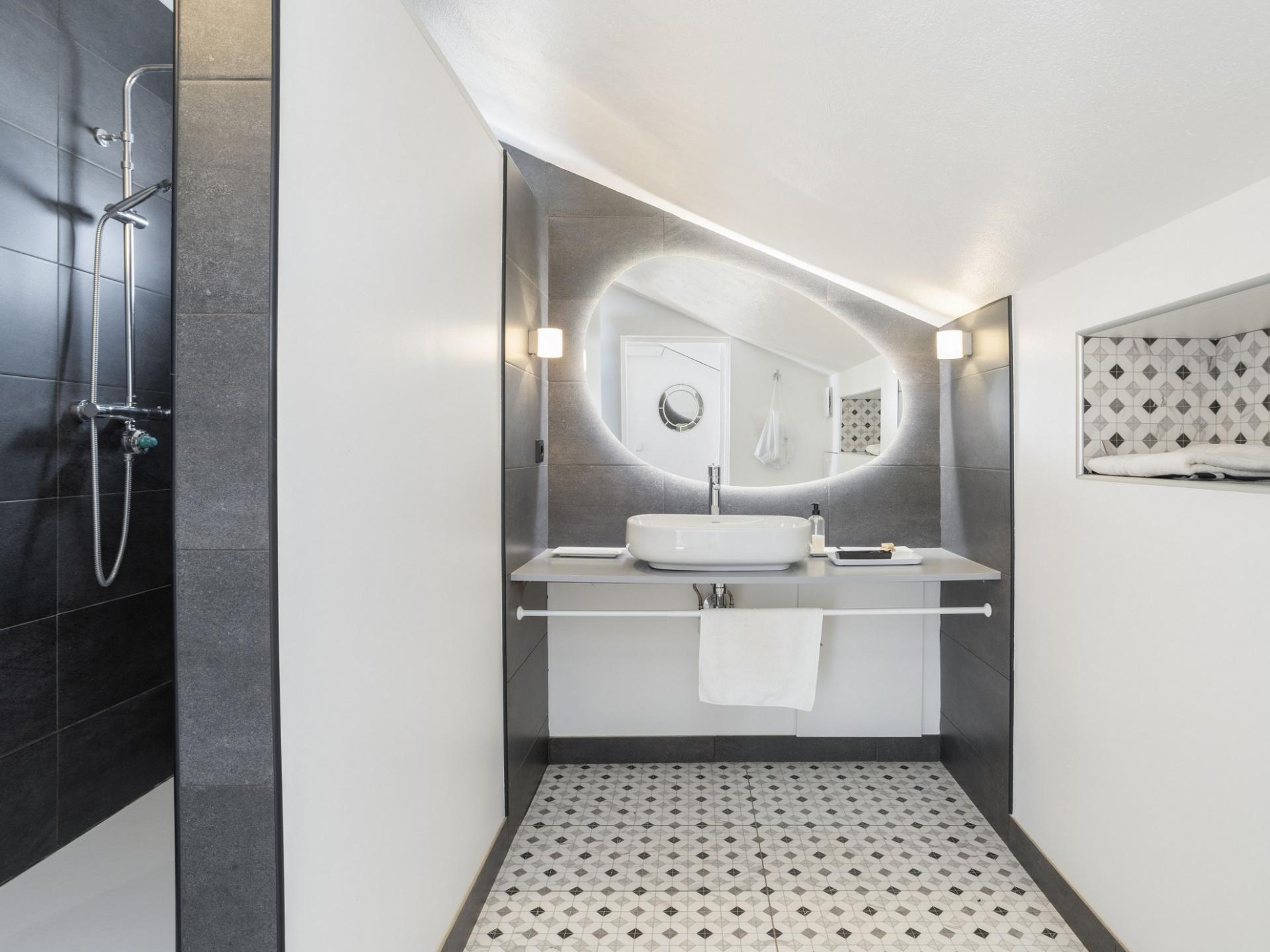 A garagem espaçosa no piso inferior inclui casa de banho com duche, arrumos e espaço para vários veículos. Existe também potencial para criar um anexo independente sem comprometer o uso como garagem.