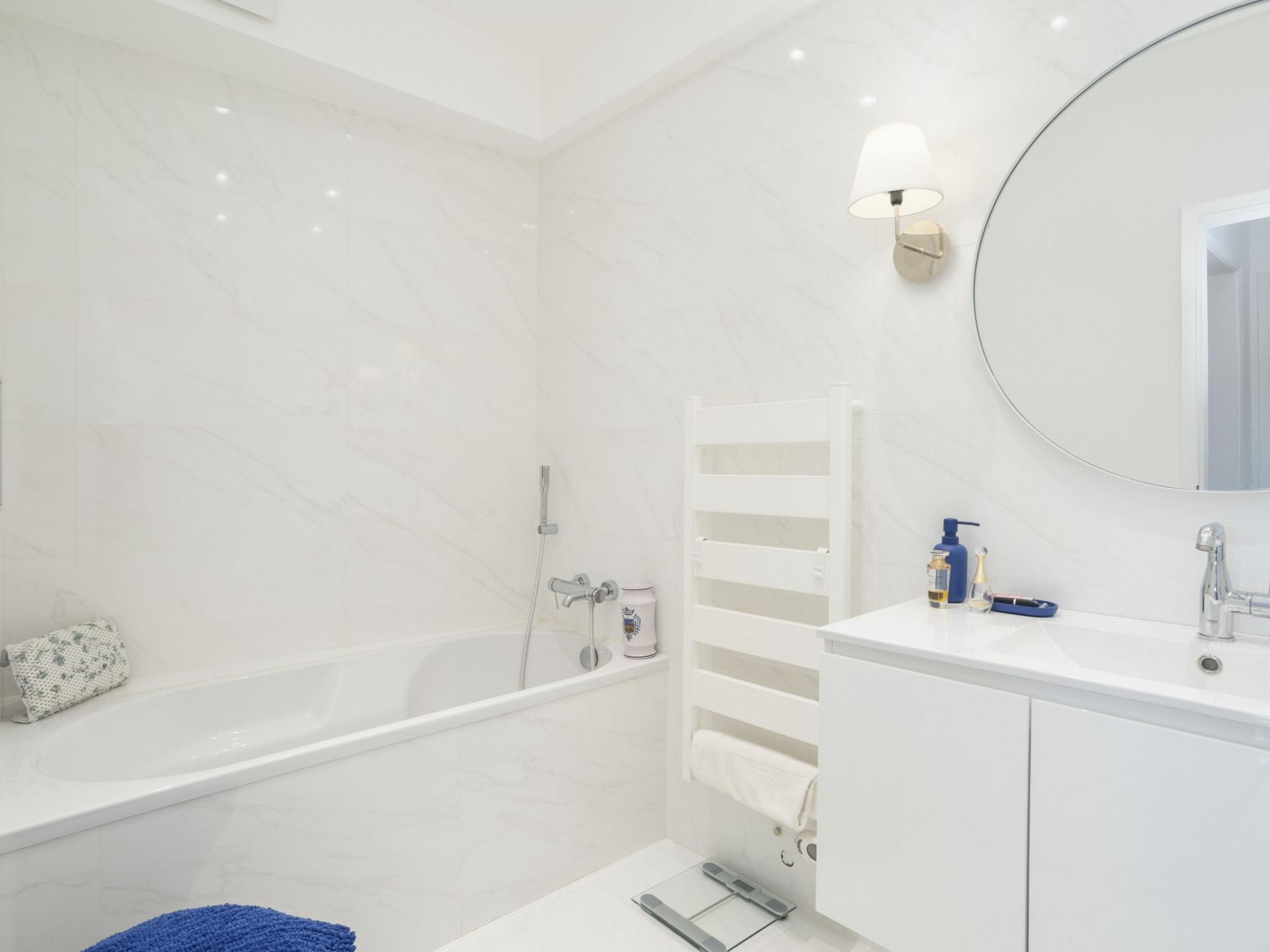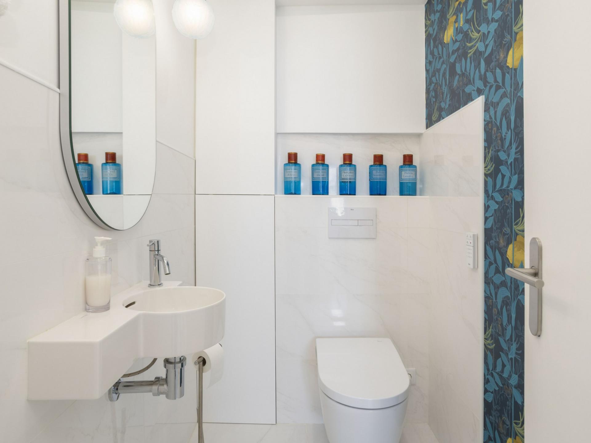 A graceful staircase leads to the main living floor, where living and dining areas extend onto both east- and west-facing terraces. A sleek, fully equipped kitchen—designed for modern living and entertaining—connects effortlessly with the social spaces. A stylish home office is seamlessly integrated, creating a versatile space for remote work or creative pursuits. A bright bedroom with fitted wardrobes, a full bathroom, and a separate guest WC complete this level.
