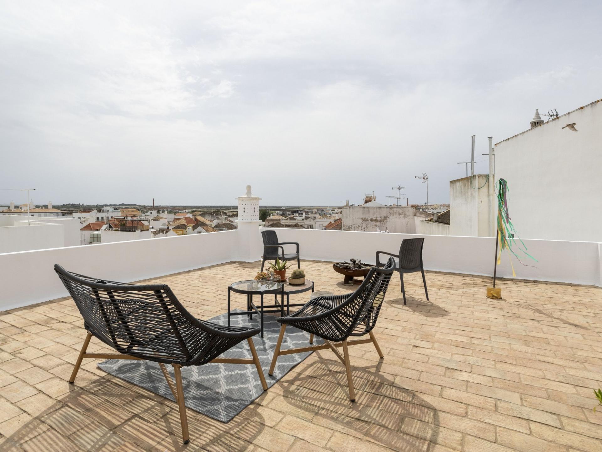 On the top floor, an additional bedroom together with a lounge opens onto a rooftop terrace with panoramic views over the Ria Formosa and the town below—ideal for soaking in the Algarve light from sunrise to sunset. A shared bathroom, separate toilet, and some useful storage space complete this level.