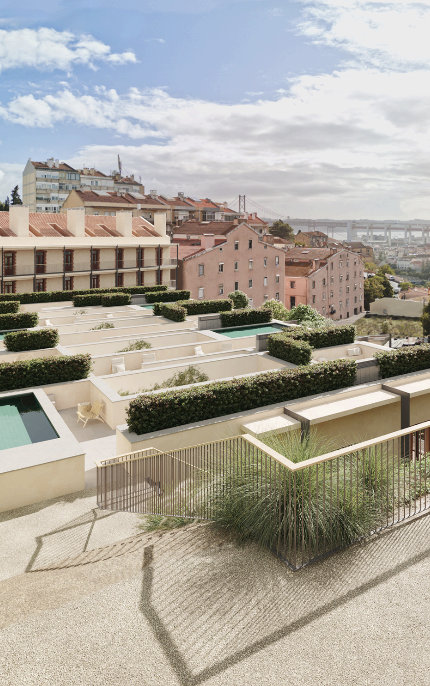 The generous plot of land (total area of 2,496.90 square meters) has allowed the extension of the existing building in three volumes: the original Vila do Tijolo building (28 residential units), the Art Deco building (2 residential units) and the townhouse complex (5 residential units), creating a total of 35 residential units.
