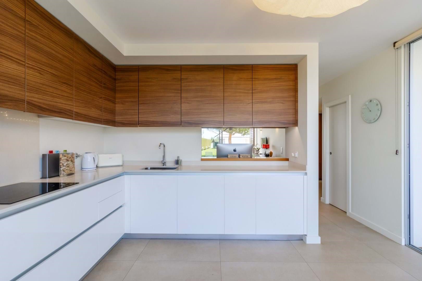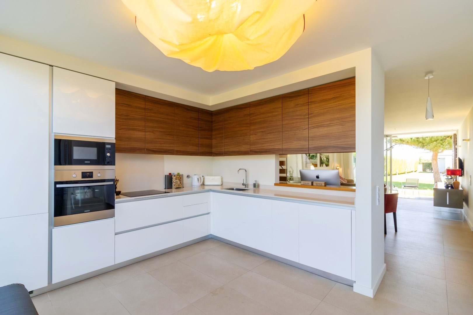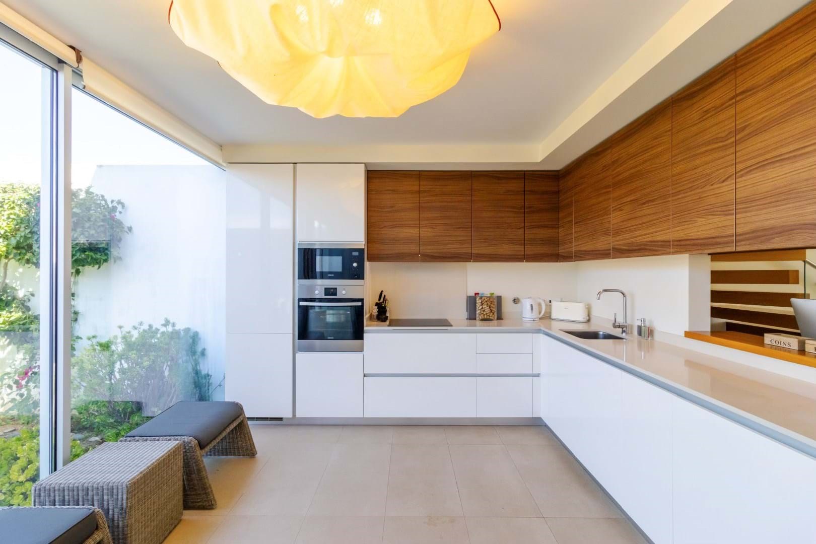 The modern, fully fitted kitchen is framed by two walls of glass that open to the rear garden and patio, making this home perfect for indoor-outdoor living.