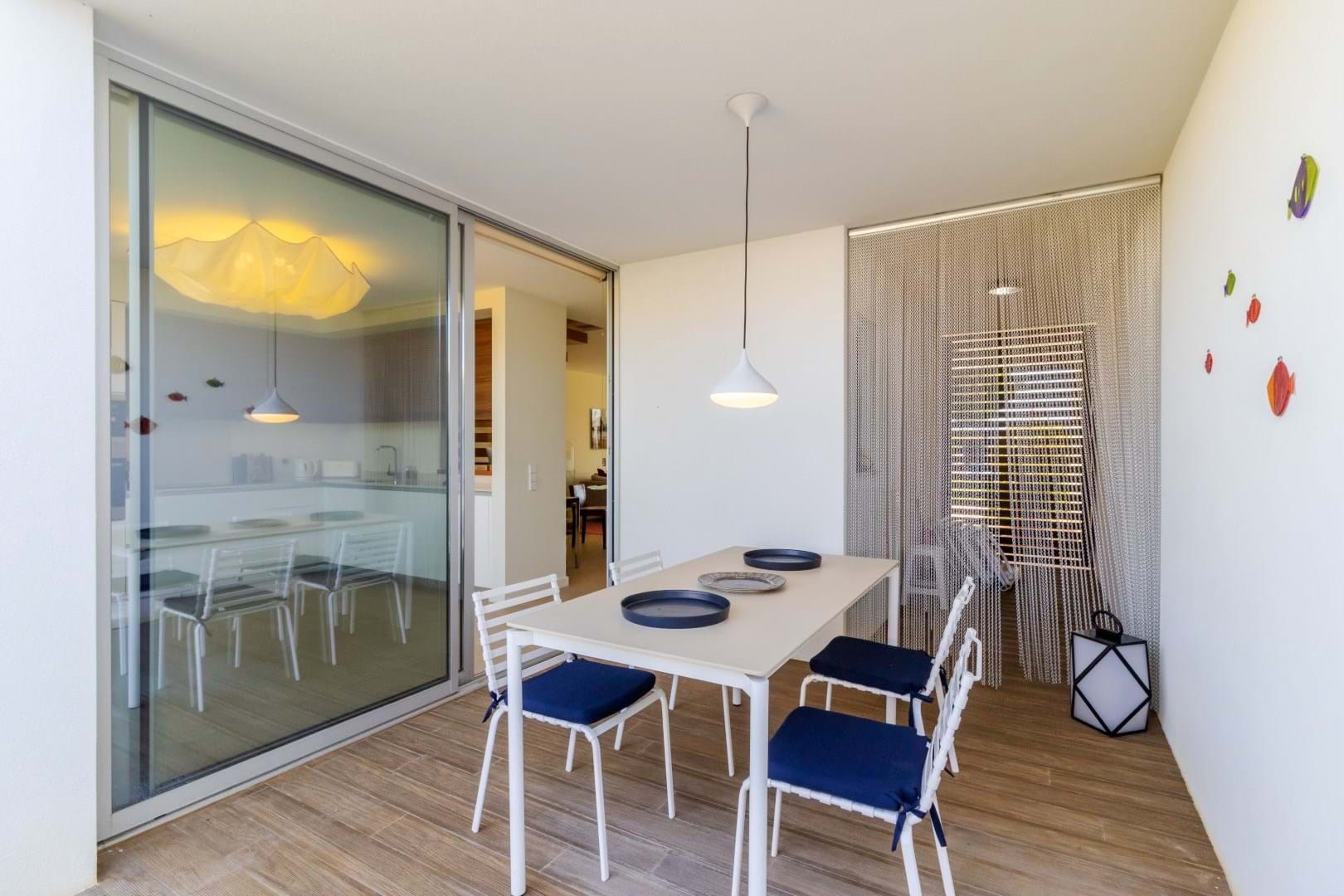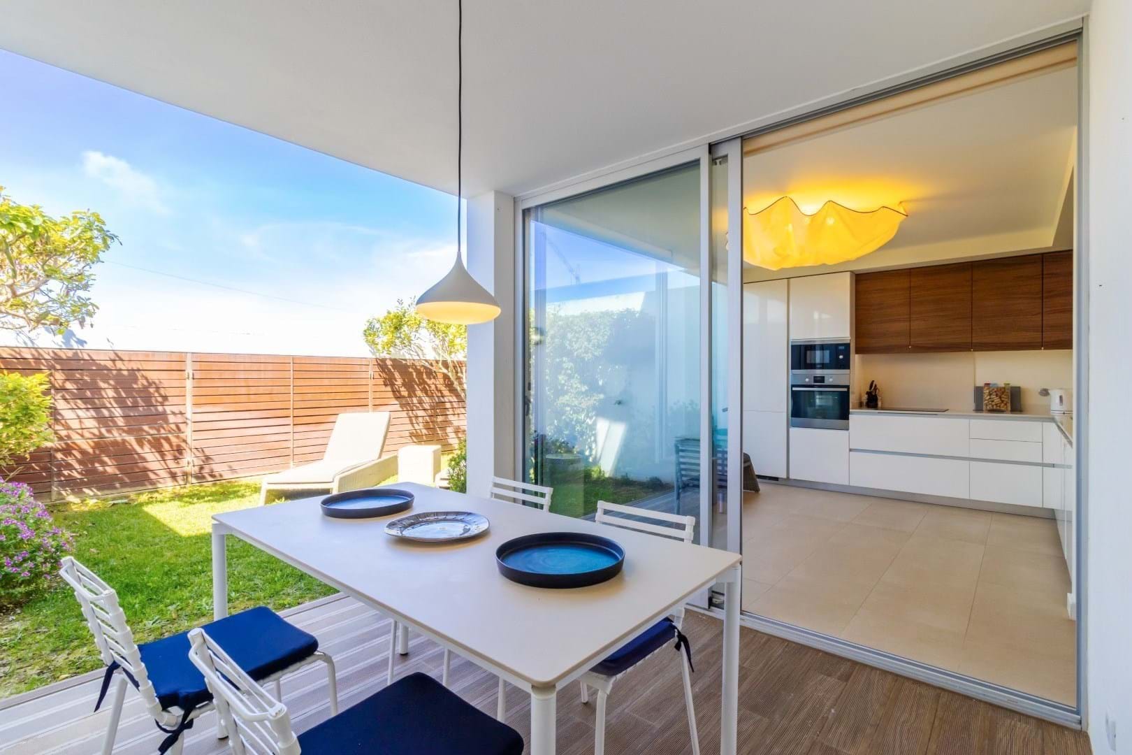 The entrance leads to a bright and spacious lounge-diner, complete with large sliding doors that open onto the front patio and garden, creating a seamless flow to the communal pool area.