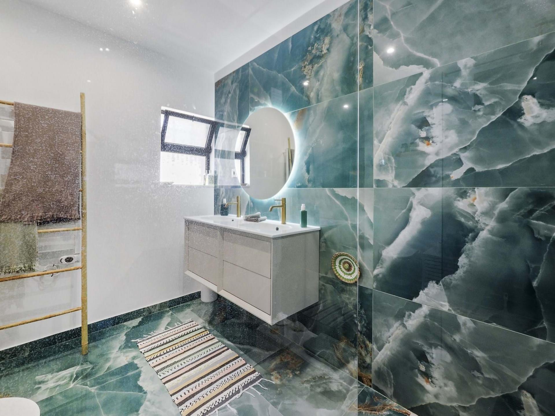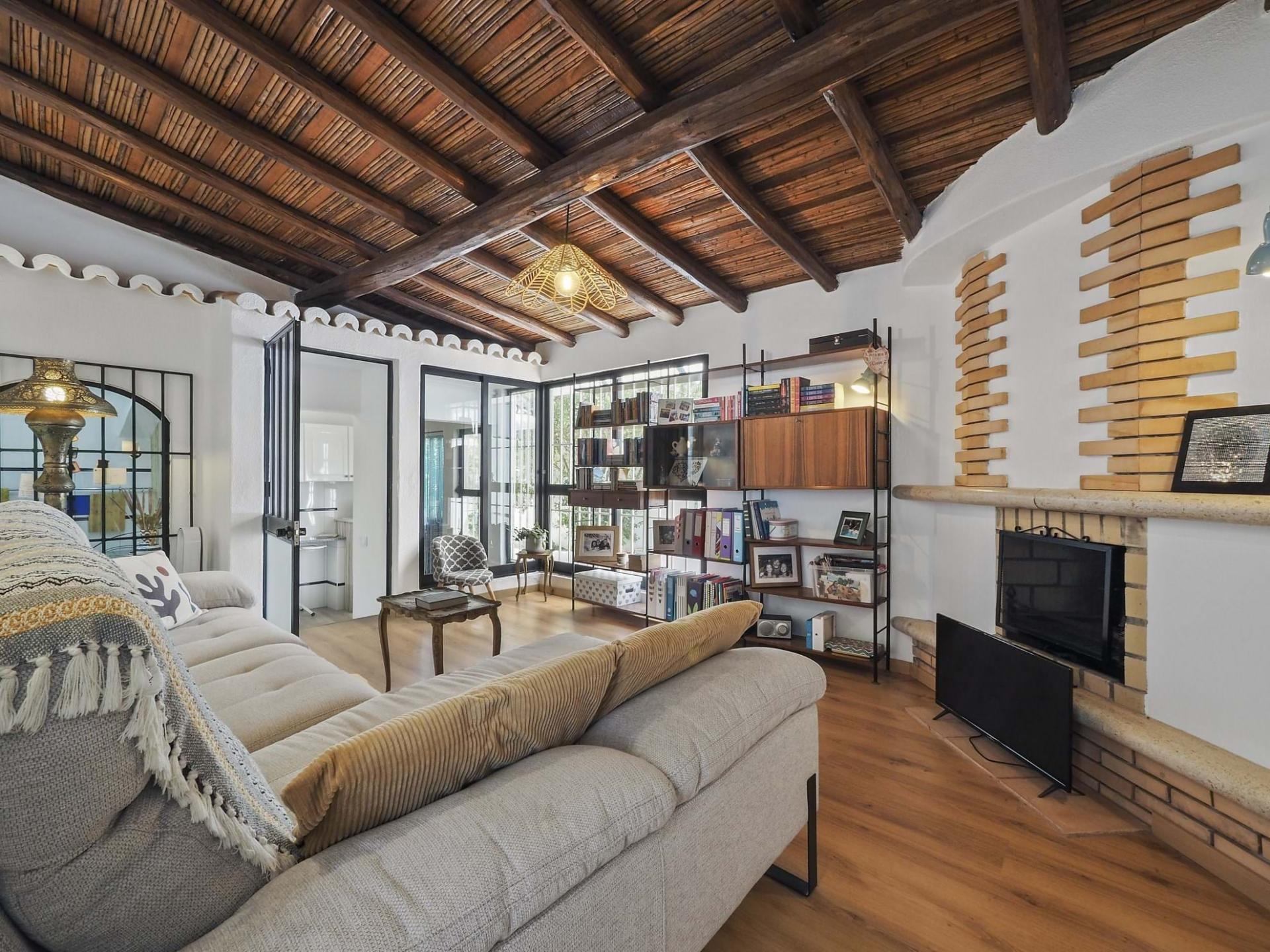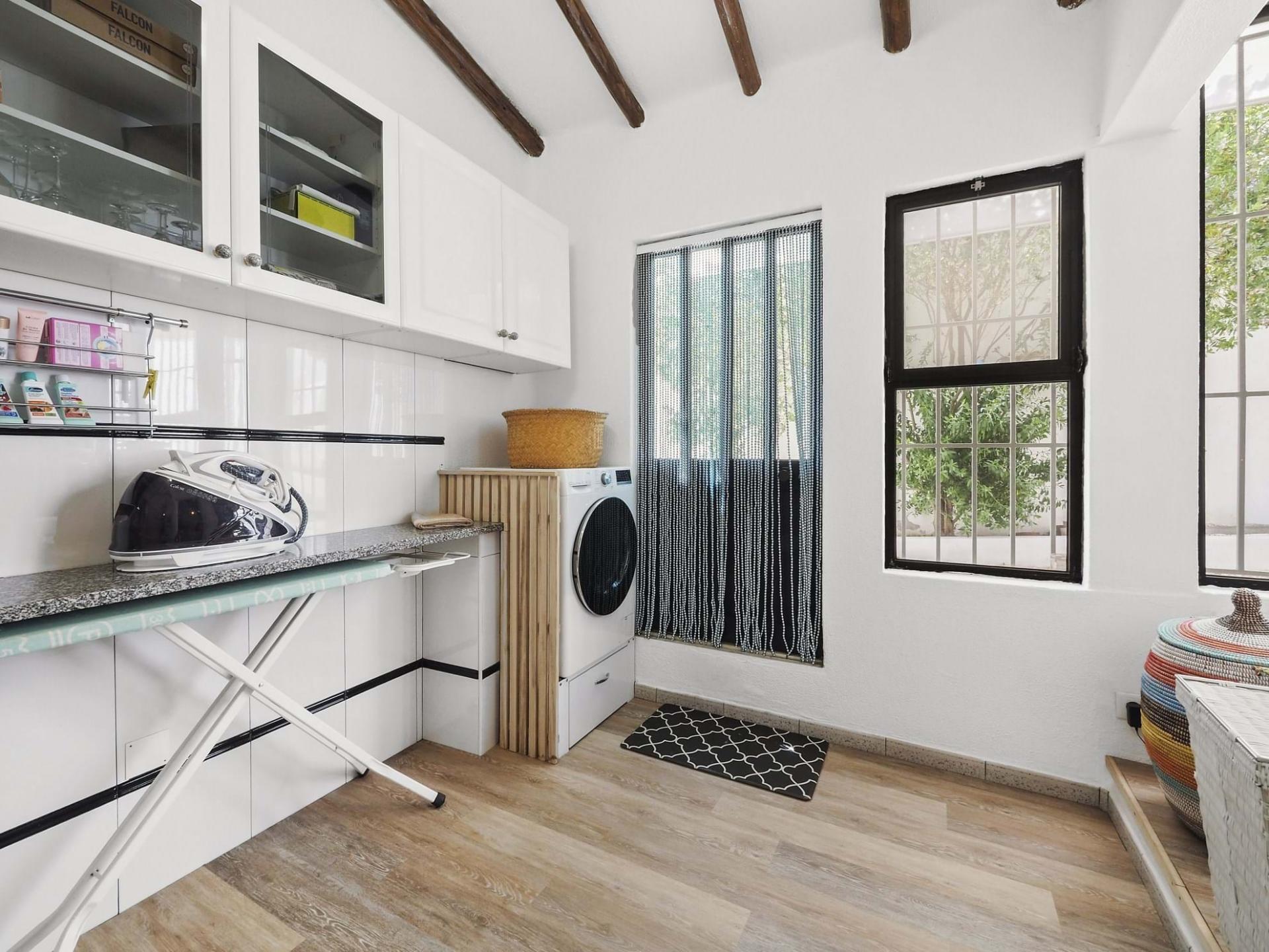 The main living area is open and bright, combining a modern kitchen with a laundry area next to it with access to another room used as an extra sitting area that connects to one of the bedrooms, dining room, and sitting area with a central fireplace — ideal for family life or entertaining. A small bar in the entrance hall. Large windows and sliding doors connect the interior seamlessly to the outdoor areas.