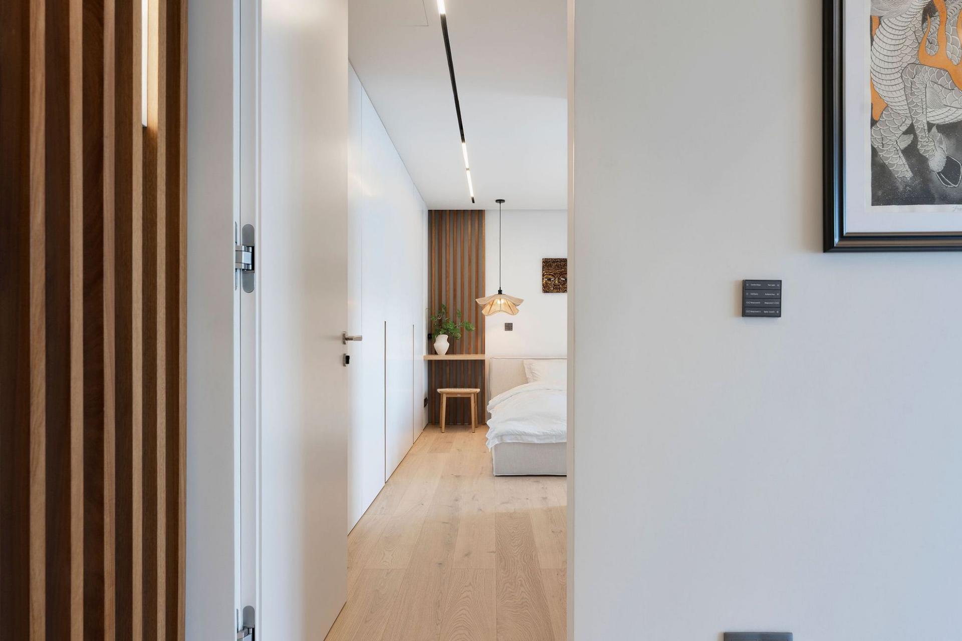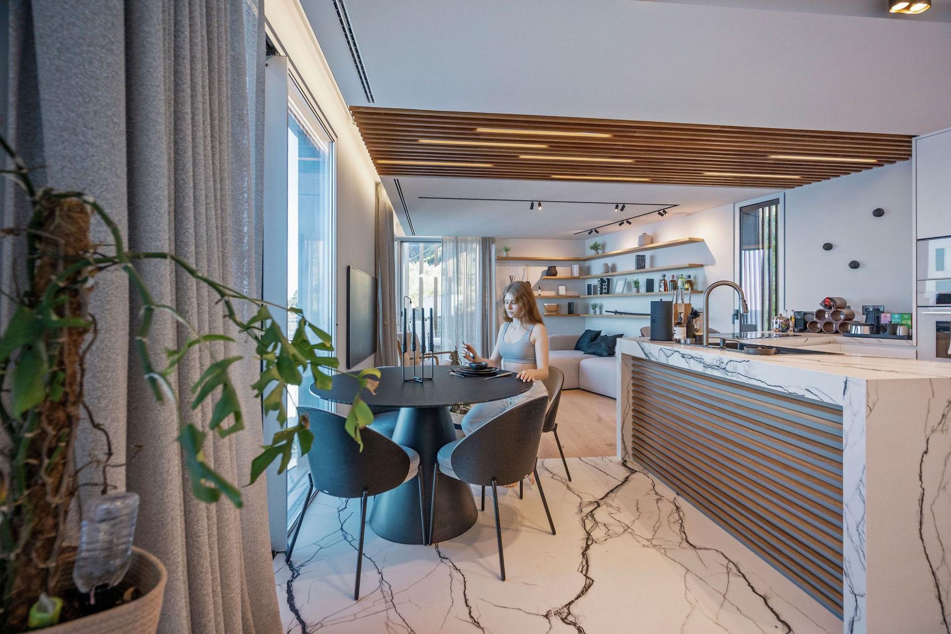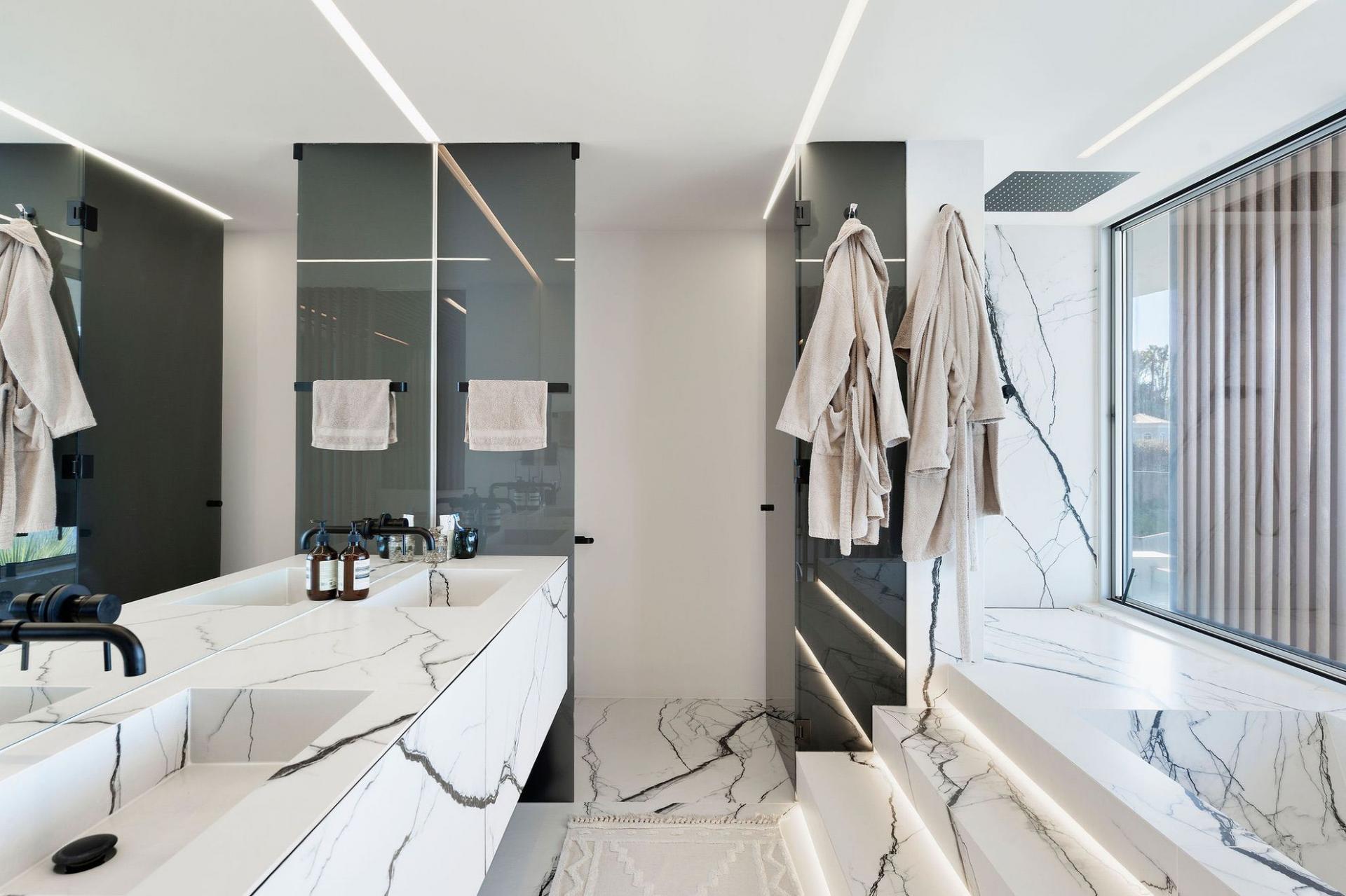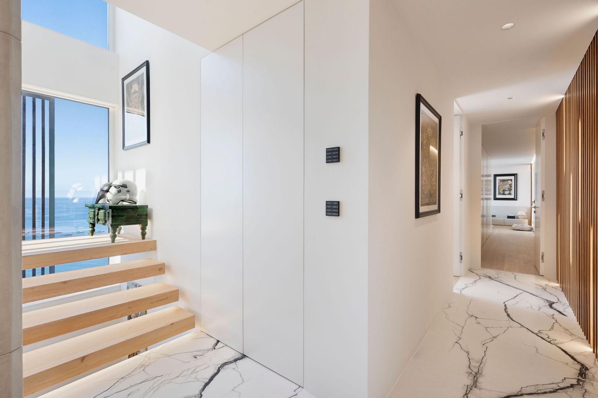 Entertainment is effortless here: the lower floor hosts a 36 m² infinity pool with immersed sun loungers, an outdoor cinema, gas fireplace, BBQ bar, and multi‑level garden lounges. Smart-home technology (with Siri voice control), ambient lighting, and a private study/library enhance daily living. A heated jacuzzi, plunge pool, private laundry room, garage, and guest parking complete the package.