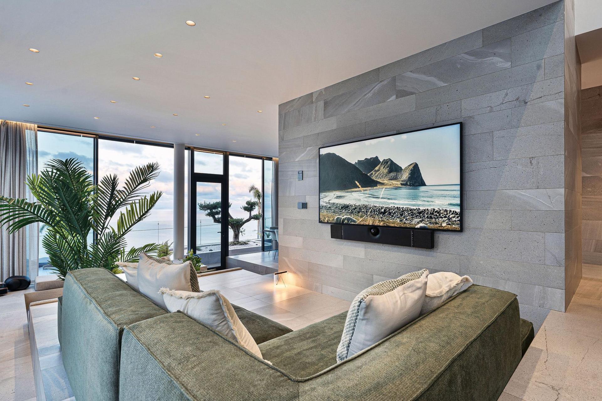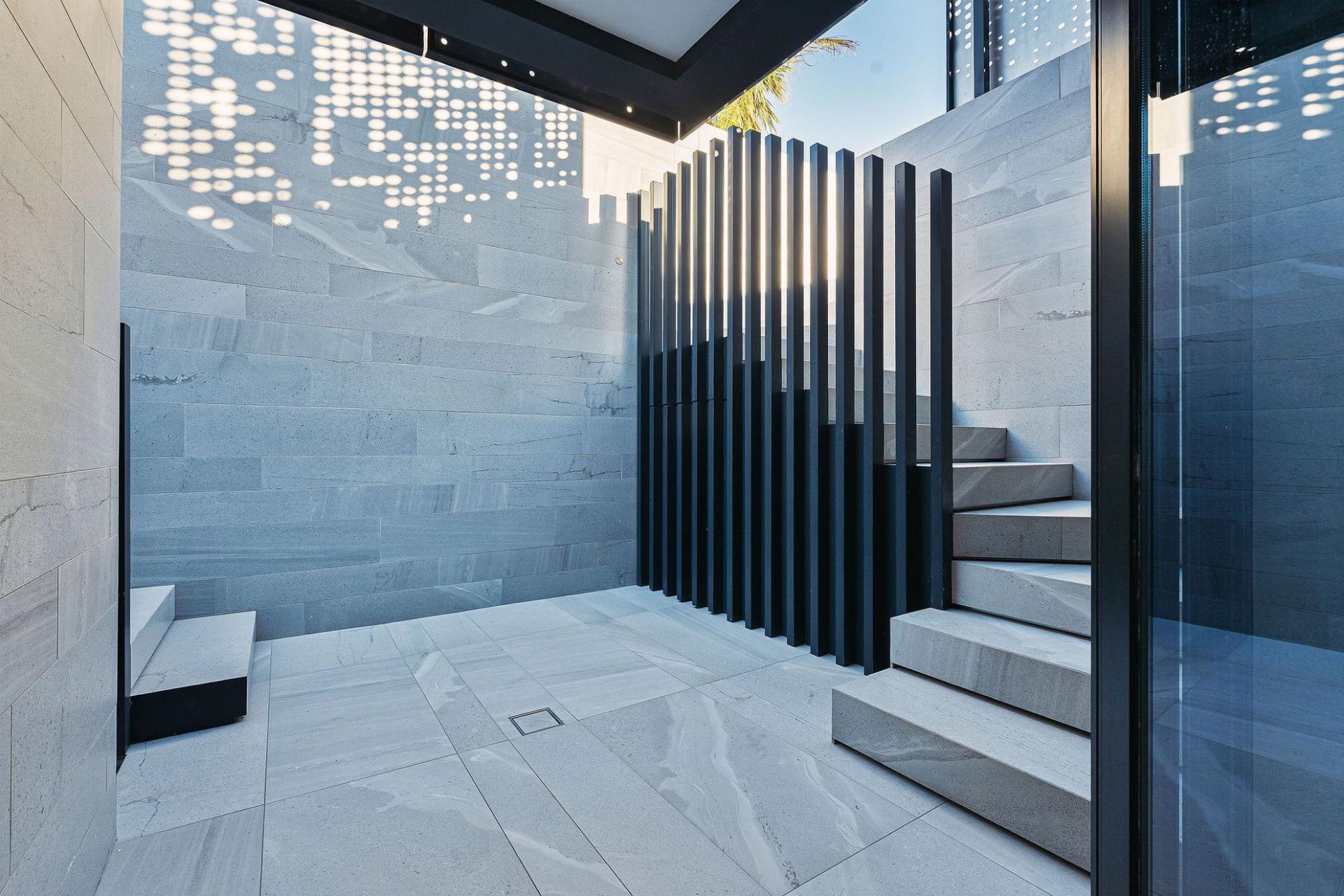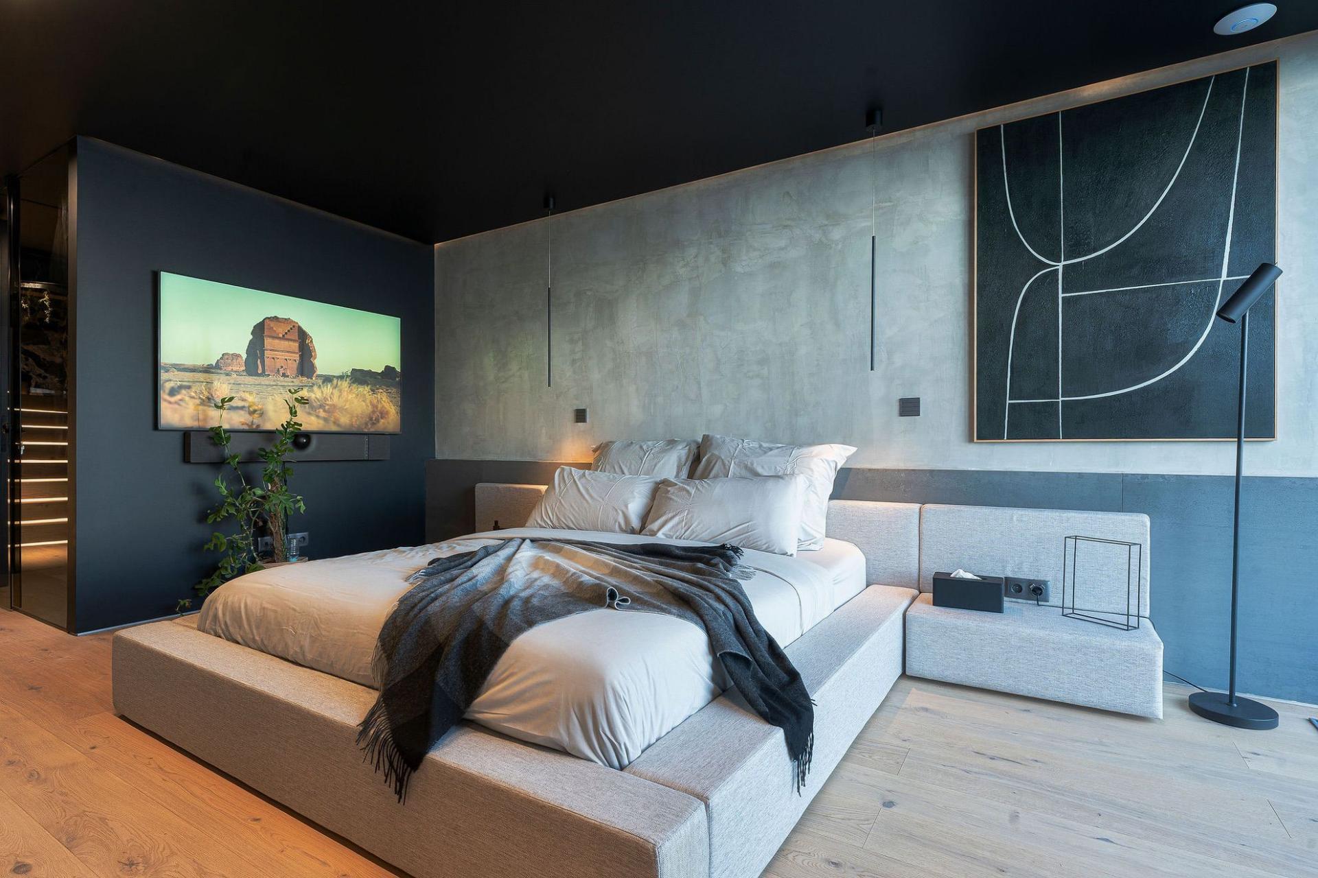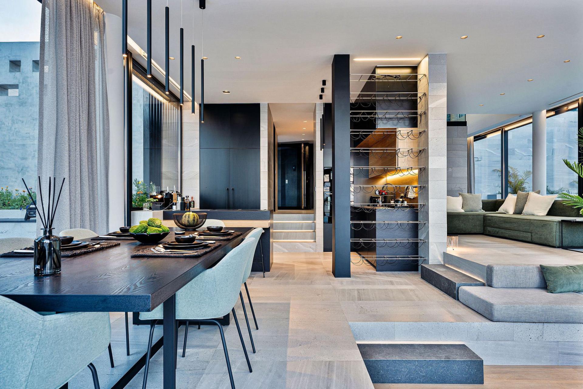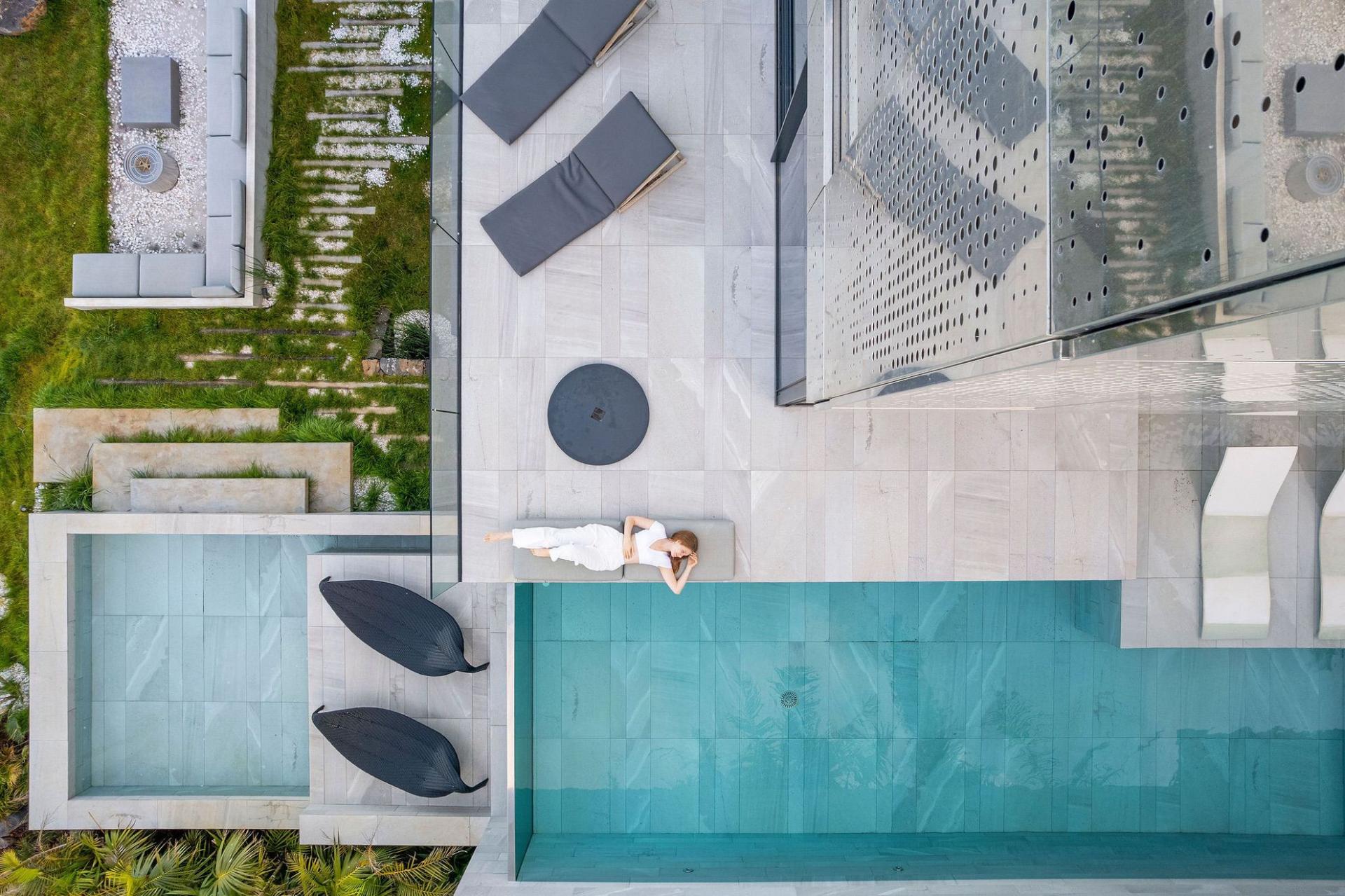 Inside, the open-plan layout includes a spacious living area, dining space, kitchen, private library, gym, and sauna. Each of the three bedrooms features its own en-suite bathroom, with the master suite offering a Roman spa experience. Entertainment is elevated with an indoor-outdoor cinema setup, full smart home integration (Face ID entry, Siri voice control, iPad panels), motorized blinds, and custom climate control throughout.