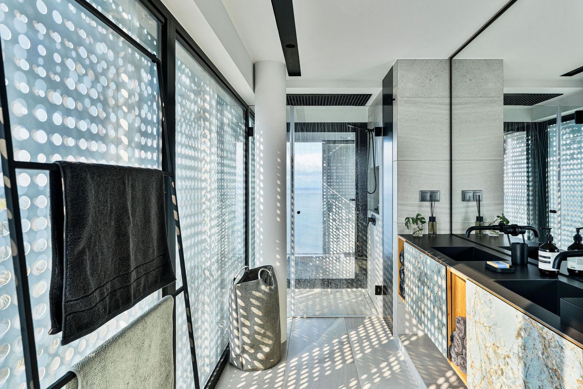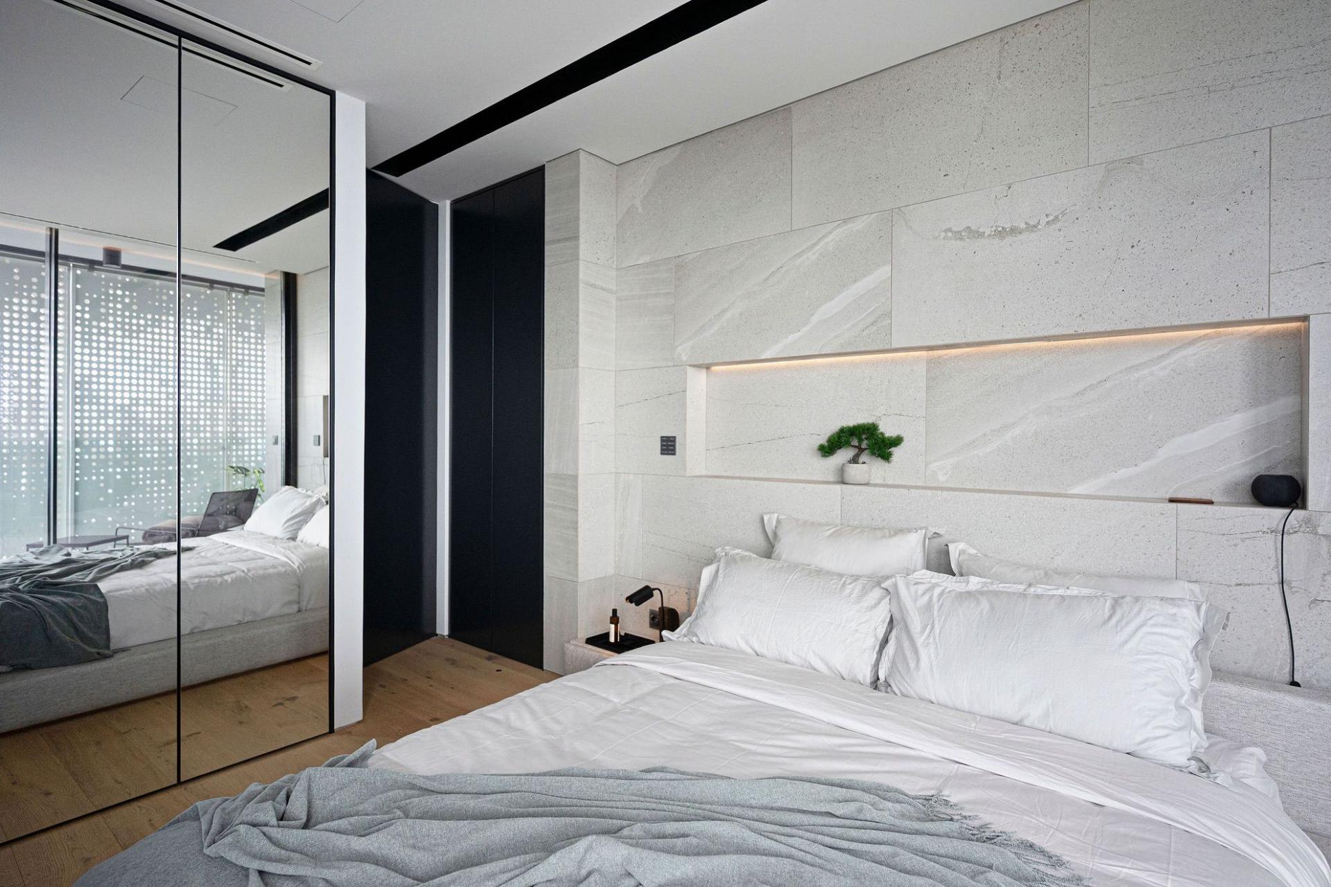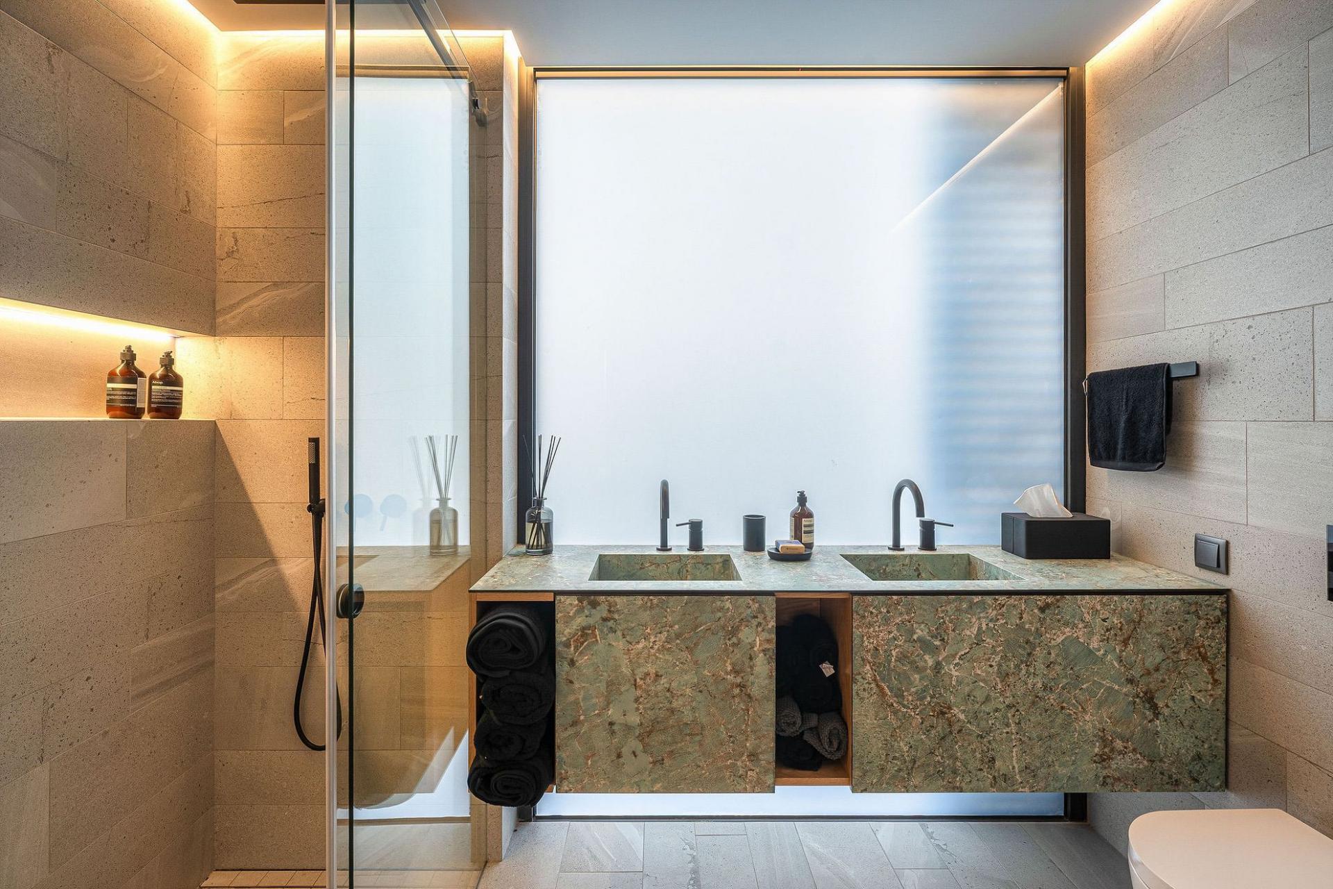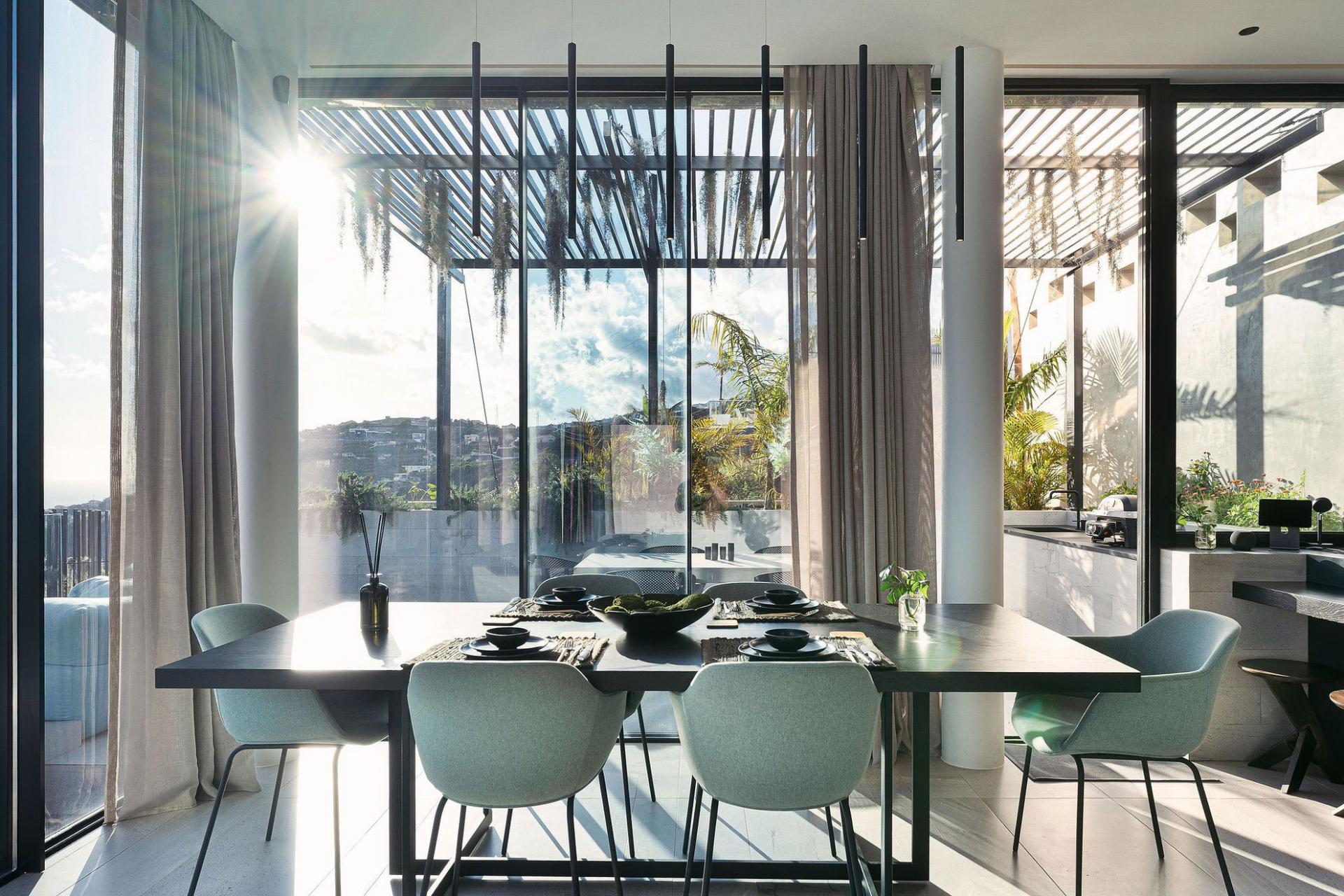 Inside, the open-plan layout includes a spacious living area, dining space, kitchen, private library, gym, and sauna. Each of the three bedrooms features its own en-suite bathroom, with the master suite offering a Roman spa experience. Entertainment is elevated with an indoor-outdoor cinema setup, full smart home integration (Face ID entry, Siri voice control, iPad panels), motorized blinds, and custom climate control throughout.