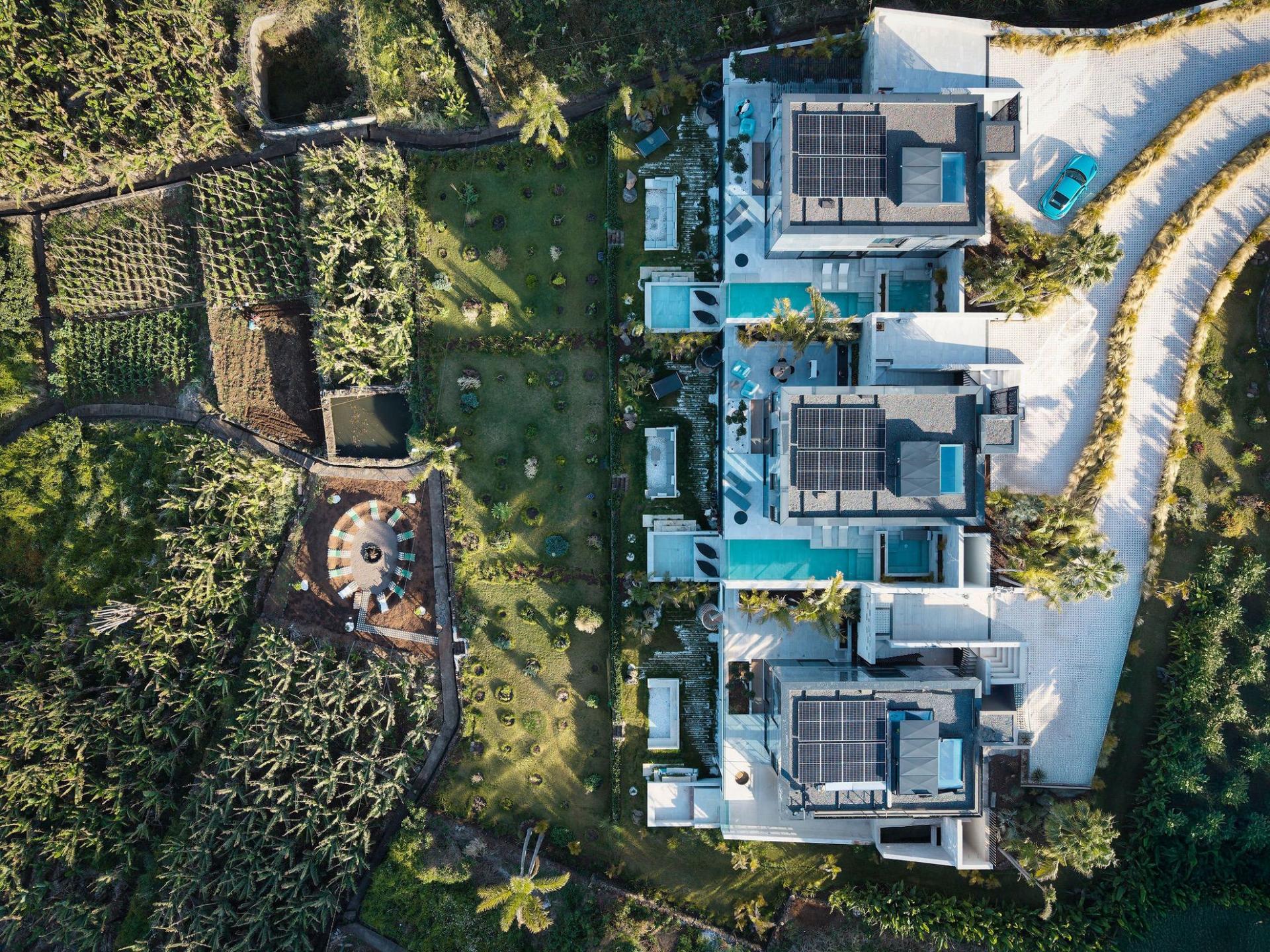 Outdoors, Saudade transforms into a wellness retreat: a magnesium infinity pool, heated jacuzzi with cascading waterfalls, mirror pool, feet-dipping lounge, private beach-style area, and three smokeless fire pits. The property also includes a permaculture vegetable garden, herb beds, fruit orchard, poolside library, and a ceremonial lounge for yoga, meditation, or gatherings. Palm gardens, an automated glass façade, AirPlay/Sonos audio, and robotic maintenance features round out this tech-enhanced sanctuary.