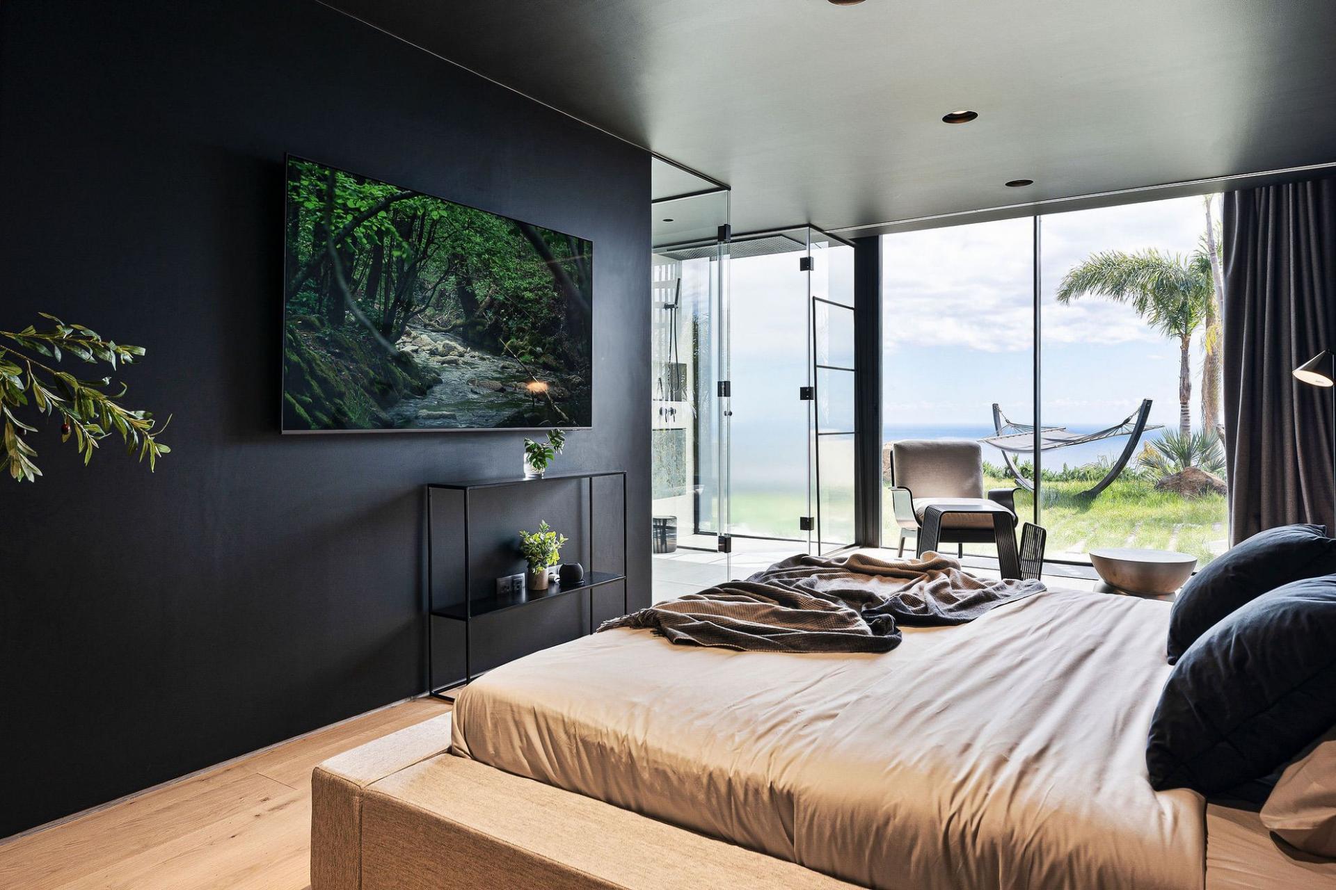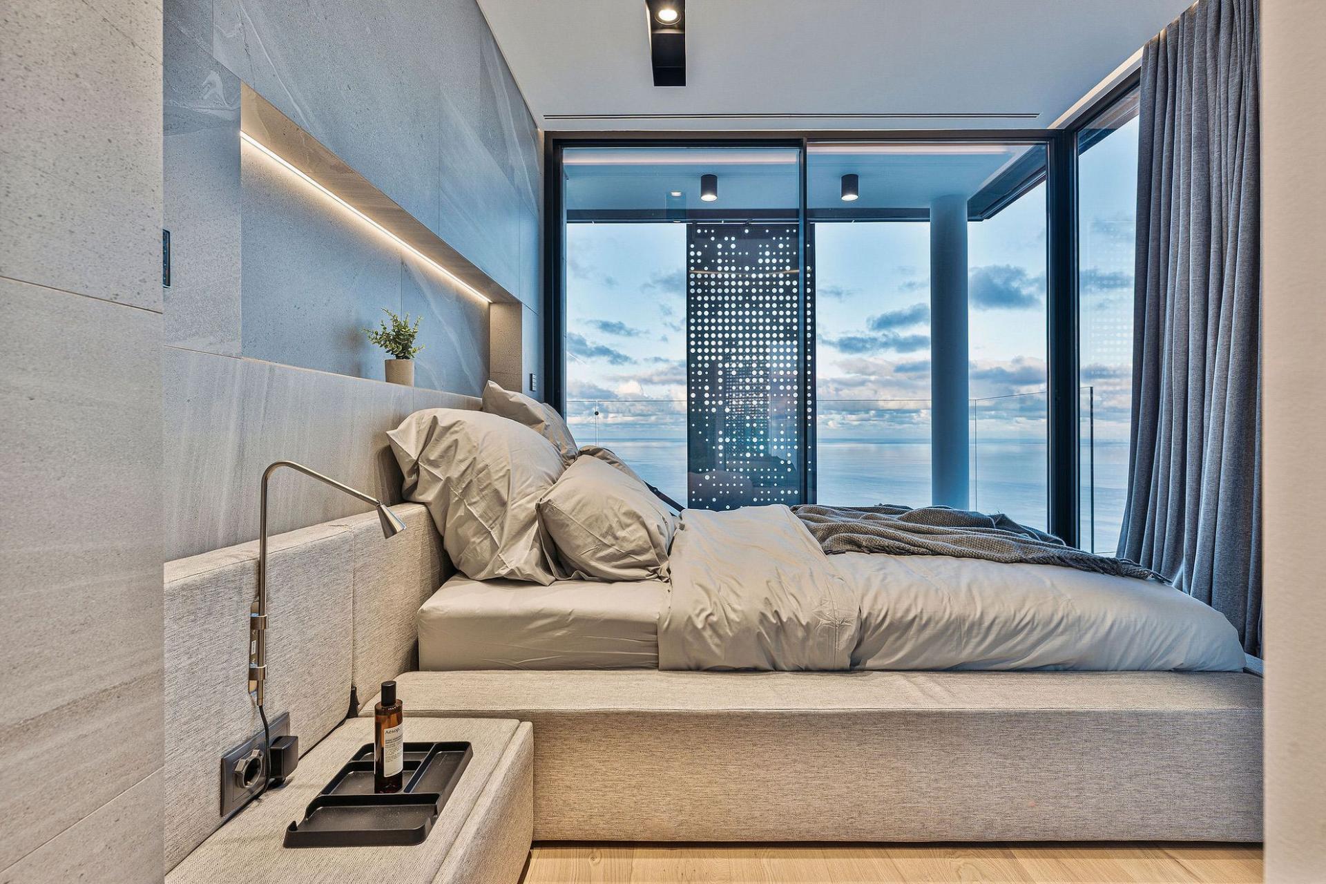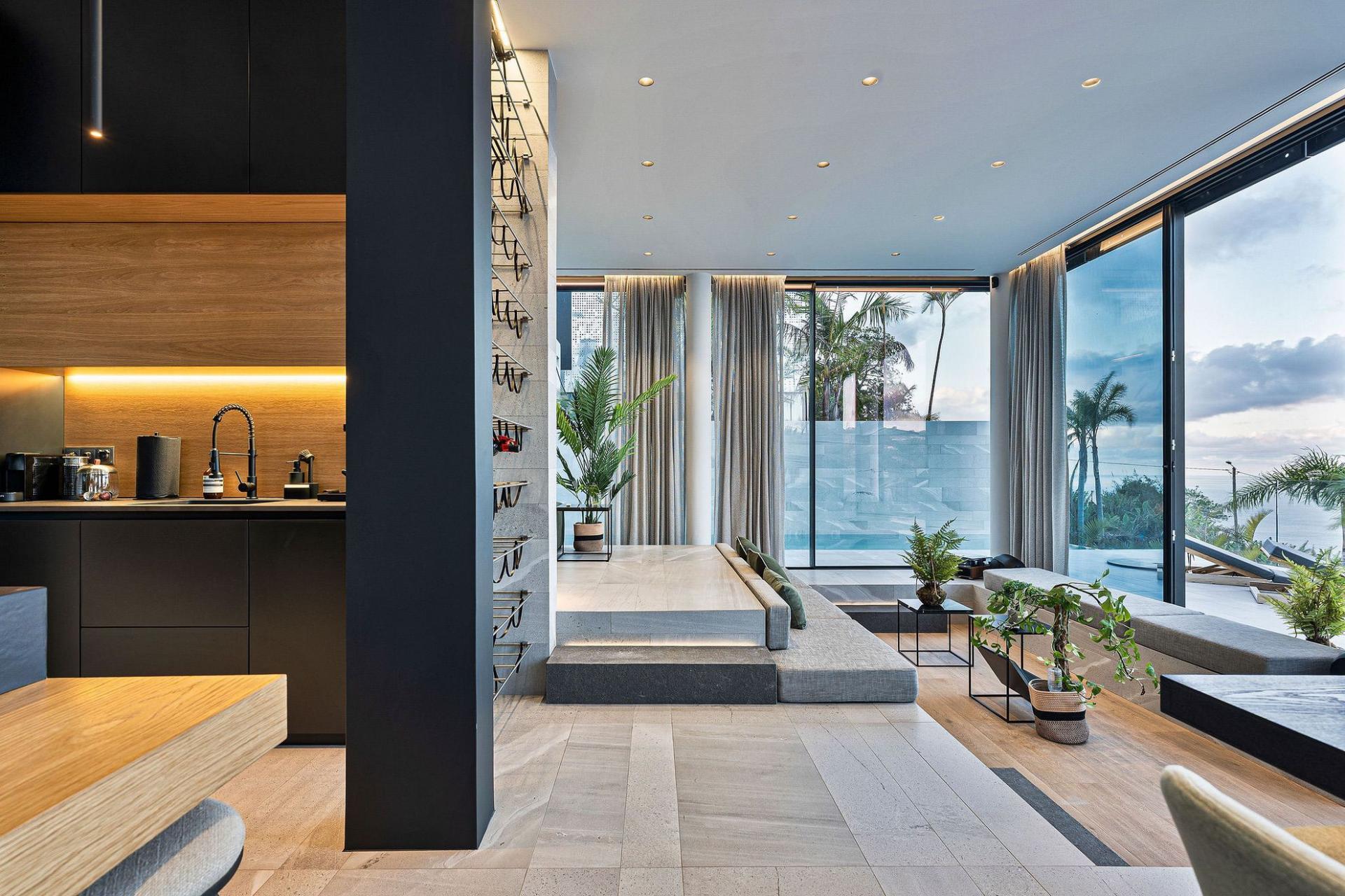 No interior, o layout aberto integra sala, sala de jantar, cozinha, biblioteca, ginásio e sauna. As três suites, incluindo a principal com spa romano, têm casas de banho privadas com chuveiro de efeito chuva. O espaço contempla cinema interior e exterior, sistemas inteligentes (face ID, Siri, iPad), cortinas elétricas e controlo climático para conforto tecnológico .