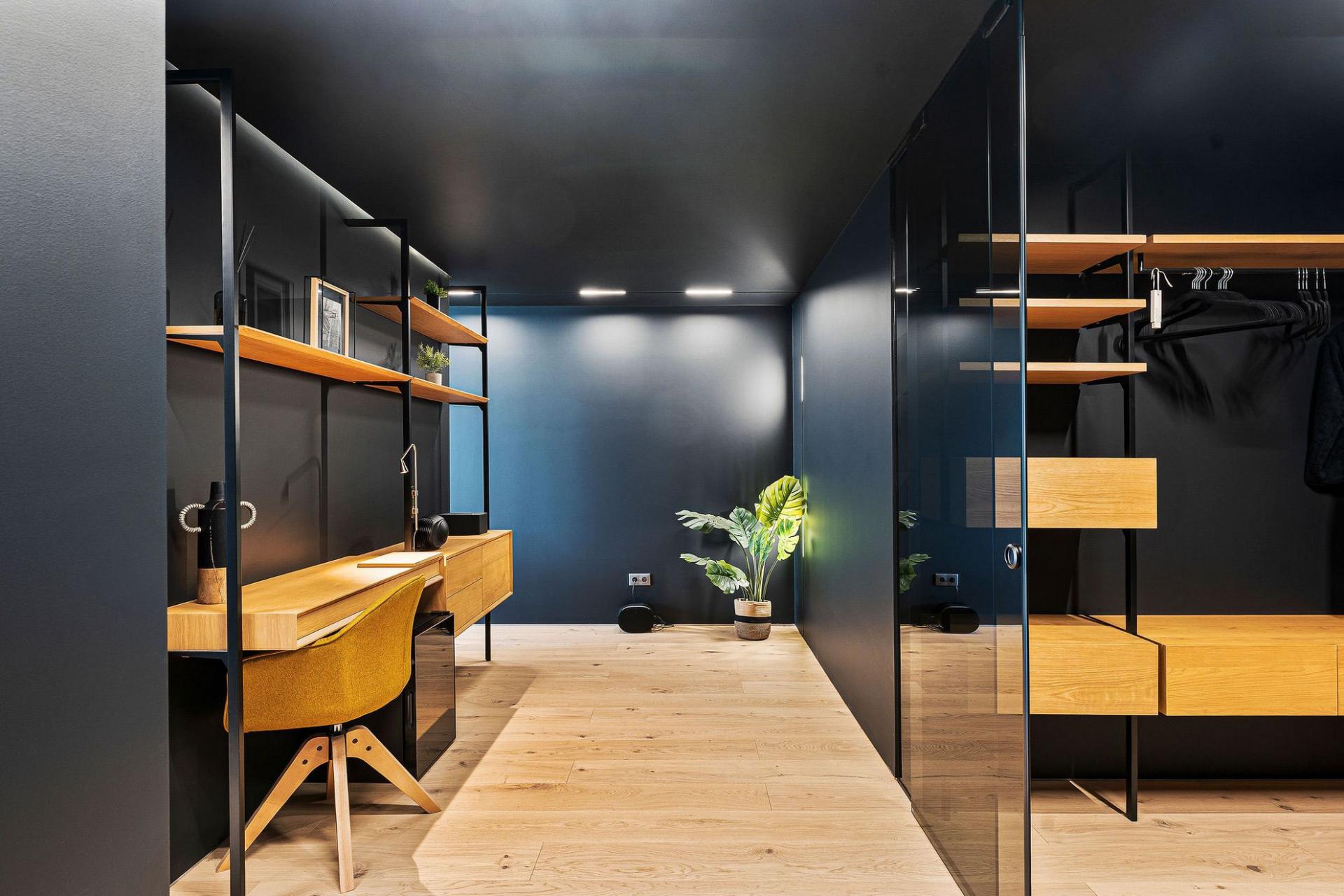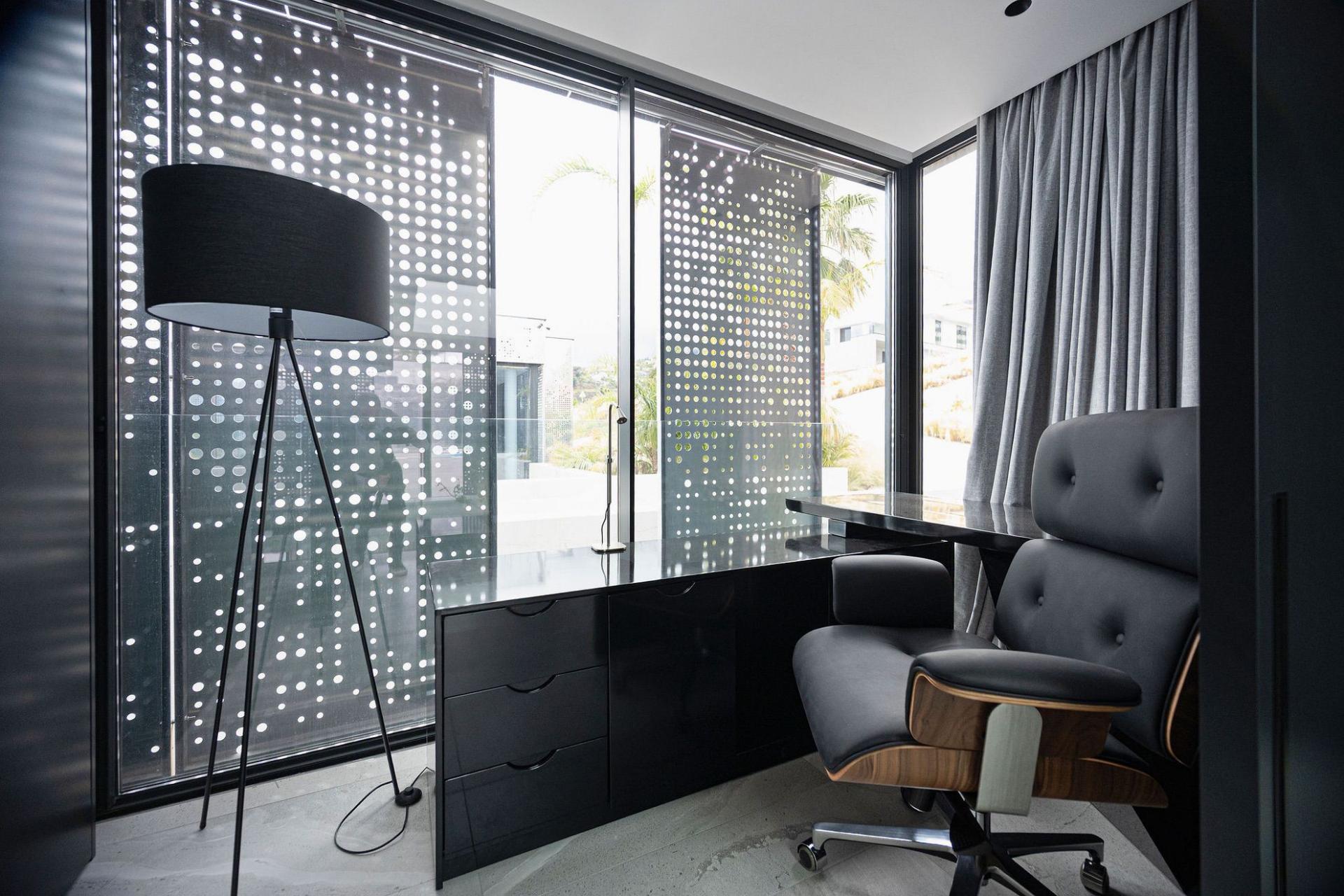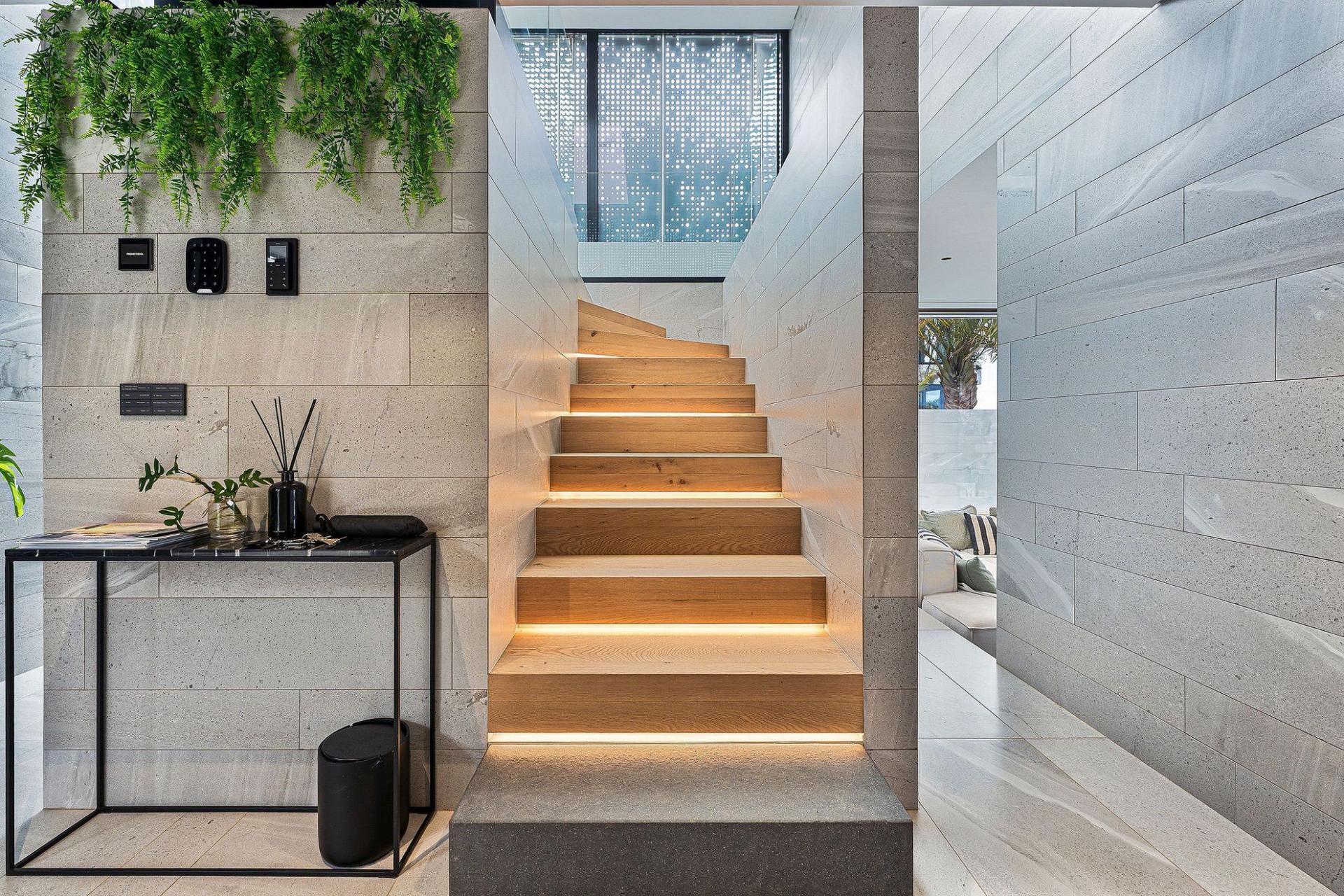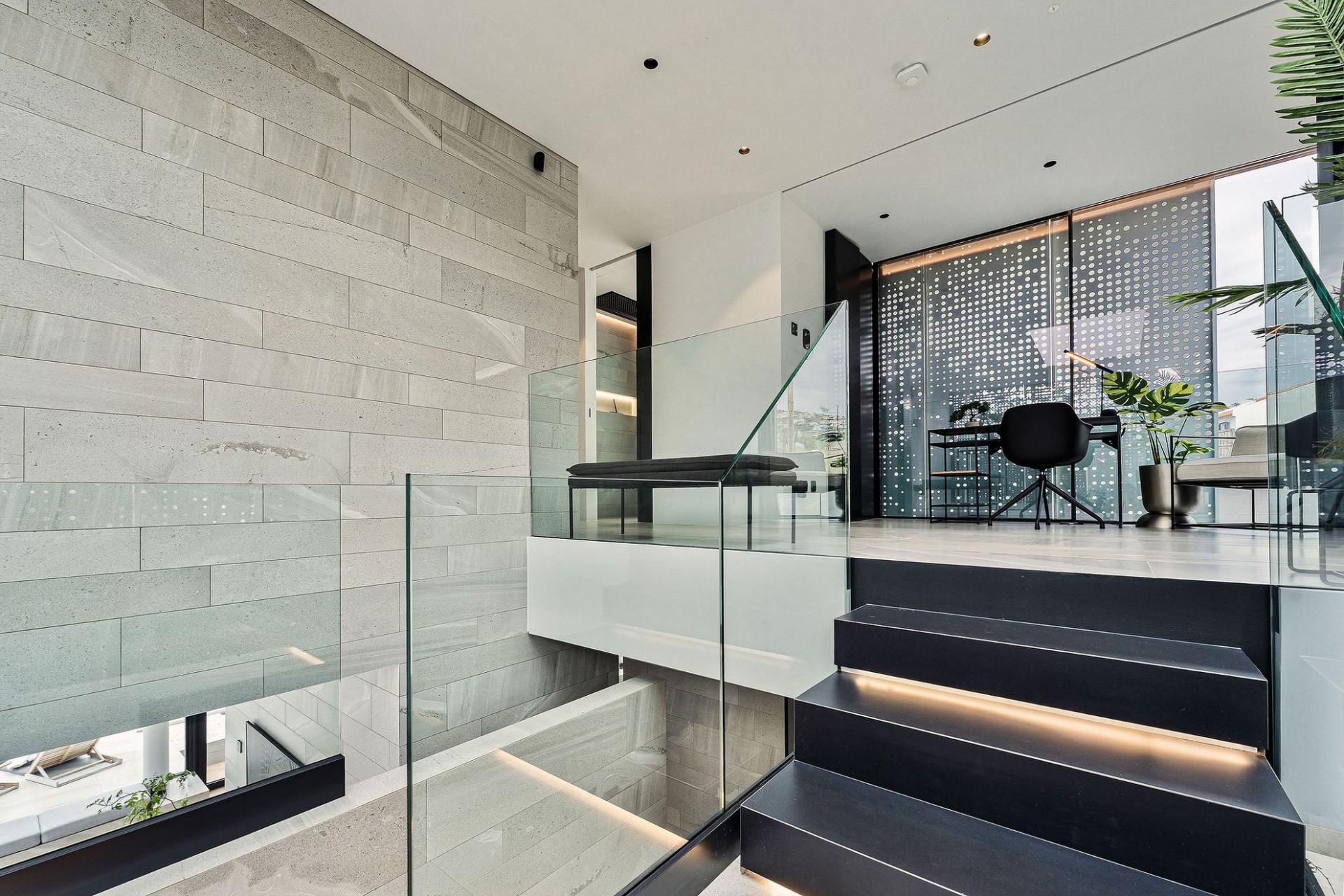 No interior, o layout aberto integra sala, sala de jantar, cozinha, biblioteca, ginásio e sauna. As três suites, incluindo a principal com spa romano, têm casas de banho privadas com chuveiro de efeito chuva. O espaço contempla cinema interior e exterior, sistemas inteligentes (face ID, Siri, iPad), cortinas elétricas e controlo climático para conforto tecnológico .