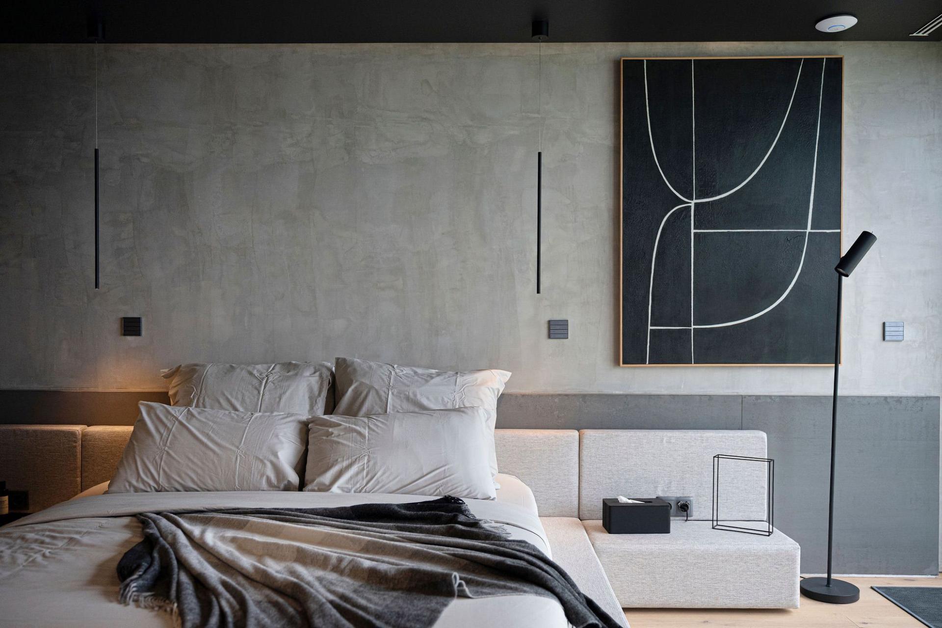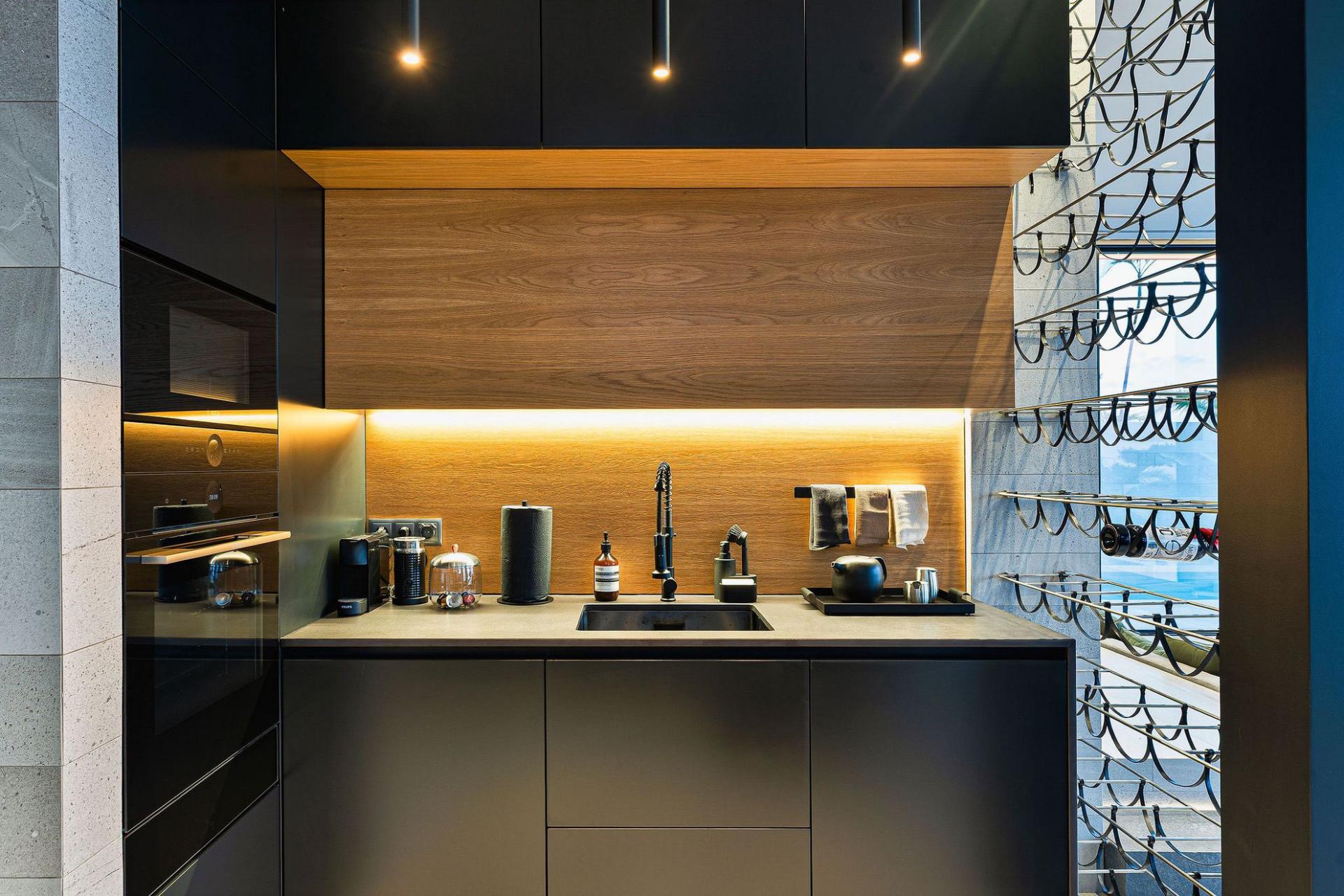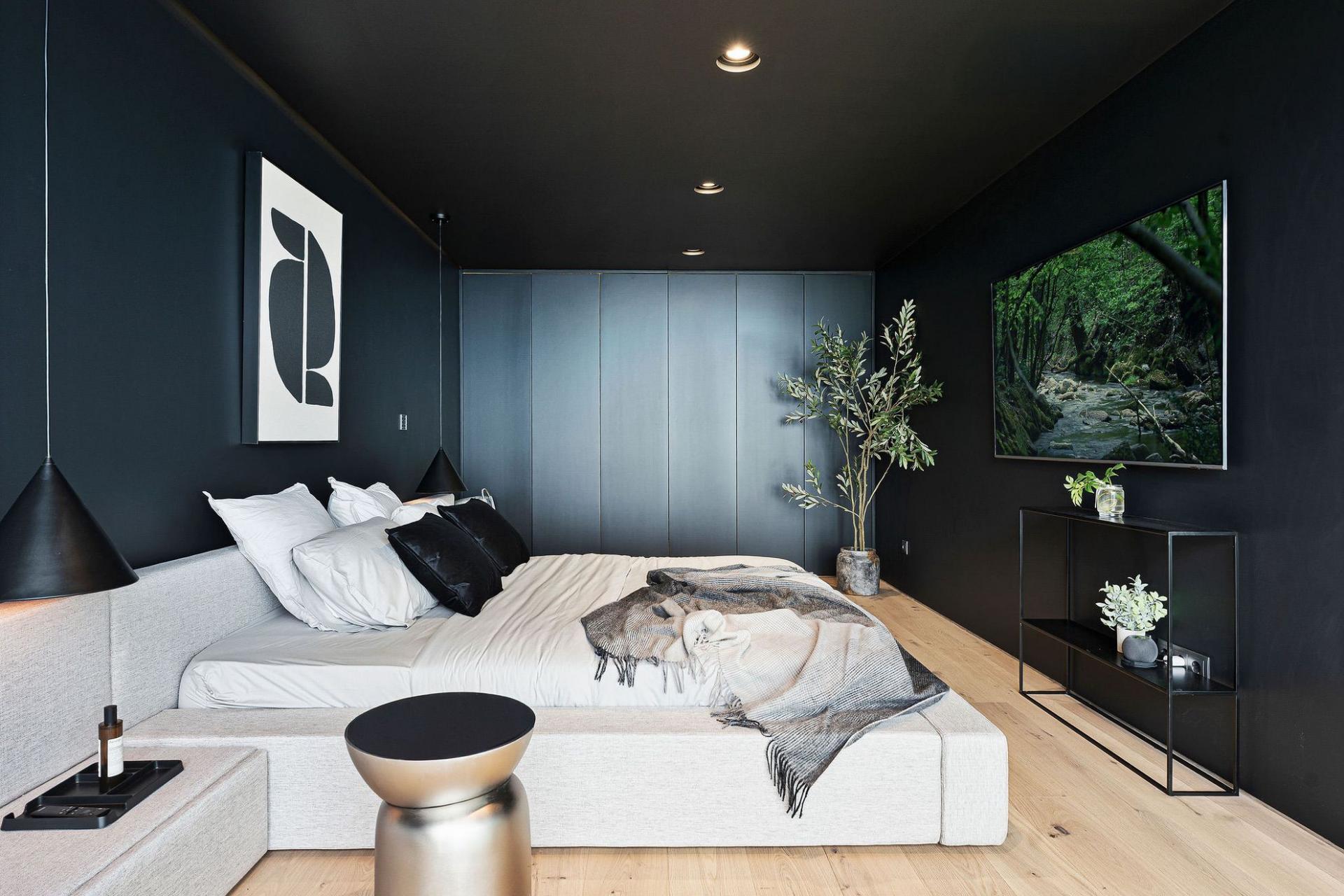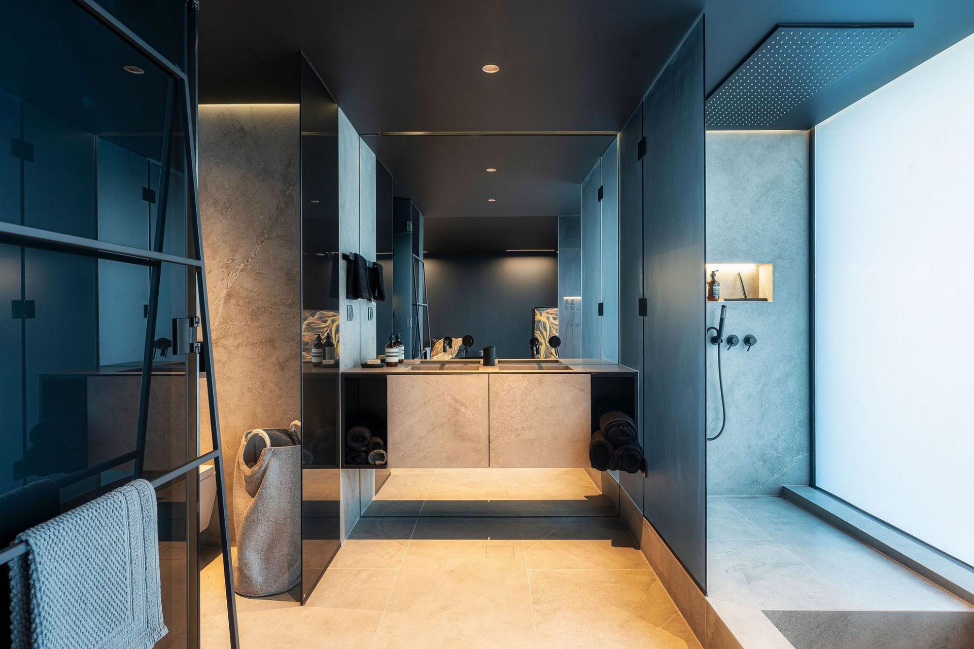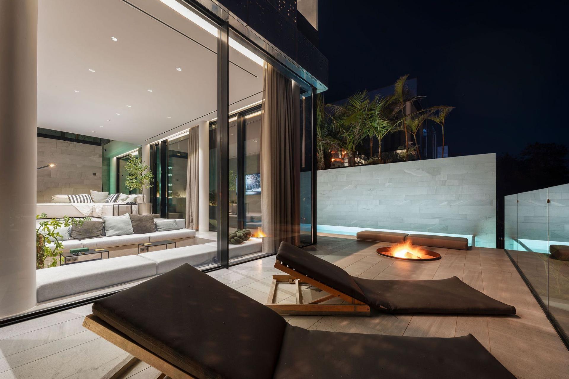 L’intérieur propose un plan ouvert avec salon, salle à manger, cuisine, une bibliothèque chaleureuse et un espace gym-sauna. Les trois chambres, dont une suite principale avec spa romain, comptent toutes des salles de bains privatives avec douche à effet pluie. Salon de divertissement intérieur et extérieur, home‑cinéma, système domotique complet (face ID, Siri, iPad), stores électriques et contrôle climatique garantissent un confort hors pair .