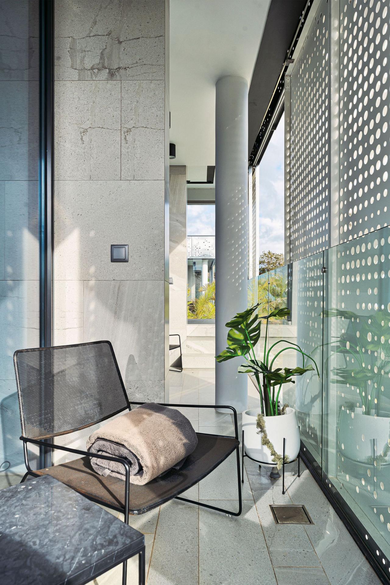 No exterior encontra-se um spa de magnésio com piscina infinita, jacuzzi aquecido com cascata, piscina “espelho”, lounge na água, praia privada, três lareiras “frie pit” sem fumo, horta permacultural, pomar, biblioteca junto ao jacuzzi e lounge cerimonial para yoga/meditação. Jardim de palmeiras, sistema áudio AirPlay/Sonos e robôs de manutenção completam esta obra de bem-estar tecnológico .
