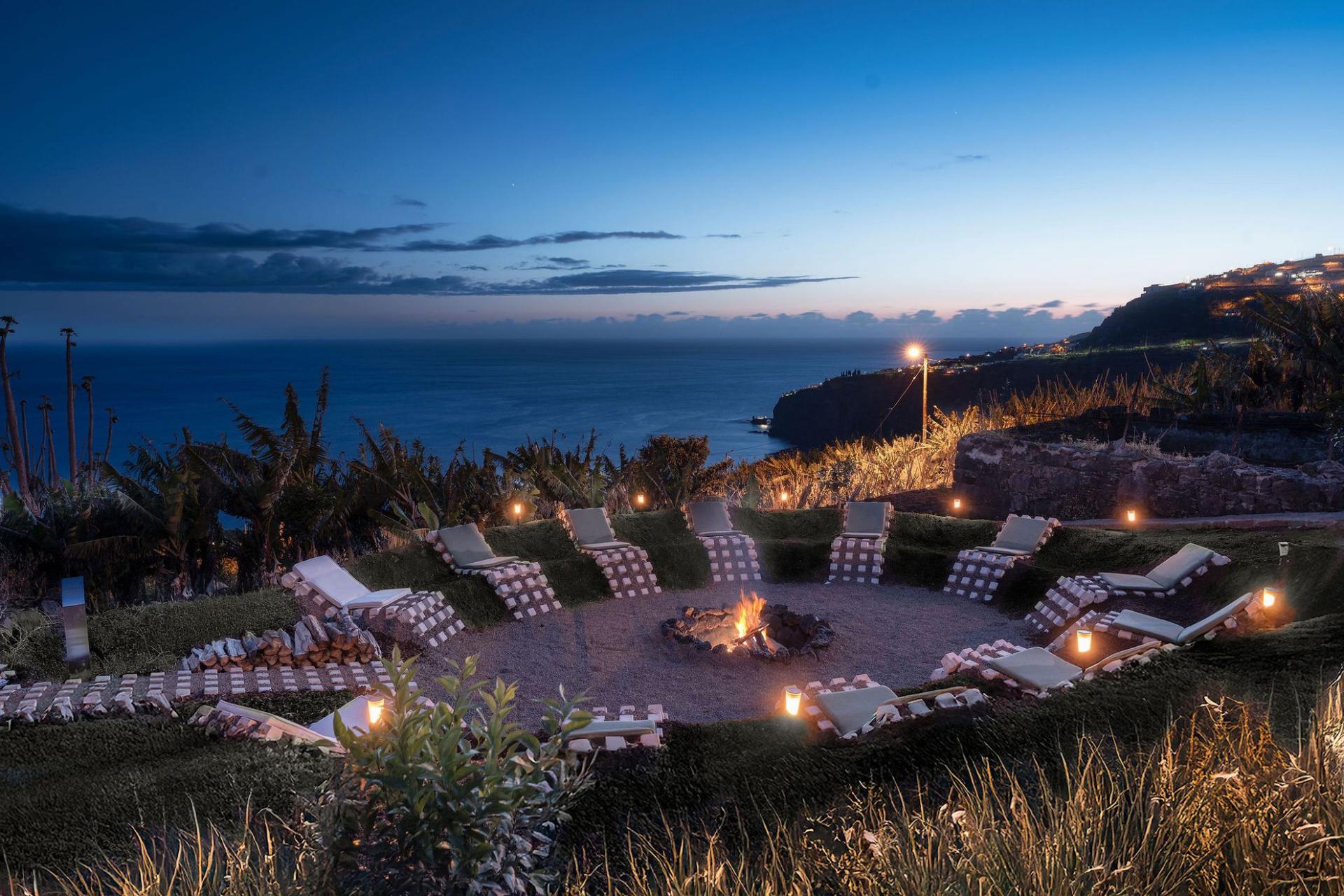 Im Außenbereich erleben Sie Magnesium‑Infinity‑Spa, beheizten Jacuzzi mit Wasserfall, spiegelnde Poolfläche, „feet‑dipping“ Lounge, privaten Strandbereich, drei rauchfreie Feuerstellen, Permakultur‑Gemüsegarten, Obstbäume, Bibliothek neben dem Jacuzzi und ein zeremonieller Lounge‑Bereich für Meditation oder Yoga. Palmenlandschaft, automatisierte Fassade, AirPlay/Sonos‑Beschallung und robotische Pflege setzen den technologischen Standard .