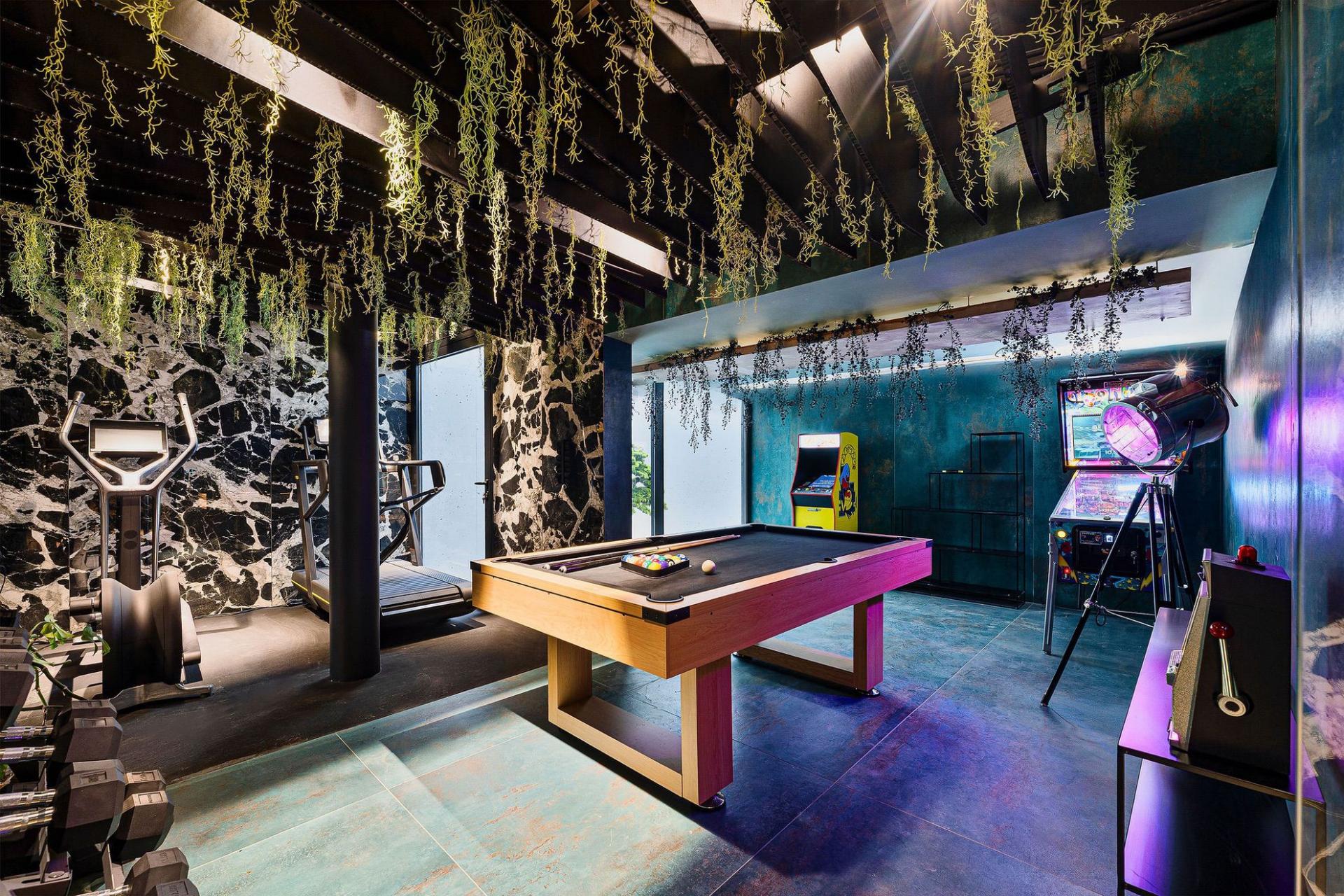 L’extérieur rassemble un spa infini en magnésium, jacuzzi chauffé avec cascades, piscine miroir, coin “feet-dipping”, salon de plage privée, trois foyers sans fumée, potager permacole, herbes et verger, bibliothèque au niveau du jacuzzi, et lounge cérémonial ancestral pour méditation ou yoga. Jardin de palmiers, façade automatisée, système audio AirPlay/Sonos complètent ce havre technologique et apaisant .