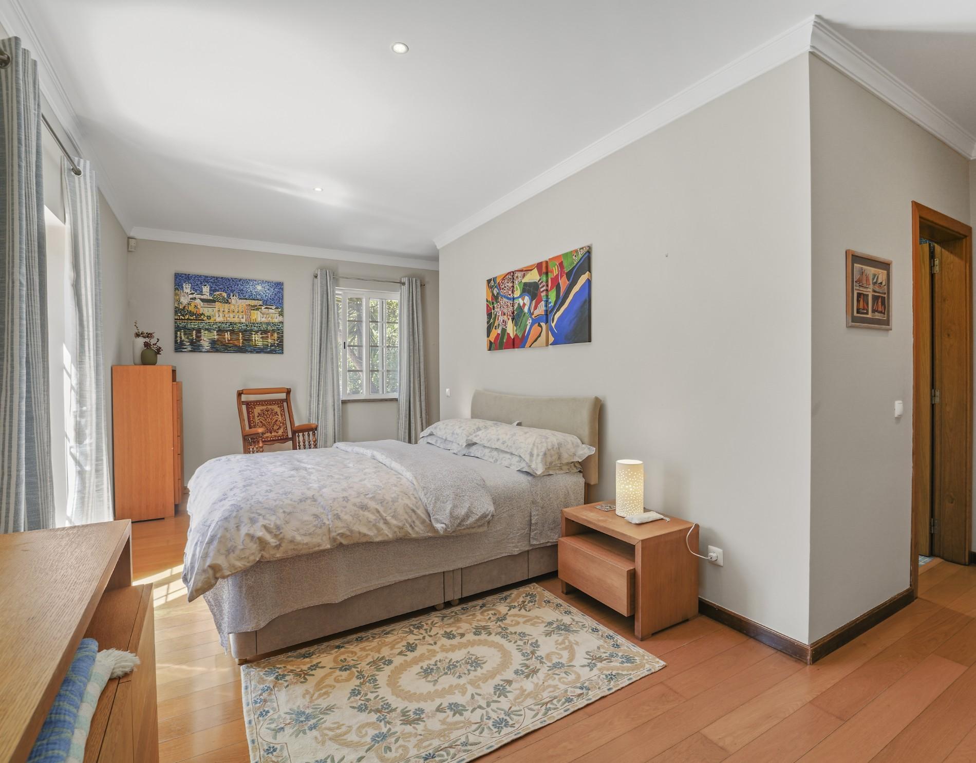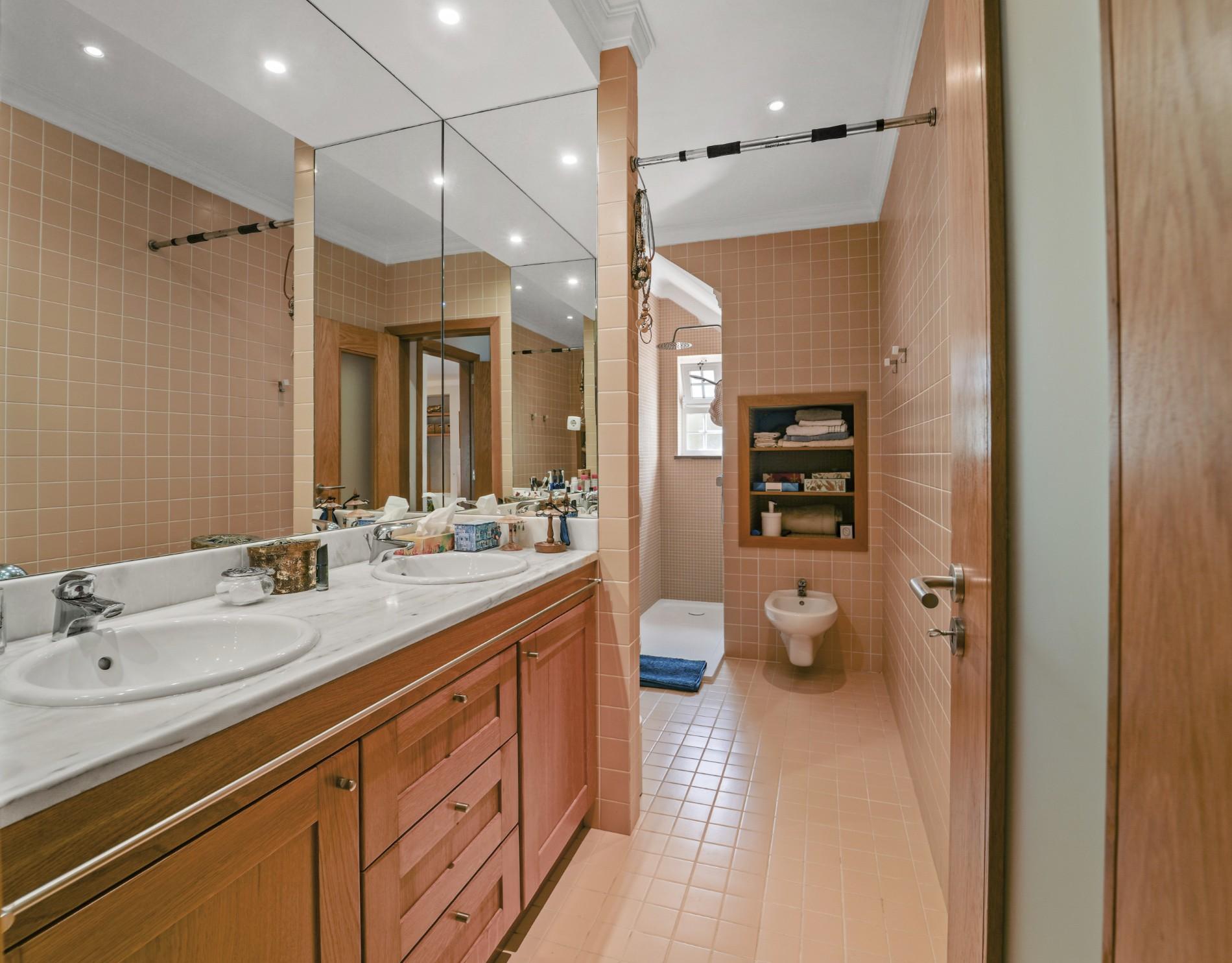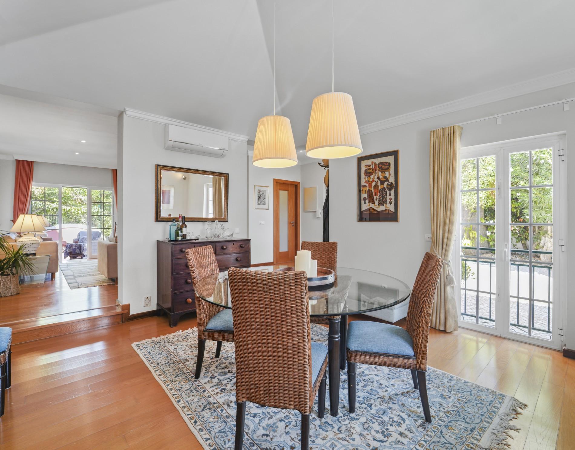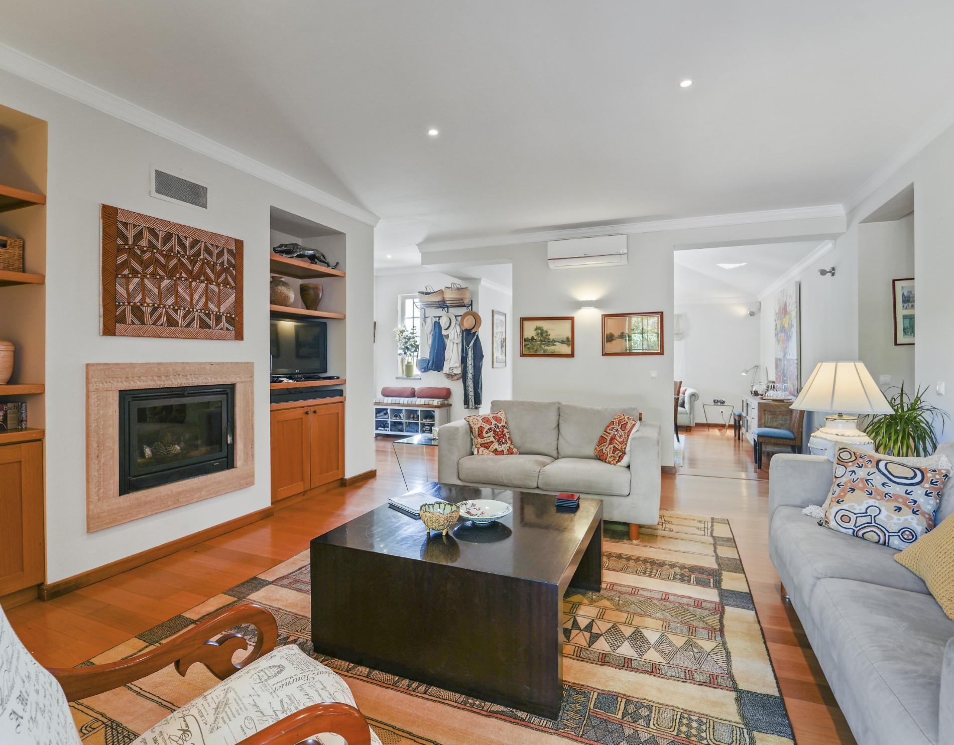 O rés-do-chão inclui uma luminosa sala de estar com lareira e acesso direto ao terraço envolvente. A sala de jantar é valorizada por uma janela de grandes dimensões que proporciona bastante luz natural, enquanto a cozinha equipada, com acesso ao exterior, está ligada a uma lavandaria independente. Ambos os quartos neste piso têm acesso direto ao terraço: a suíte principal dispõe de casa de banho com duche e a suíte de hóspedes oferece uma casa de banho completa. Uma casa de banho social completa este nível.
