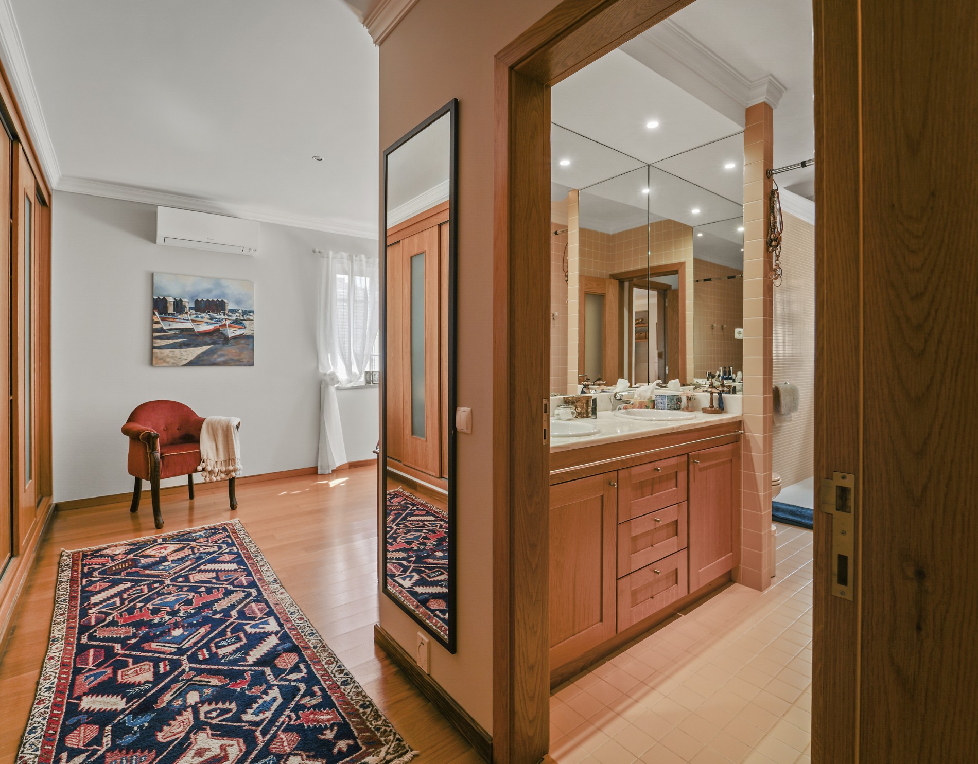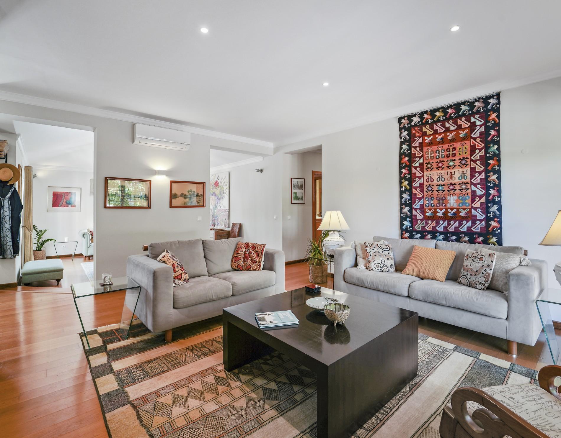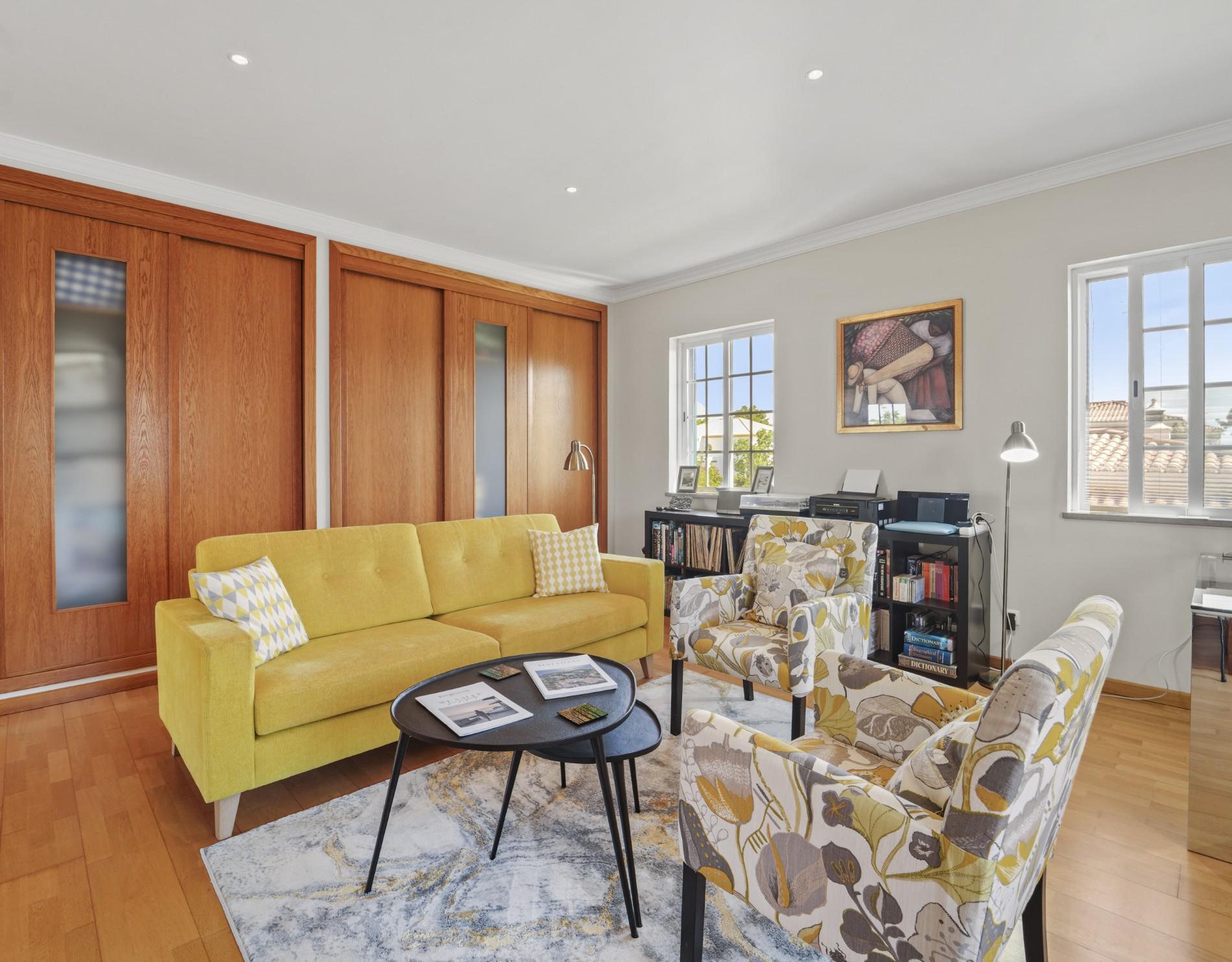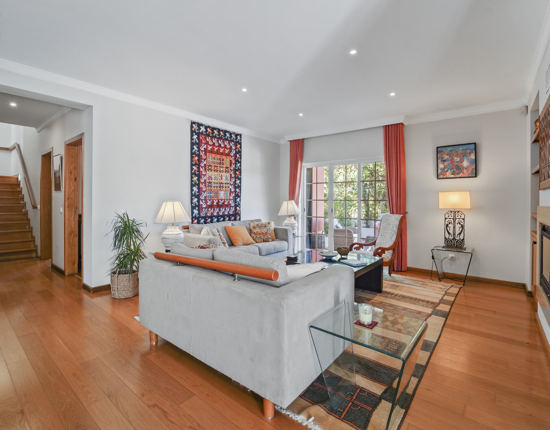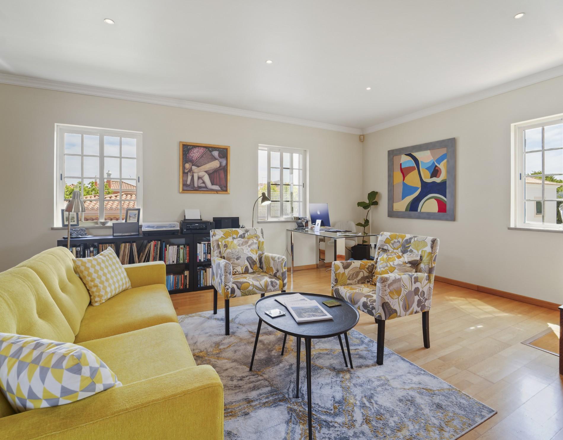 No primeiro piso encontra-se uma espaçosa sala de estar com área de escritório, beneficiando de janelas de dupla orientação que inundam o espaço de luz natural. Esta área abre-se para um grande terraço com pérgola e zona de estar coberta com vista para a zona verde envolvente. O terceiro quarto, também com janelas de dupla orientação, dispõe de uma casa de banho privativa com duche.