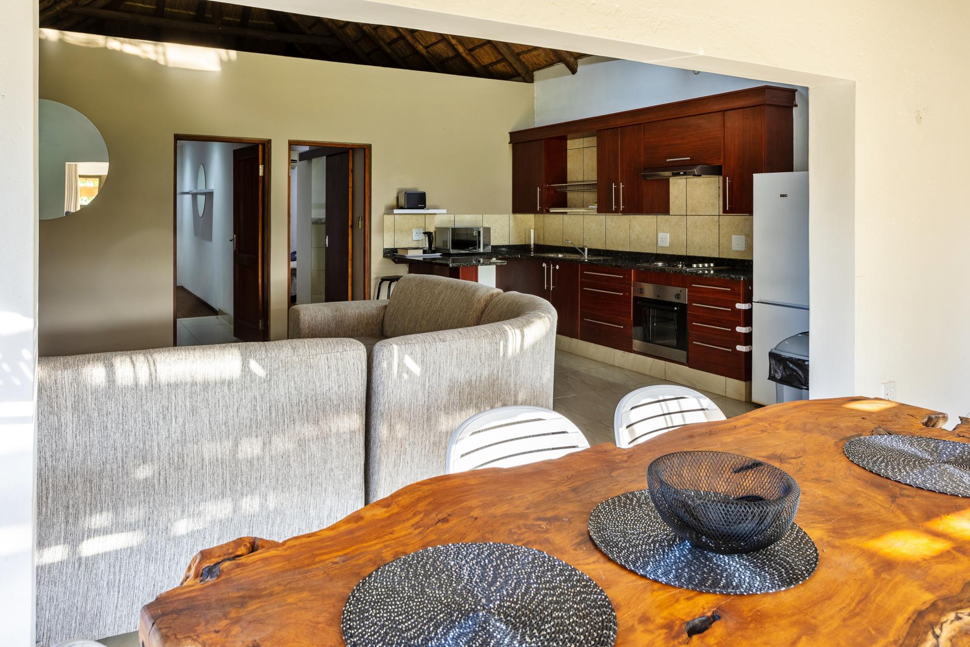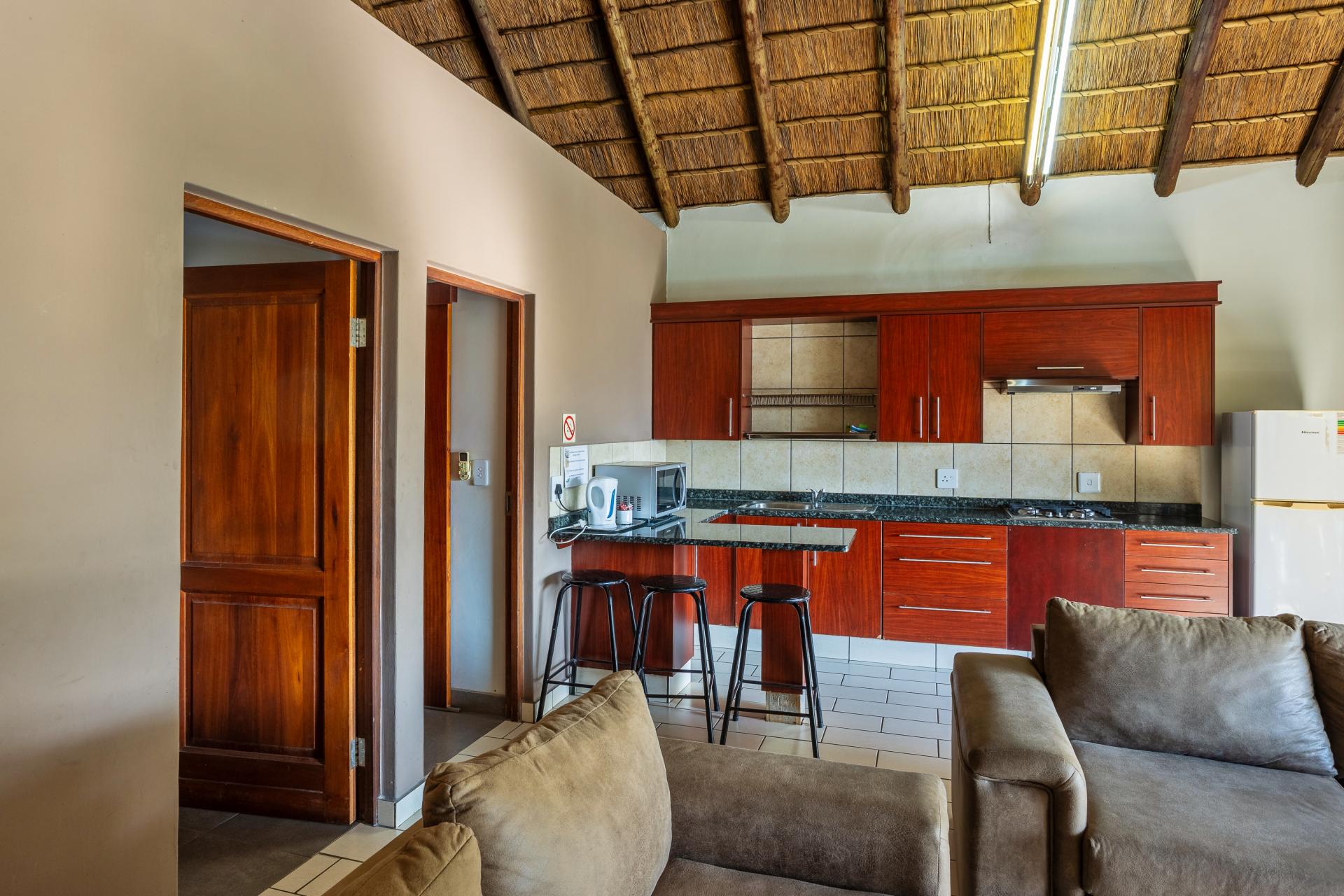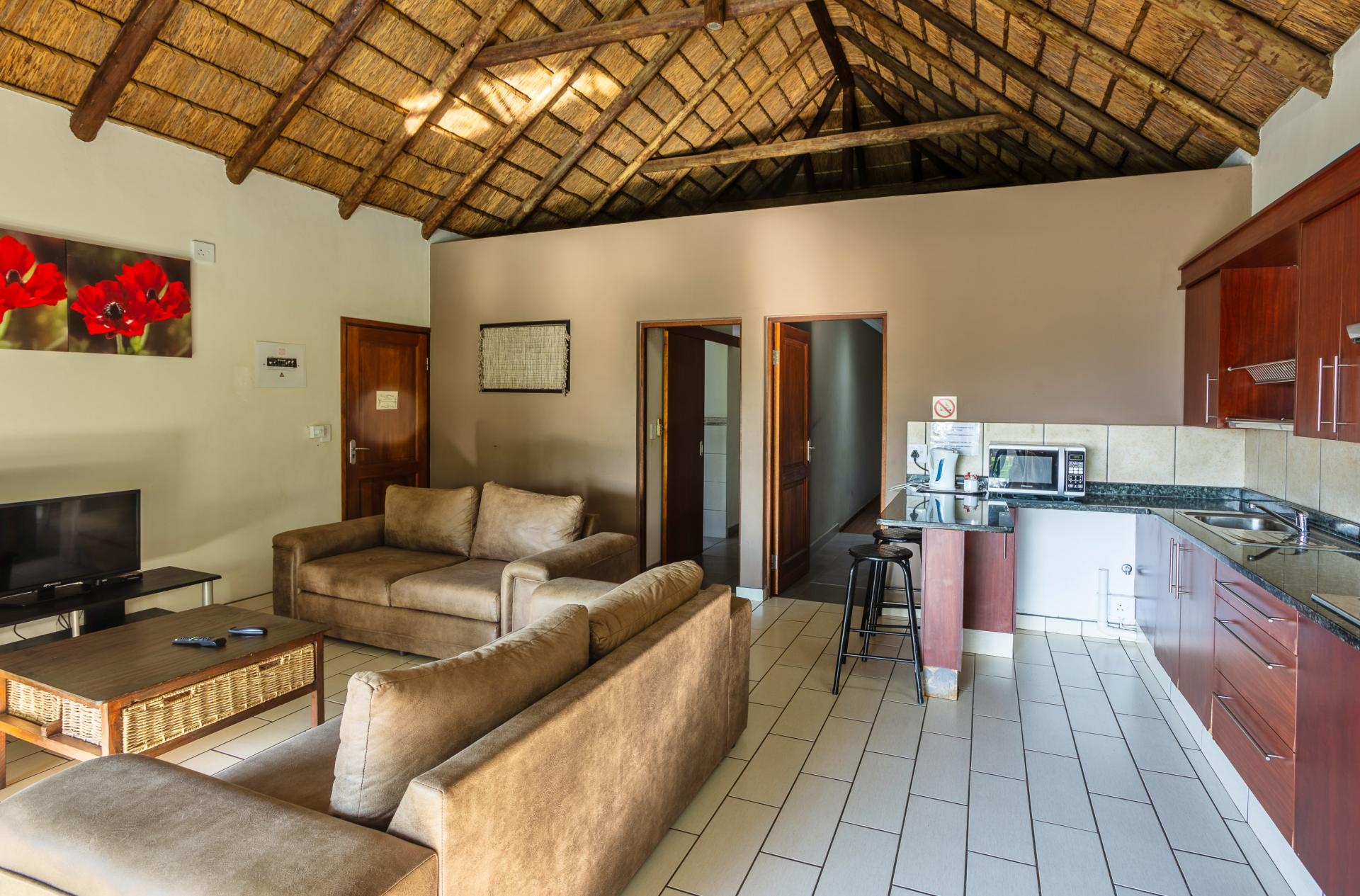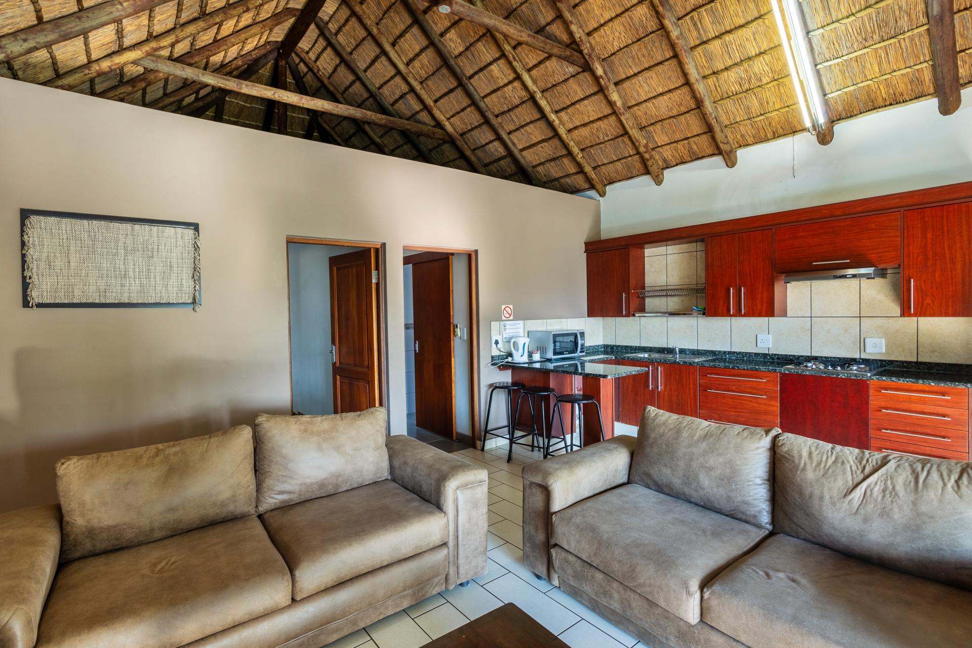 Designed for larger families or groups, these spacious chalets feature three en-suite bedrooms with private entrances, a full kitchen, a comfortable lounge, a private patio with braai and boma area, air conditioning, secure covered parking, and optional daily servicing.