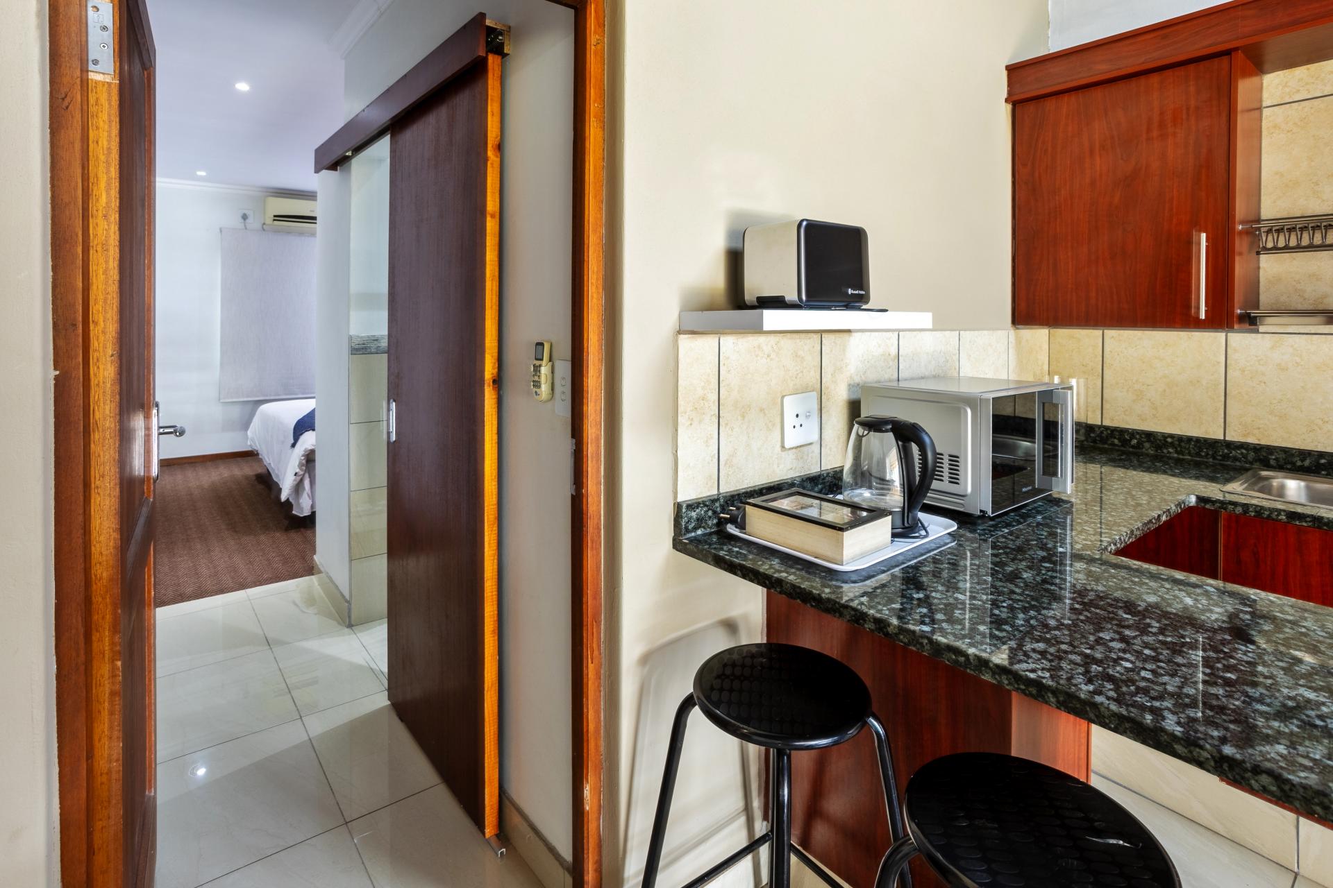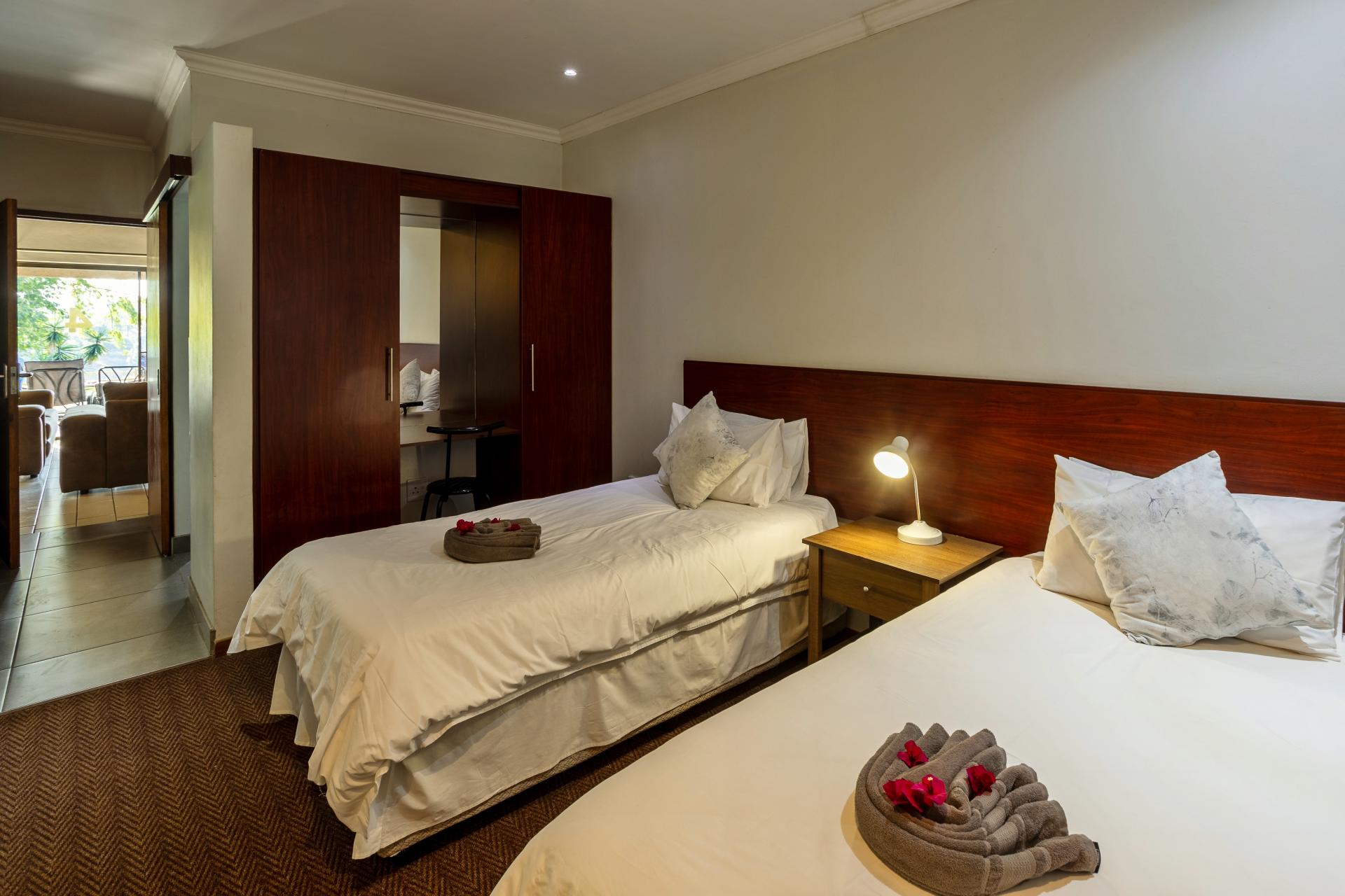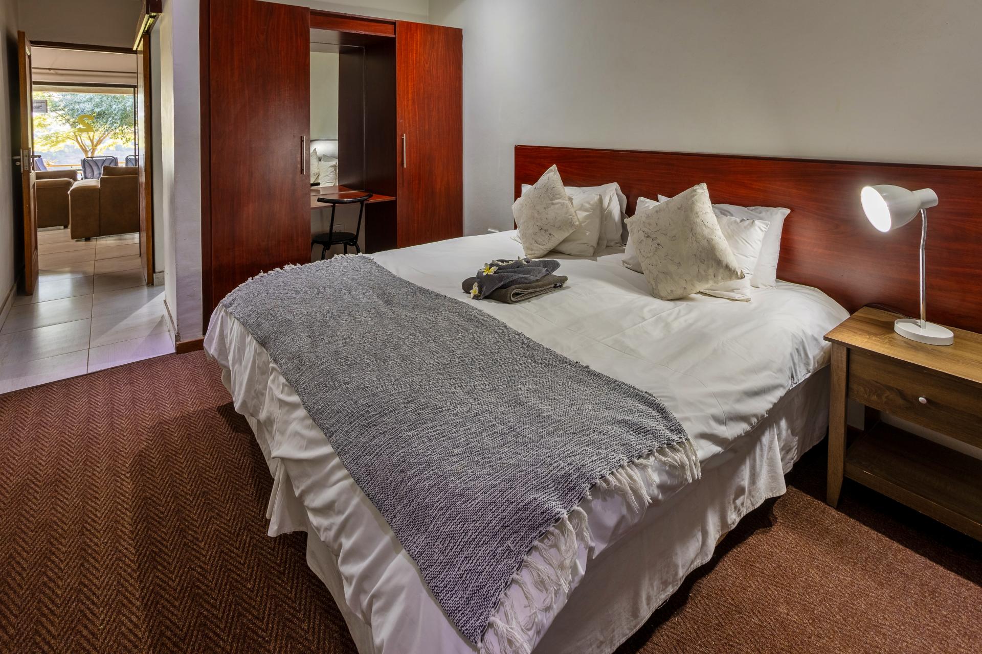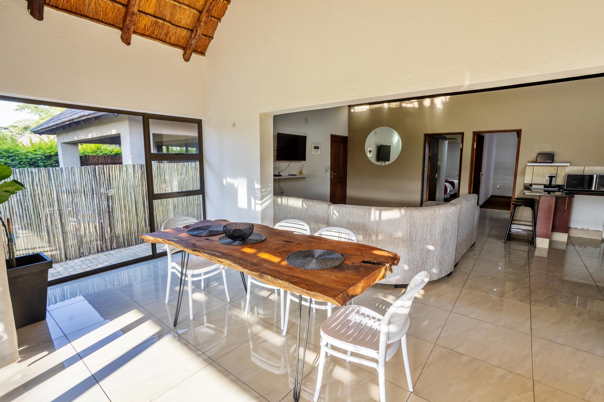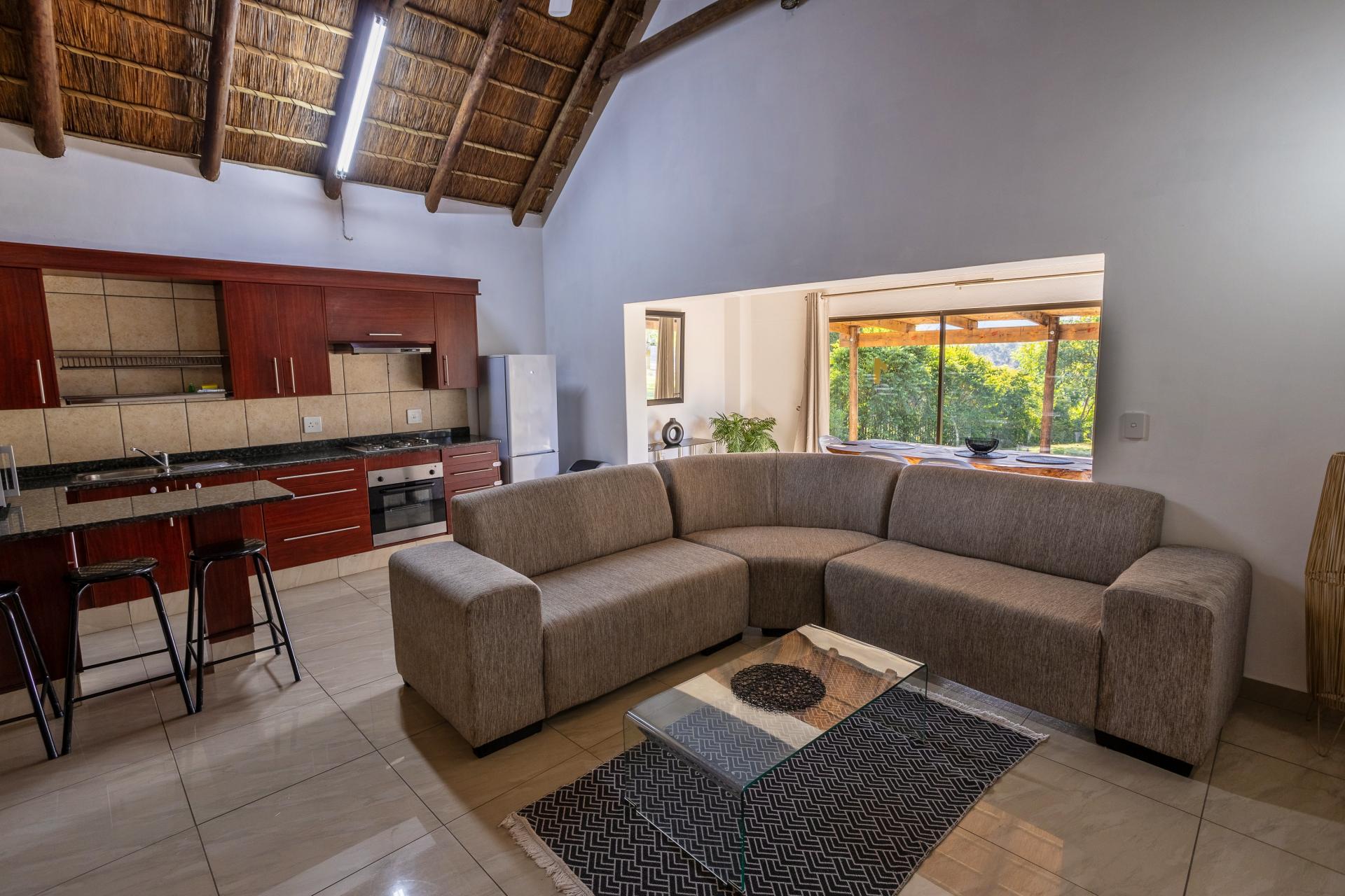 Designed for larger families or groups, these spacious chalets feature three en-suite bedrooms with private entrances, a full kitchen, a comfortable lounge, a private patio with braai and boma area, air conditioning, secure covered parking, and optional daily servicing.