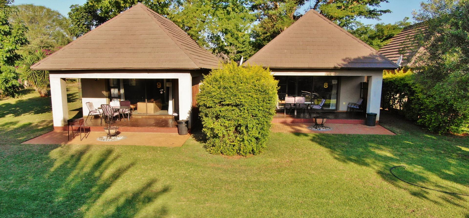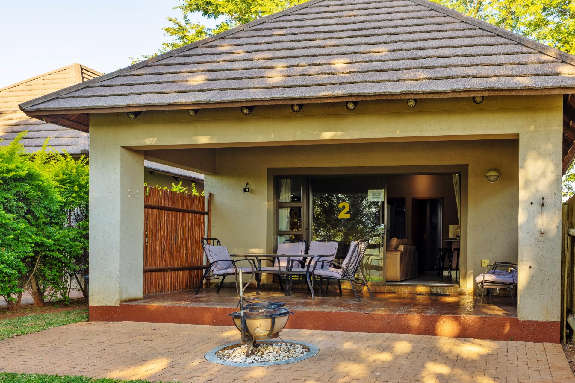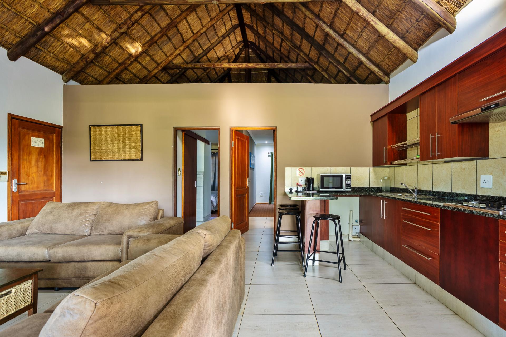 These compact, thatched-roof chalets offer a cozy stay with garden views, featuring one en-suite bedroom, satellite TV, air conditioning, braai facilities, secure covered parking, and daily servicing on request.