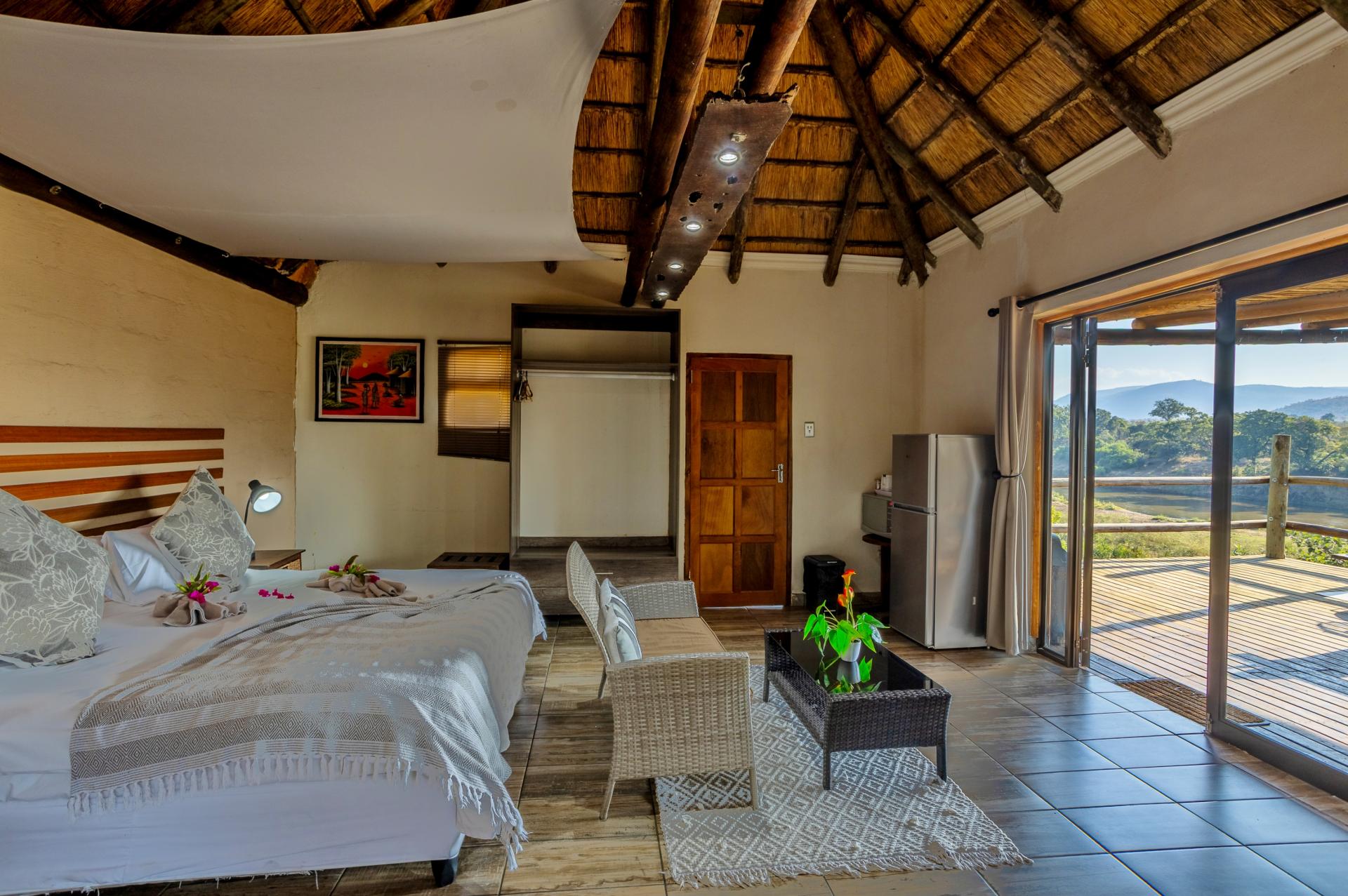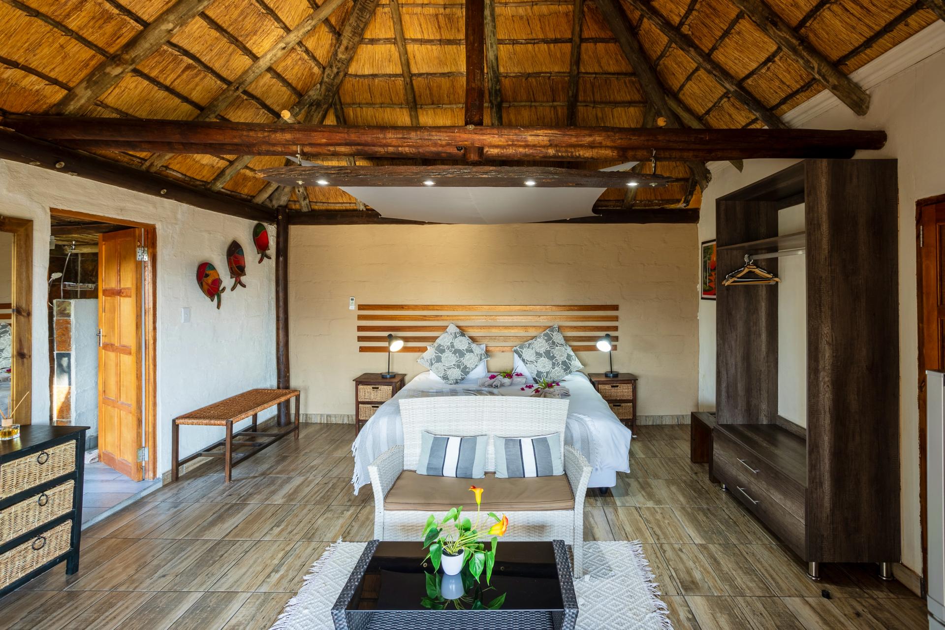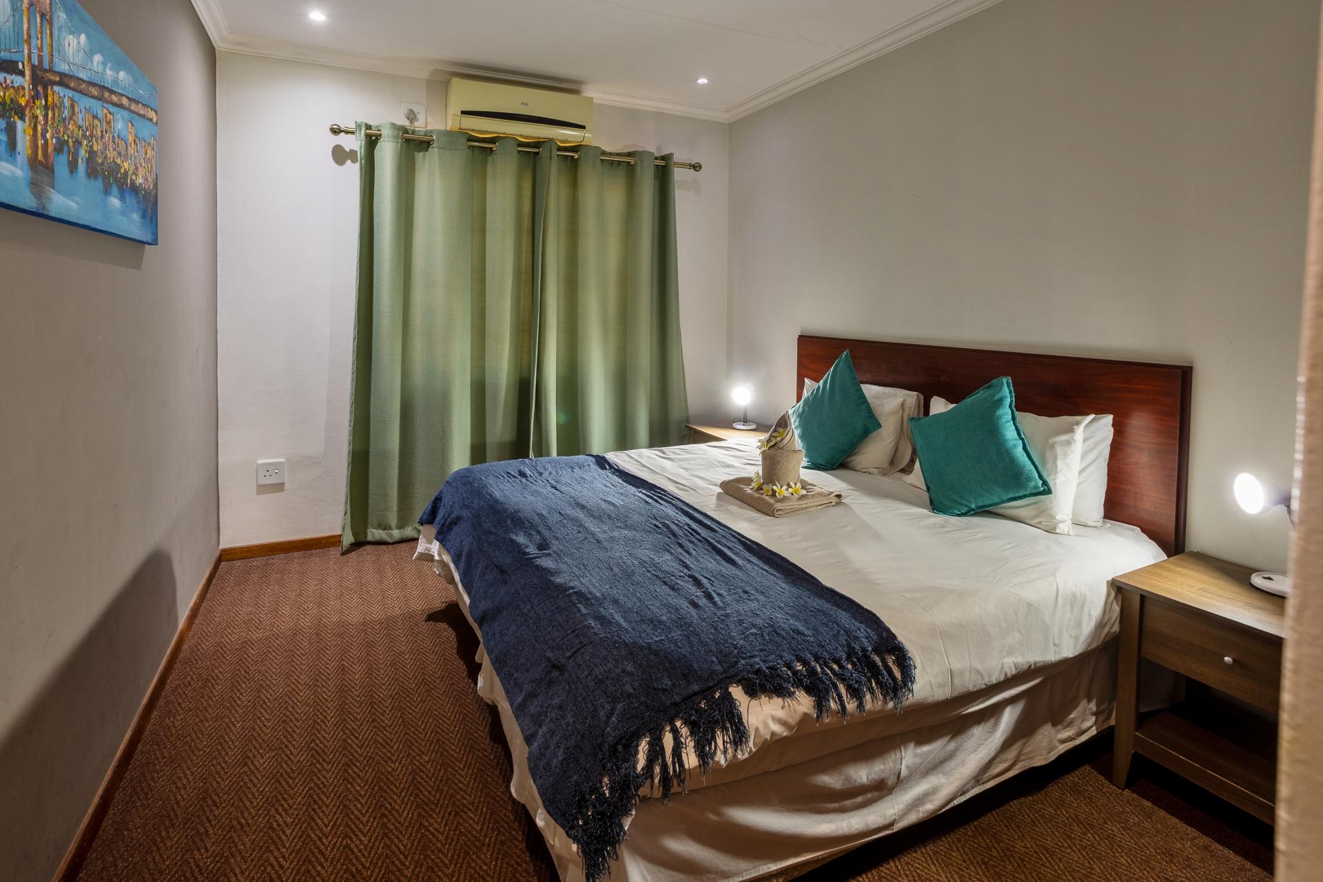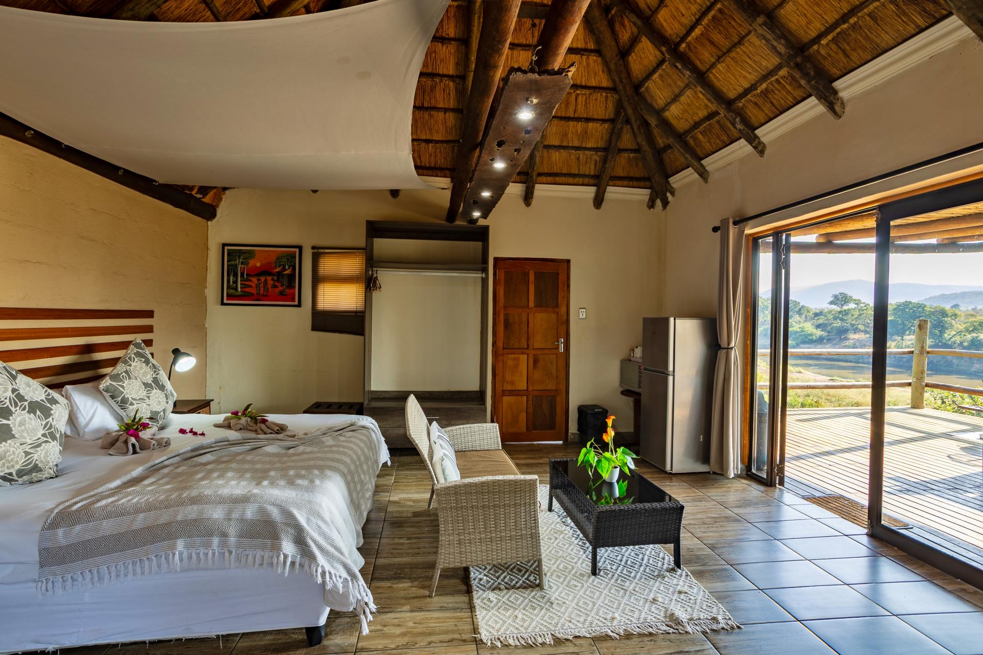 These compact, thatched-roof chalets offer a cozy stay with garden views, featuring one en-suite bedroom, satellite TV, air conditioning, braai facilities, secure covered parking, and daily servicing on request.