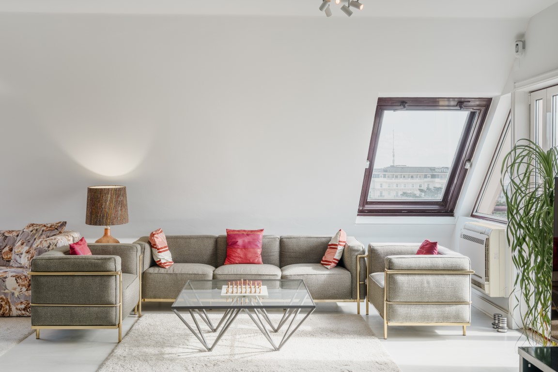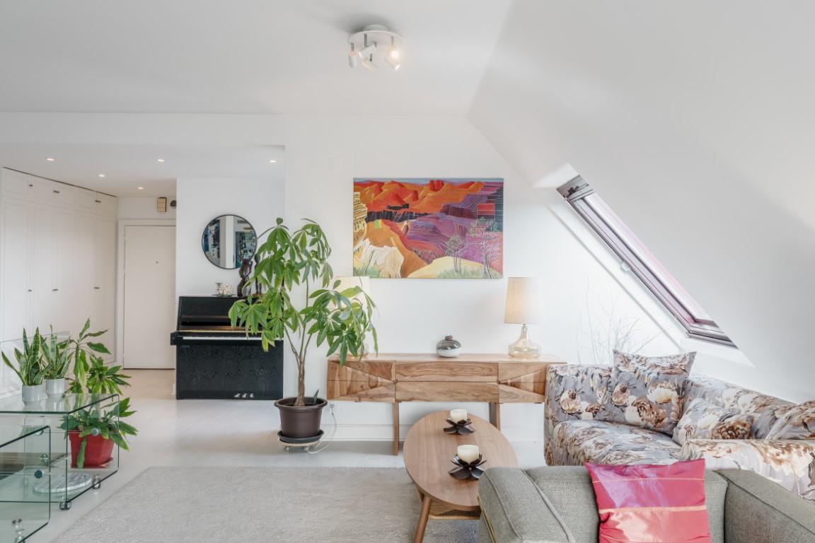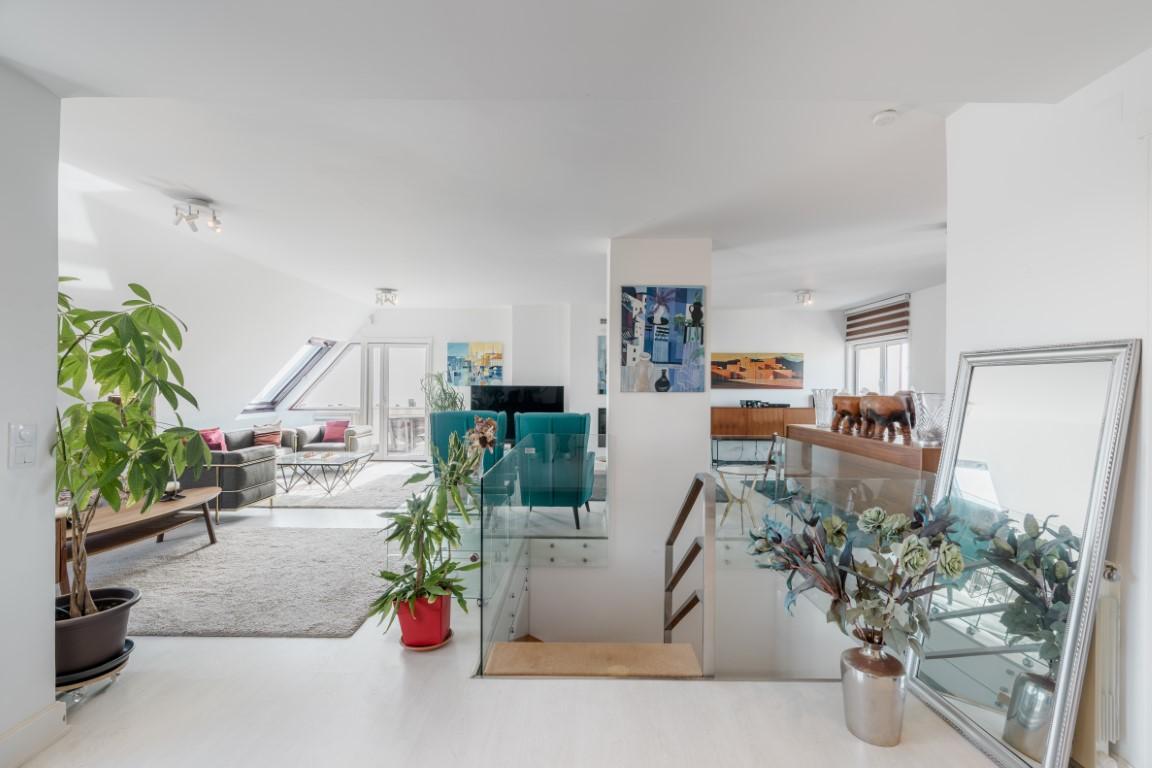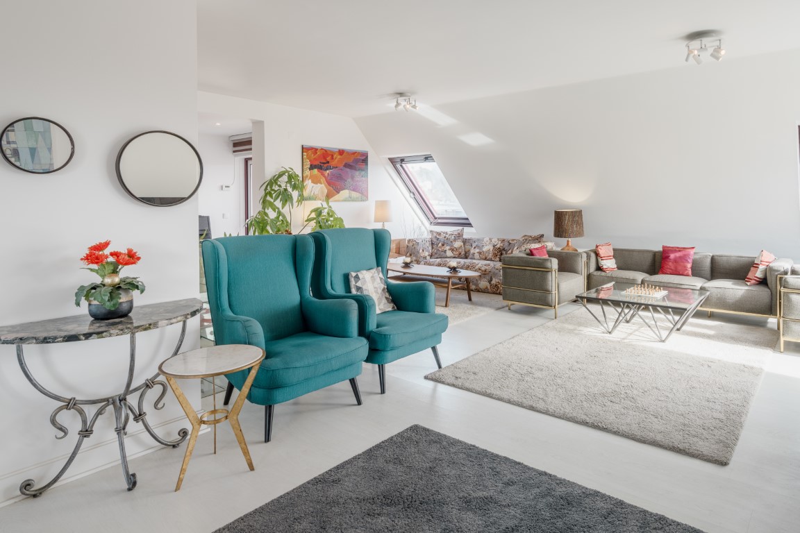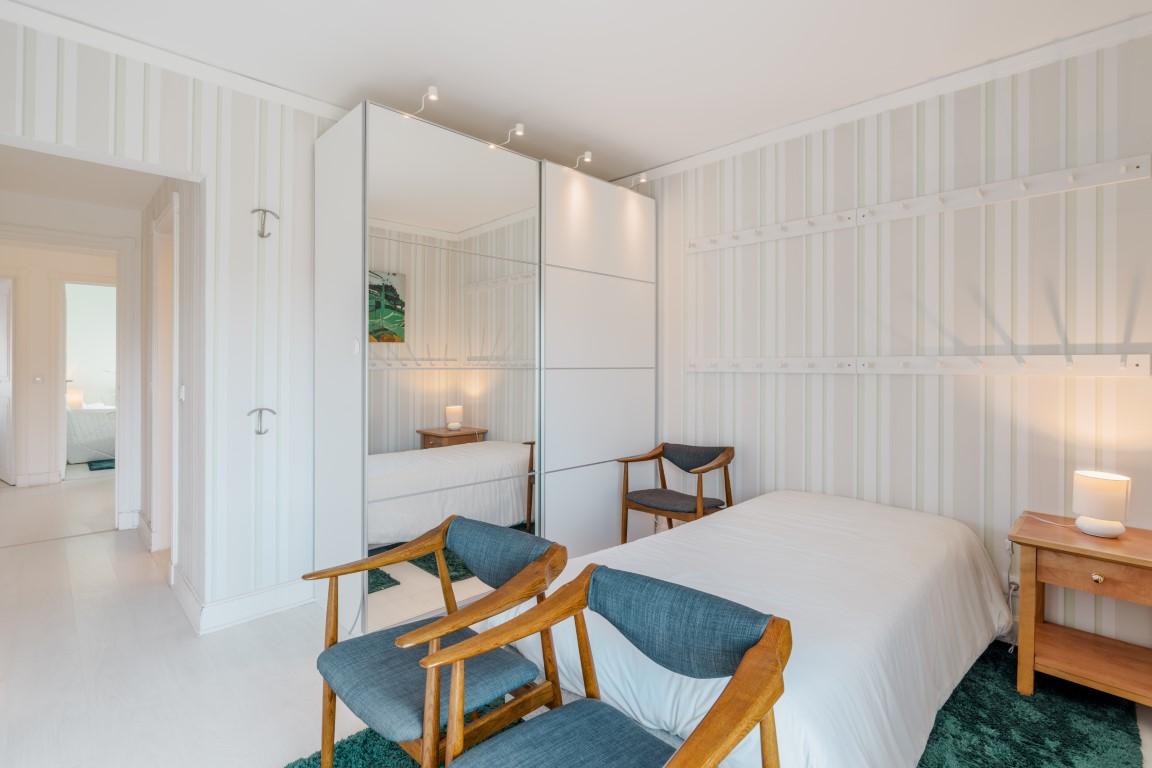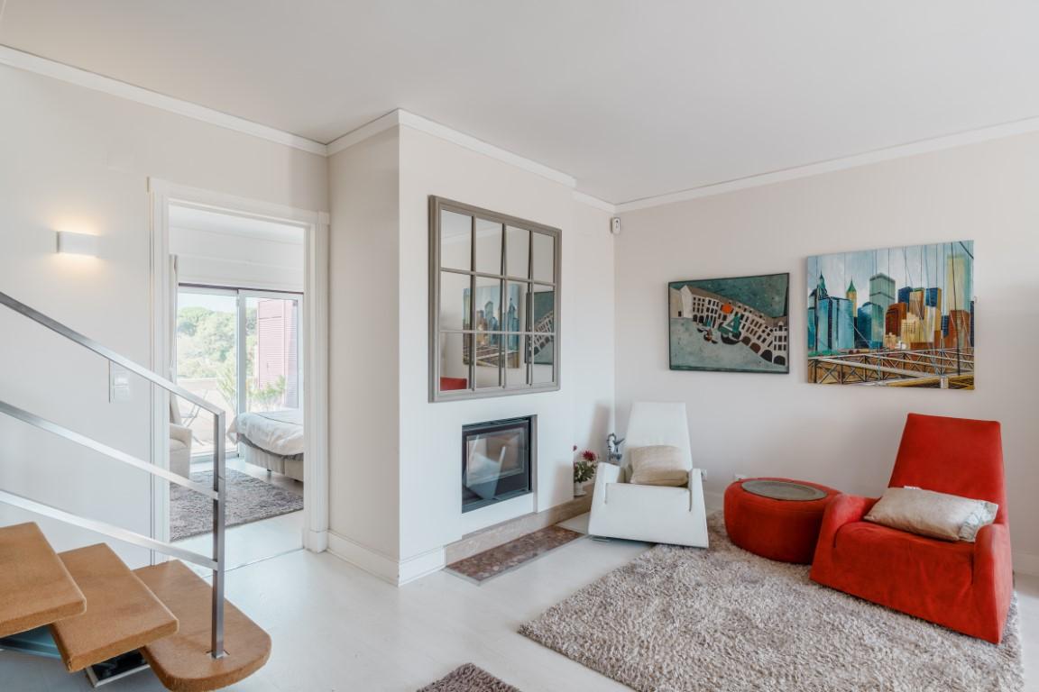 Cozy entrance hall with access to a social powder room with a window and coat closet area. The spacious living room with 61 m2 is divided into two distinct areas, featuring a fireplace with a heat recover system and access to a south-facing balcony, with breathtaking views of the sea and the casino gardens, flooding the space with natural light. On this floor, there is also a fully equipped kitchen with 11m2.