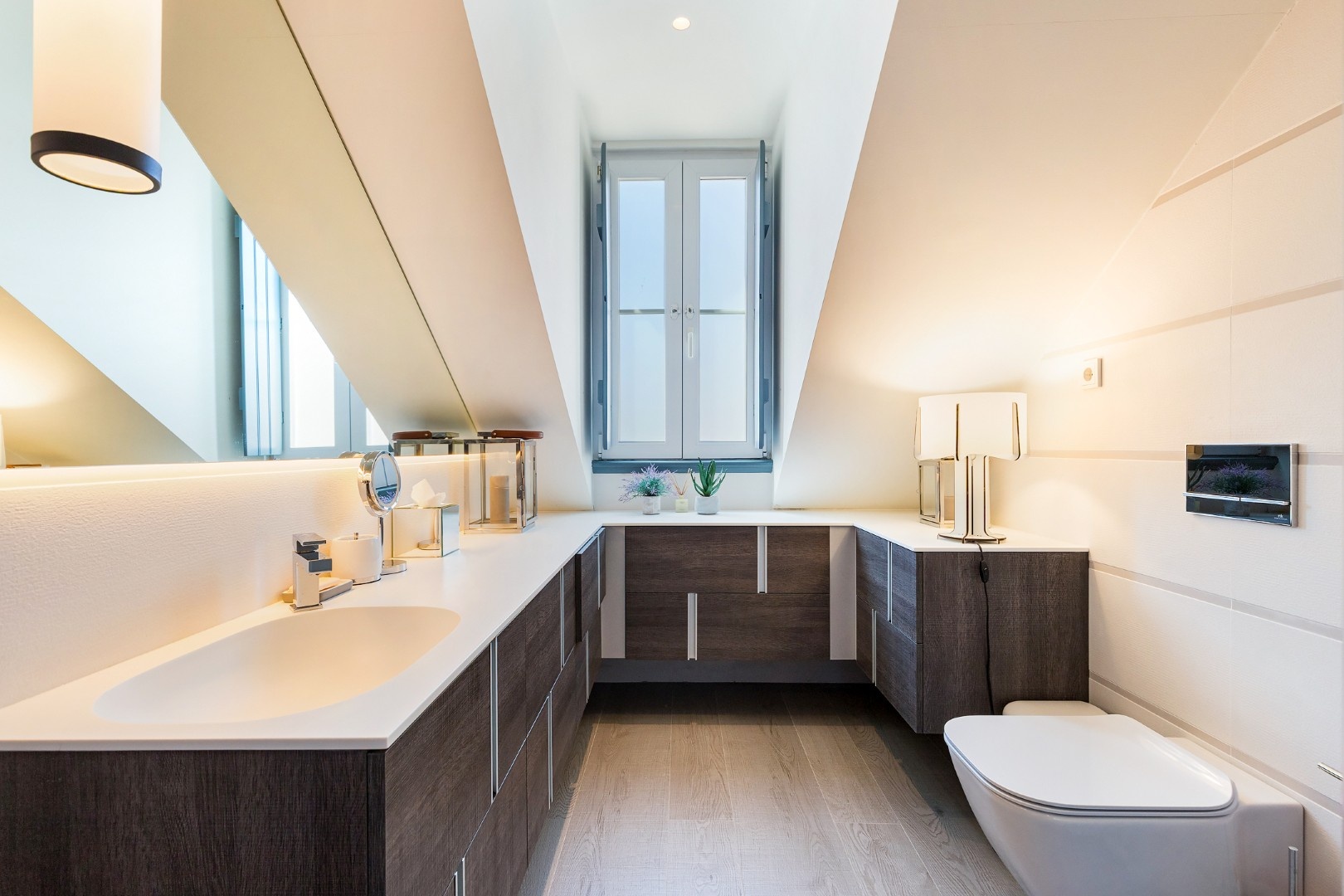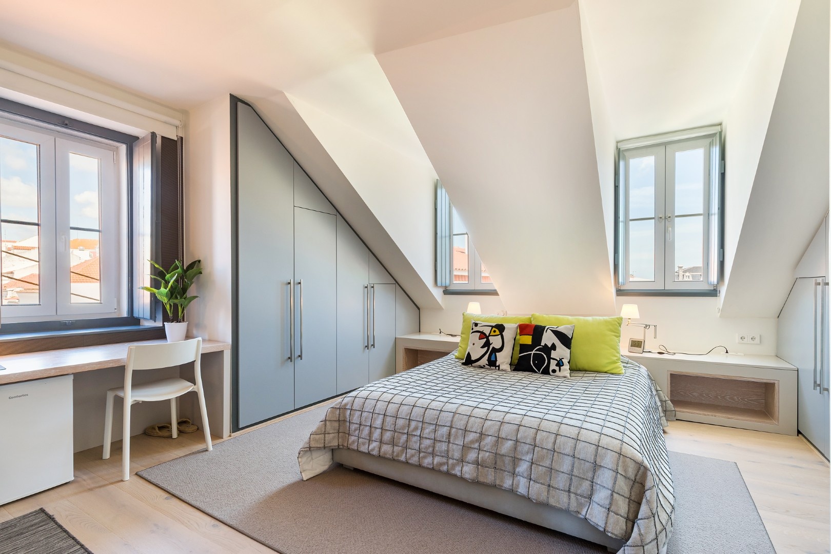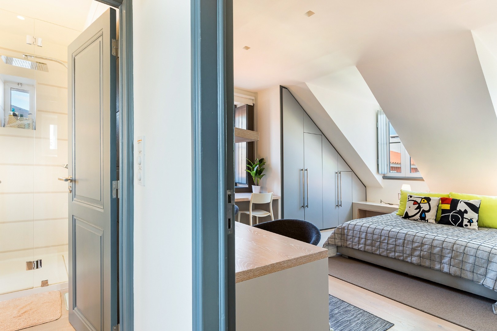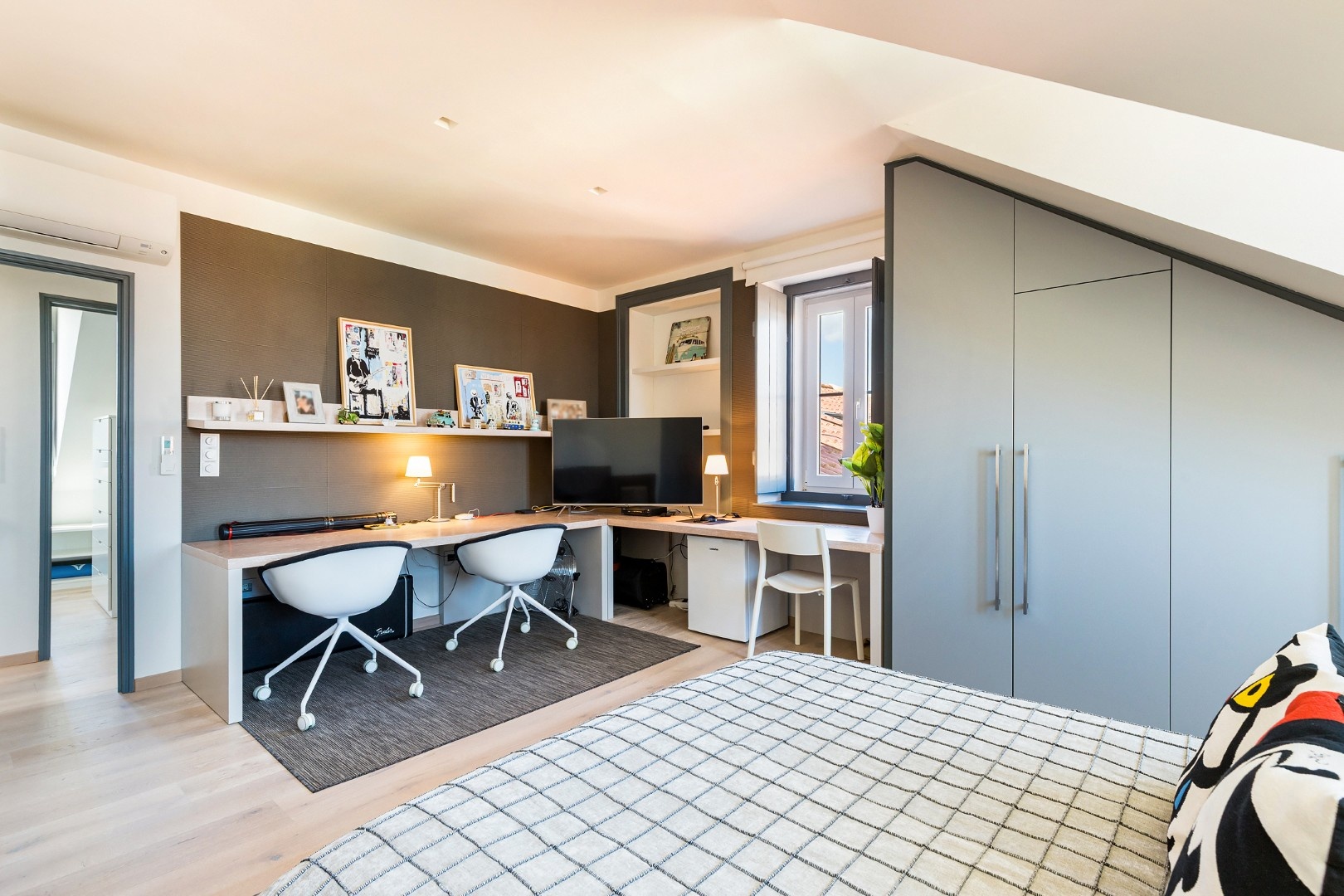 The top level features a generous bedroom capturing panoramic views over the historic centre, accompanied by a full bathroom and a smaller bedroom—perfect for a home library or overnight guests.