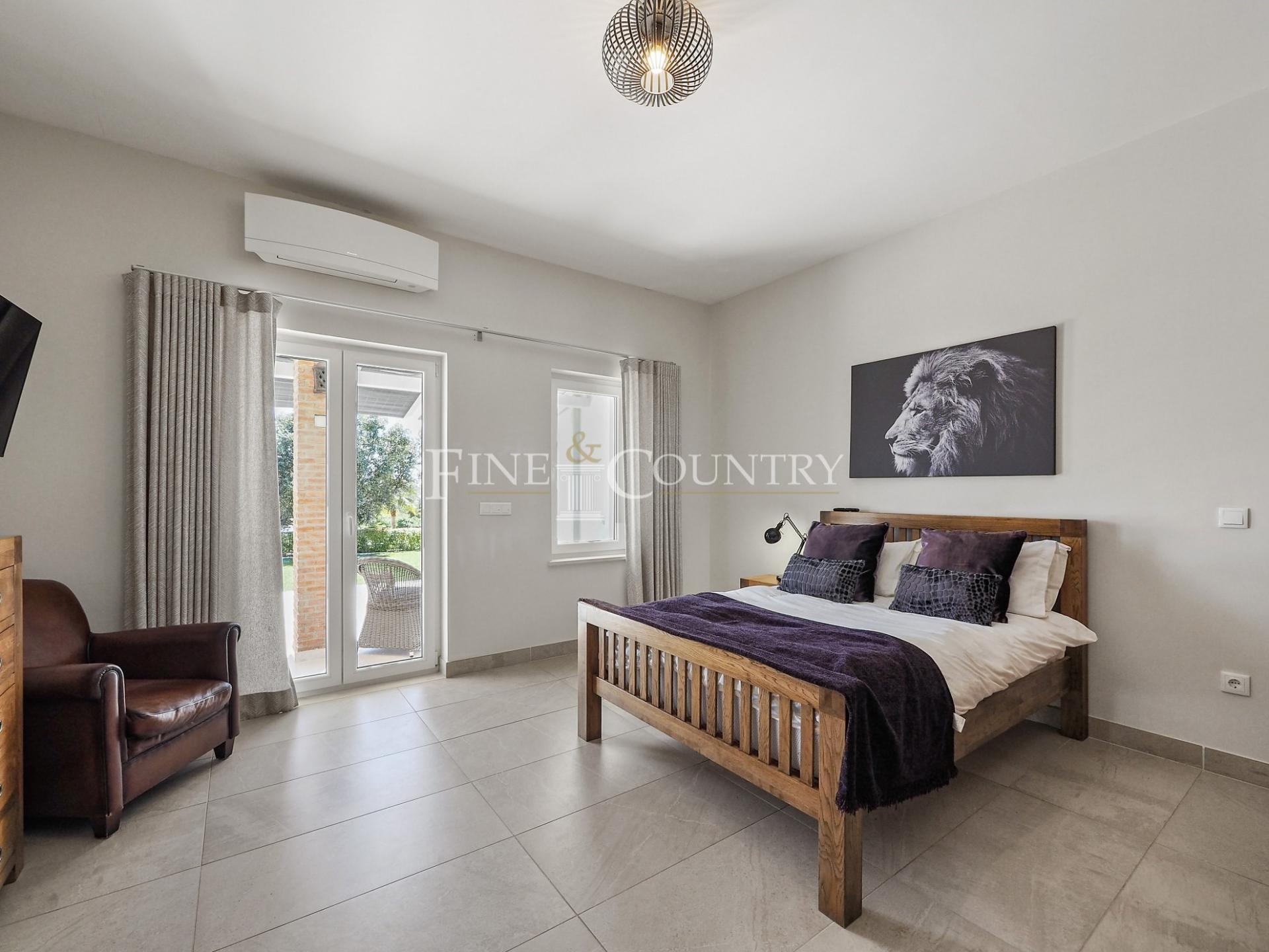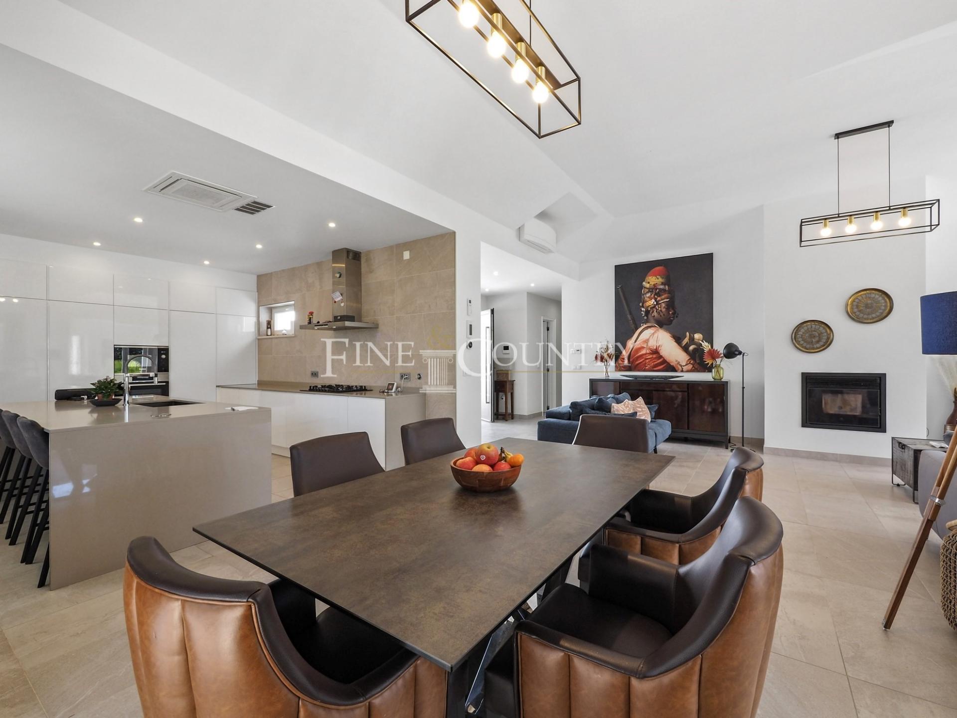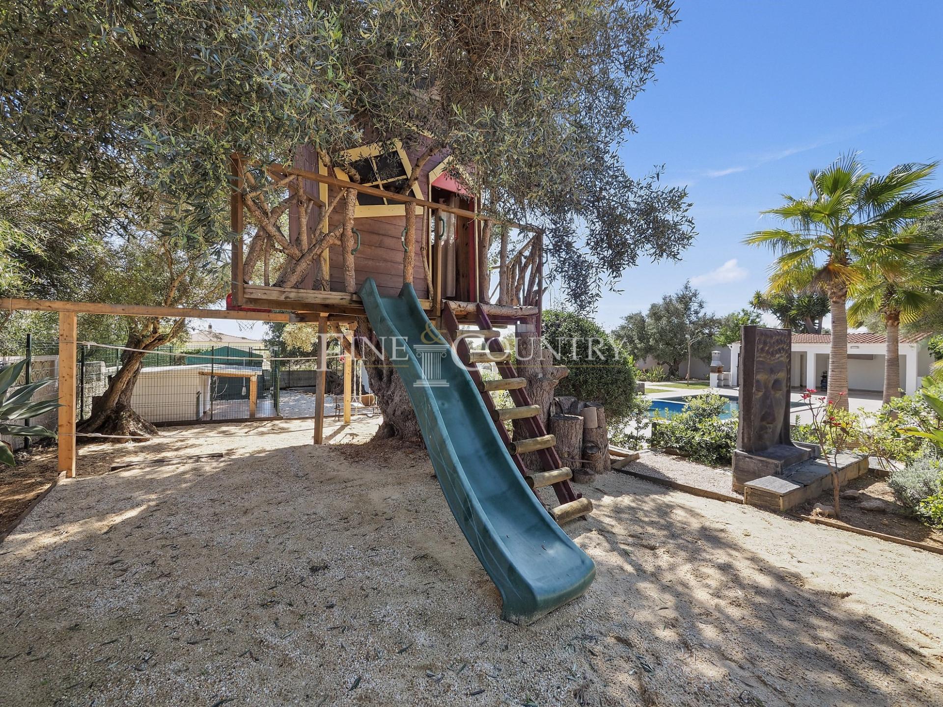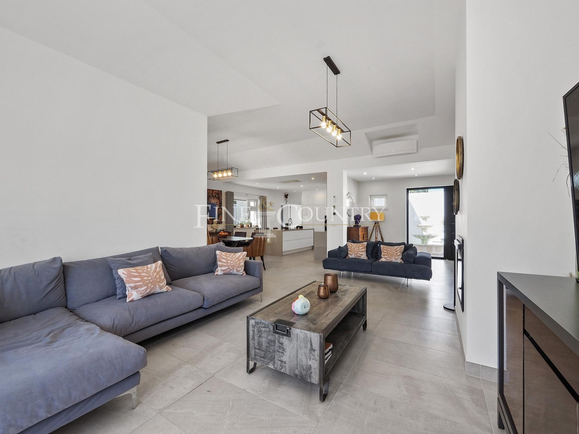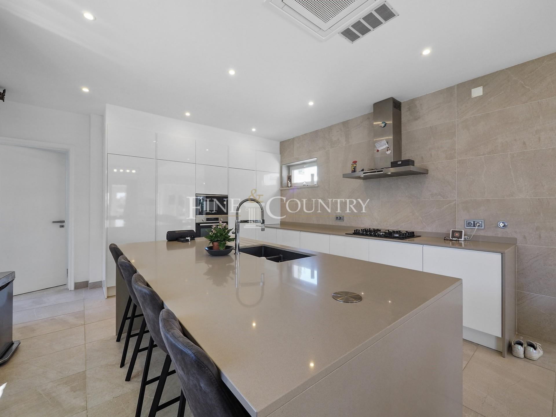 The outdoor entertainment space is magnificent with an outdoor kitchen and BBQ area, kids playground and a Pétanque pitch, which is in the shade of a carob tree. The property has four double bedrooms all en-suite, a large living dining area and a modern open-plan kitchen with larder and utility area. Entrance to the villa is via stylish courtyard with a fountain. The property also features underfloor heating/cooling, a small studio guesthouse, ideal for visiting family and friends, large outdoor kitchen and built in bbq area. Located just a short dive to the international schools and the beaches.