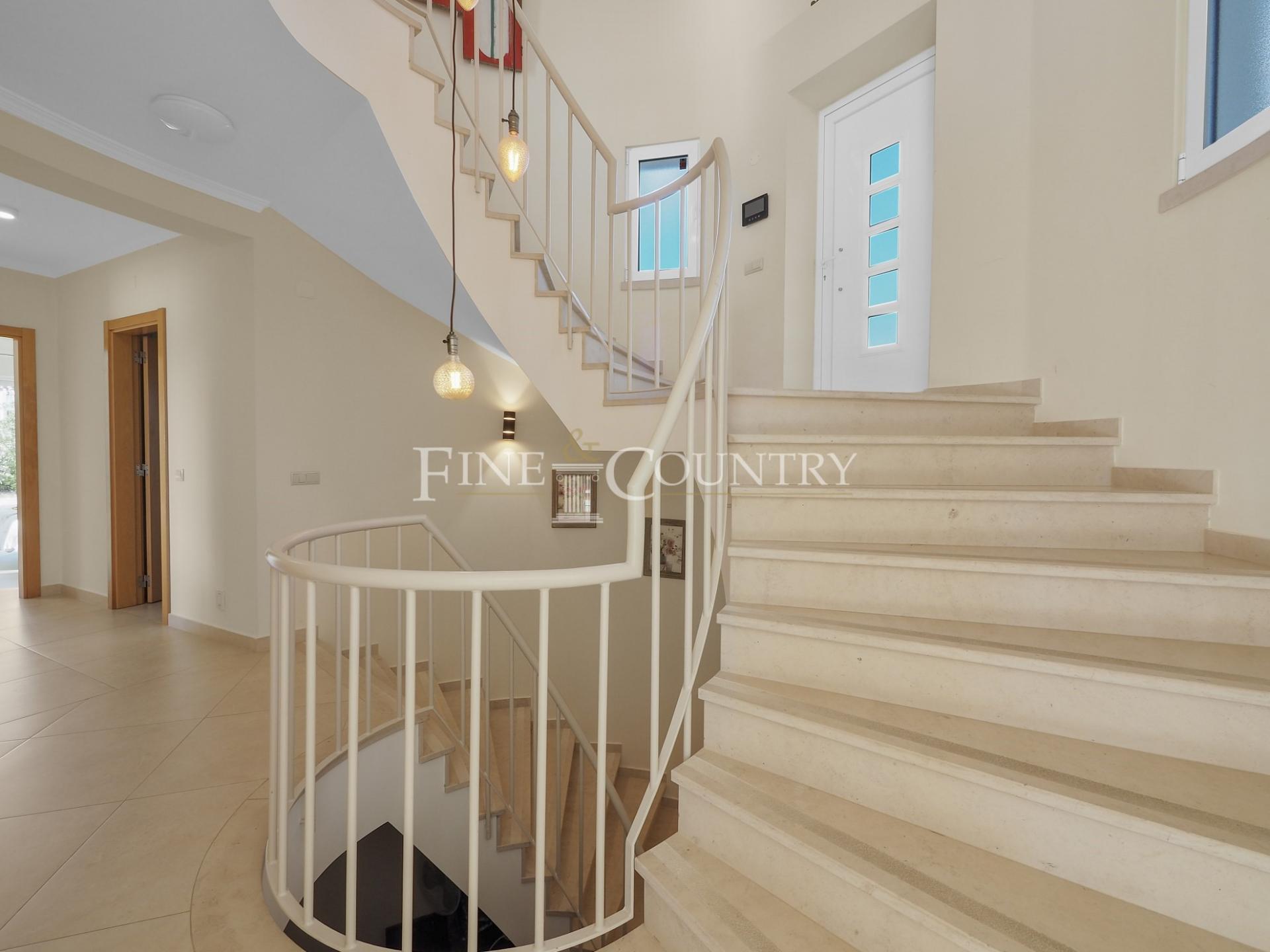 No piso inferior encontram-se mais 3 quartos, 2 dos quais em suite, todos com acesso direto à zona da piscina e ao jardim de fácil manutenção que rodeia a casa. A praticidade estende-se à cave, que alberga ampla garagem dupla e extenso espaço para arrumos, área técnica e lavandaria.