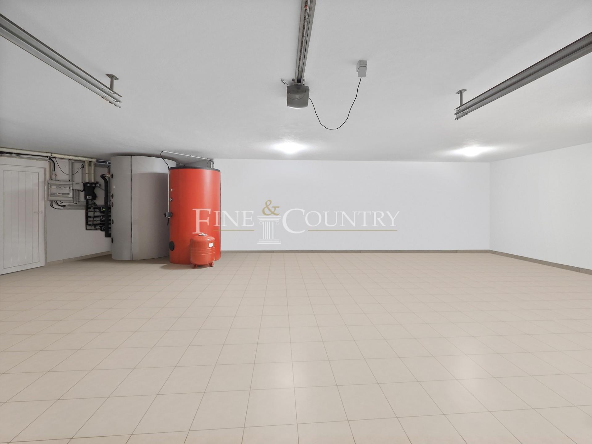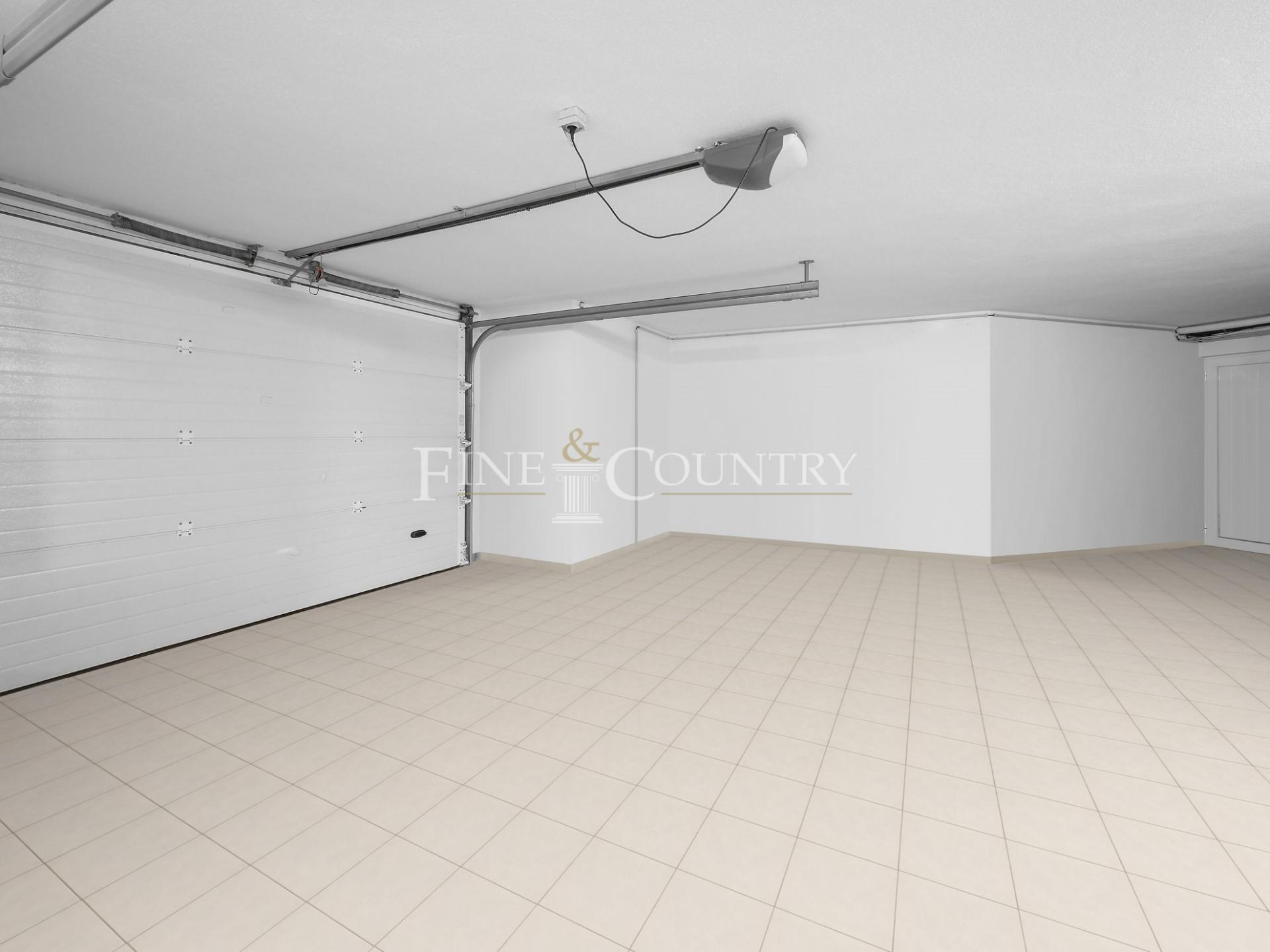 On the lower level, there are 3 more bedrooms, two of which are en-suite, all with direct access to the pool area and the easy-to-maintain garden that surrounds the home. Practicality extends to the basement, which houses a sizable double garage and ample space for storage, technical needs, and laundry facilities.