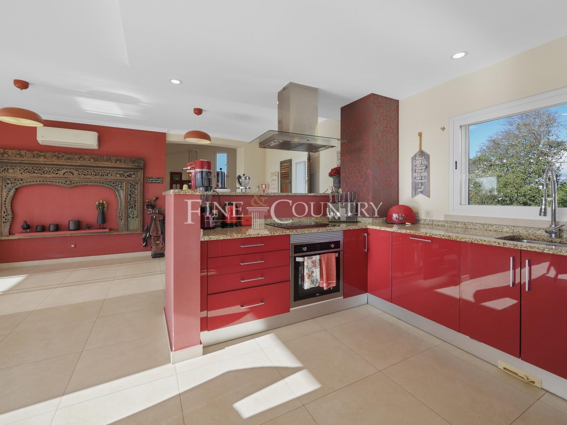 The villa is set on a 770 m² south facing plot, providing sea views. It's designed with modern living in mind, featuring a main bedroom with an en-suite on the upper level — the same floor as the fully equipped kitchen and dining area. This level also includes a large terrace overlooking the coast and the distant sea views, perfect for outdoor dining or simply enjoying the sunset.