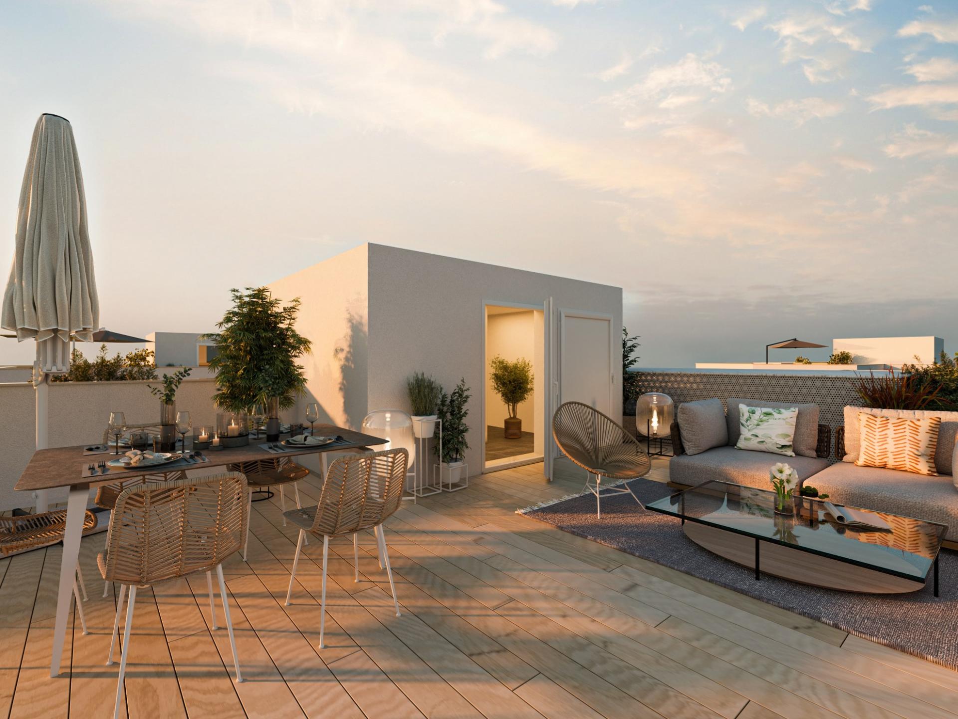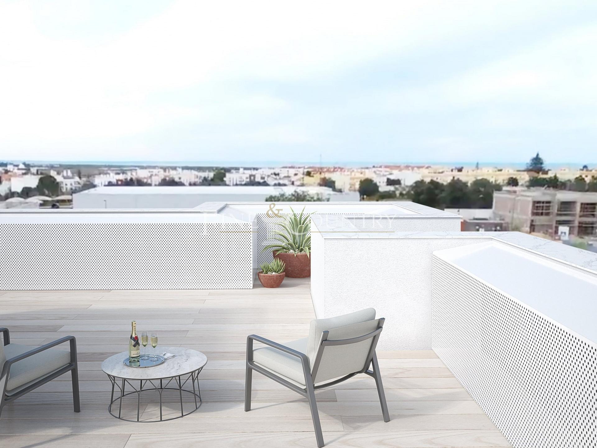 Upstairs, the master suite offers a walk-in closet and en-suite bathroom, while two further bedrooms share a well-appointed bathroom, each with access to private balconies perfect for enjoying the Algarve sun. A panoramic lift leads to the expansive rooftop terrace, where breathtaking views over Tavira and the coastline provide a stunning backdrop for outdoor lounging and entertainment.